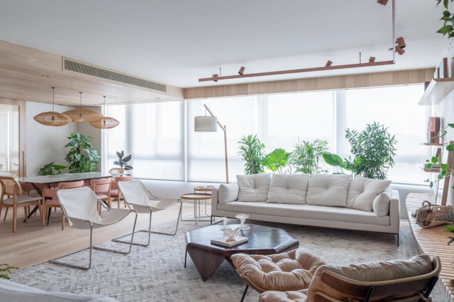 Ah! E uma dica de ouro é investir em tapetes para deixar cada espaço com uma característica própria, apesar da integração. Eles também são uma ótima opção caso o apartamento tenha diferentes pisos por cômodo, fazendo a interligação.