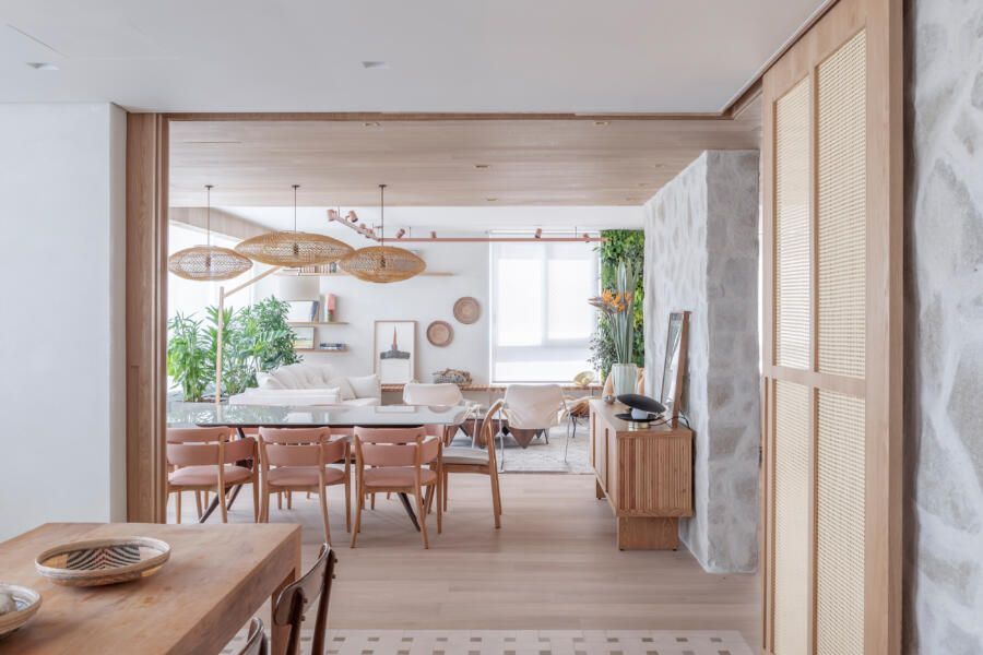 Neste outro projeto, da Helô Marques Arquitetura, a planta tem 260m² e sua cozinha é integrada ao living e sala de jantar. Além disso, o apartamento ainda possui suíte master integrada a biblioteca. Aqui, a arquiteta optou por colocar um piso diferente na cozinha para diferenciá-la. Já para o quarto, uma porta de correr foi a solução para integrar ambientes sem perder privacidade.