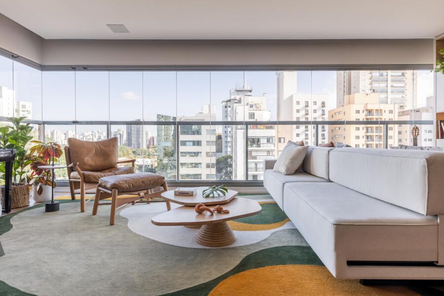 Agora que já vimos algumas soluções de decoração para criar ambientes integrados, deixo aqui alguns projetos que com certeza irão te inspirar. Este primeiro, da Si Saccab Arquitetura, tem 95m² e um living todo integrado: varanda, sala e cozinha sem barreira alguma. Repare só em como ela usa tapetes e revestimentos para reforçar a integração.