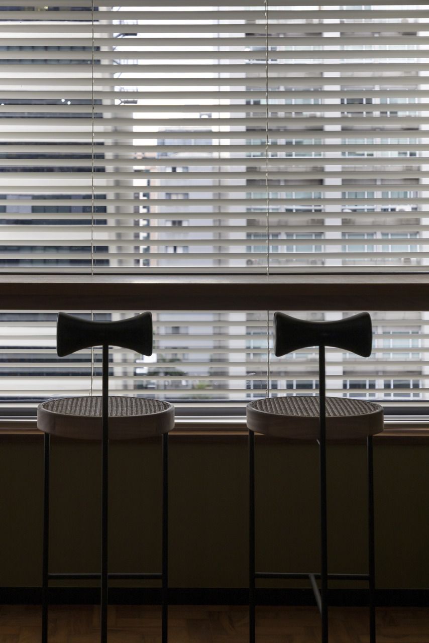 A cozinha é, sem dúvida, um dos grandes destaques do apê. Com uma estética industrial e moderna, ela aposta no cimento e no granito para criar um visual quase brutalista, marcado também pelas vigas aparentes. O resultado é um espaço prático, funcional e elegante — daqueles que funcionam muito bem no dia a dia, mas não abrem mão de impacto visual. Ali, um quadro com uma fotografia do Pelé em um momento importante de apoio ao movimento Diretas Já adiciona uma camada simbólica e potente ao ambiente. Na sala, além do mobiliário bem escolhido, a vista para a Avenida Paulista rouba a cena. É aquele tipo de paisagem urbana que muda ao longo do dia e dialoga diretamente com a proposta contemporânea do projeto. Já o quarto traz um clima mais minimalista e se integra parcialmente à área social. Edu conta que esse ambiente ainda está em desenvolvimento, parte de um processo contínuo de criação, com novas ideias que devem surgir ao longo do tempo.