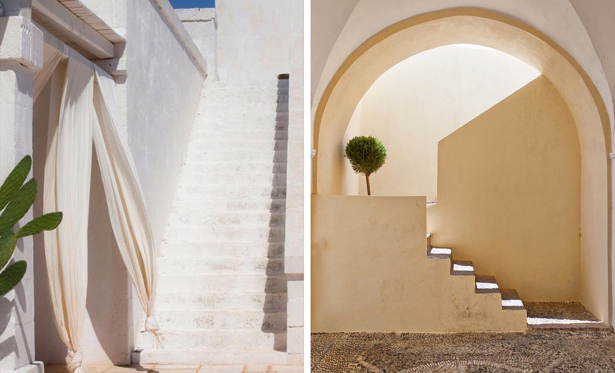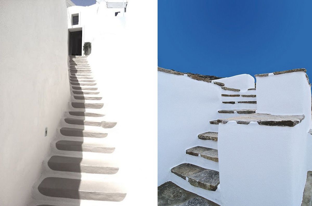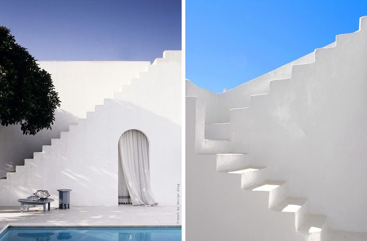 Bem característico do litoral europeu, as casas na Grécia eram construídas em pedras vulcânicas escuras e cal, para isolar melhor o calor, e eram pintadas de branco ou azul. Parede, teto, vãos de portas e janelas eram feitas sempre com o mesmo material e formato, para criar uniformidade na arquitetura, e as escadas consequentemente, seguiam a mesma linguagem. As cidades gregas são, em sua maioria, MUITO inclinadas e o uso das escadas é imprescindível. Então, elas foram construídas para interligar os lugares da maneira mais fácil e barata, e assumem uma estética rústica, limpa e despreocupada – característica bem marcante do país. A Escadaria Santorini é a maior da região, ela foi construída em 1715, com o mesmo propósito, facilitar a mobilidade dos moradores da ilha, e conta com 1300 metros que hoje já viraram atração turística – teria coragem de encarar? hahaha