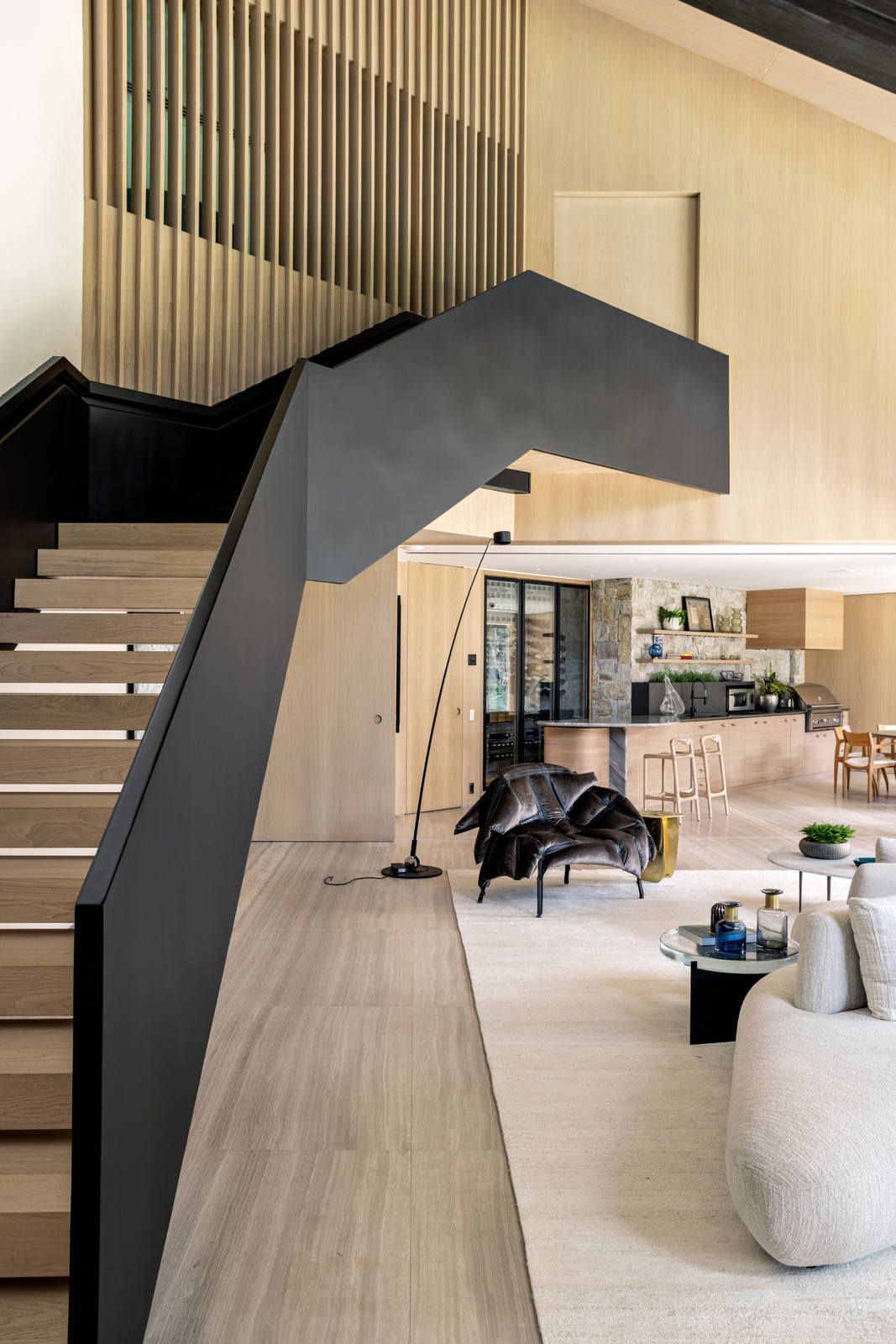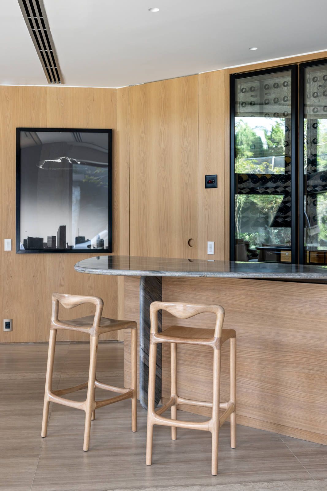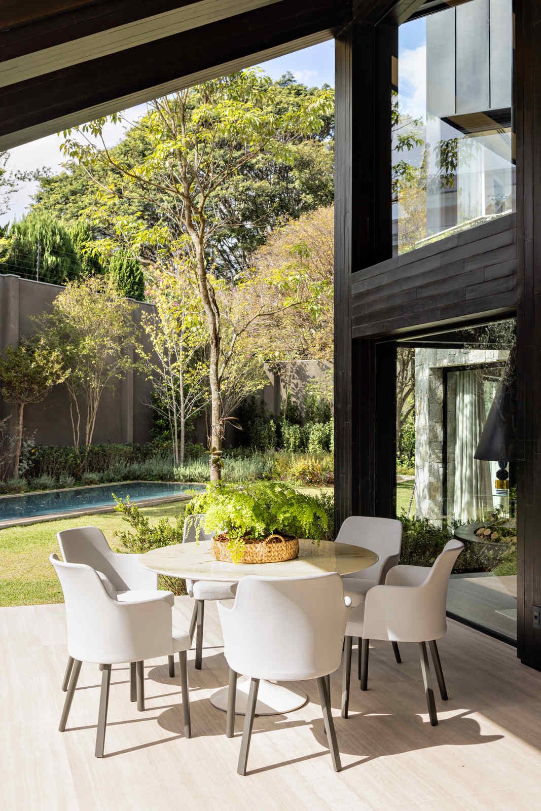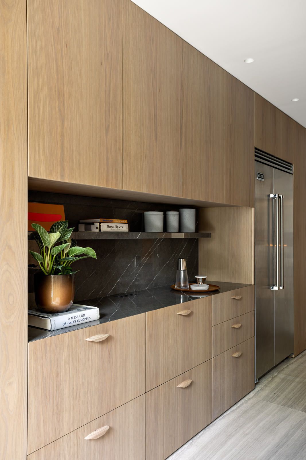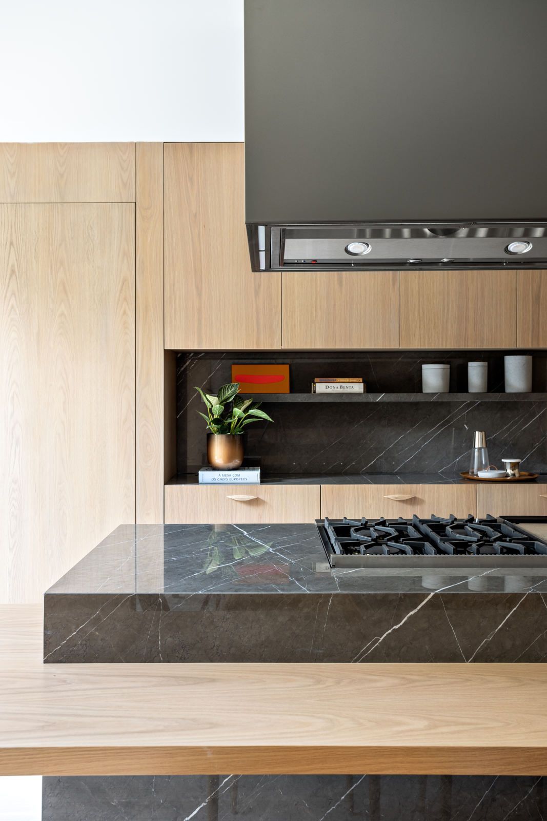 Bia Prado: “Como o conceito foi fazer referência a um chalé, temos bastante madeira em todos os espaços para seguirmos essa linguagem. Foi utilizada madeira ebanizada de preto nas vigas e pilares exatamente para dar esse contraste e destacar essas linhas do projeto. Além disso, o piso em mármore White Wood que dá um clima mais aconchegante.”