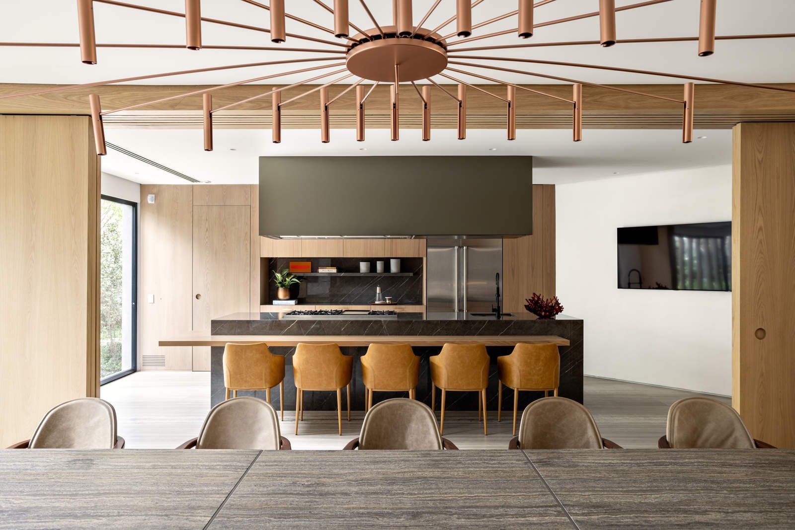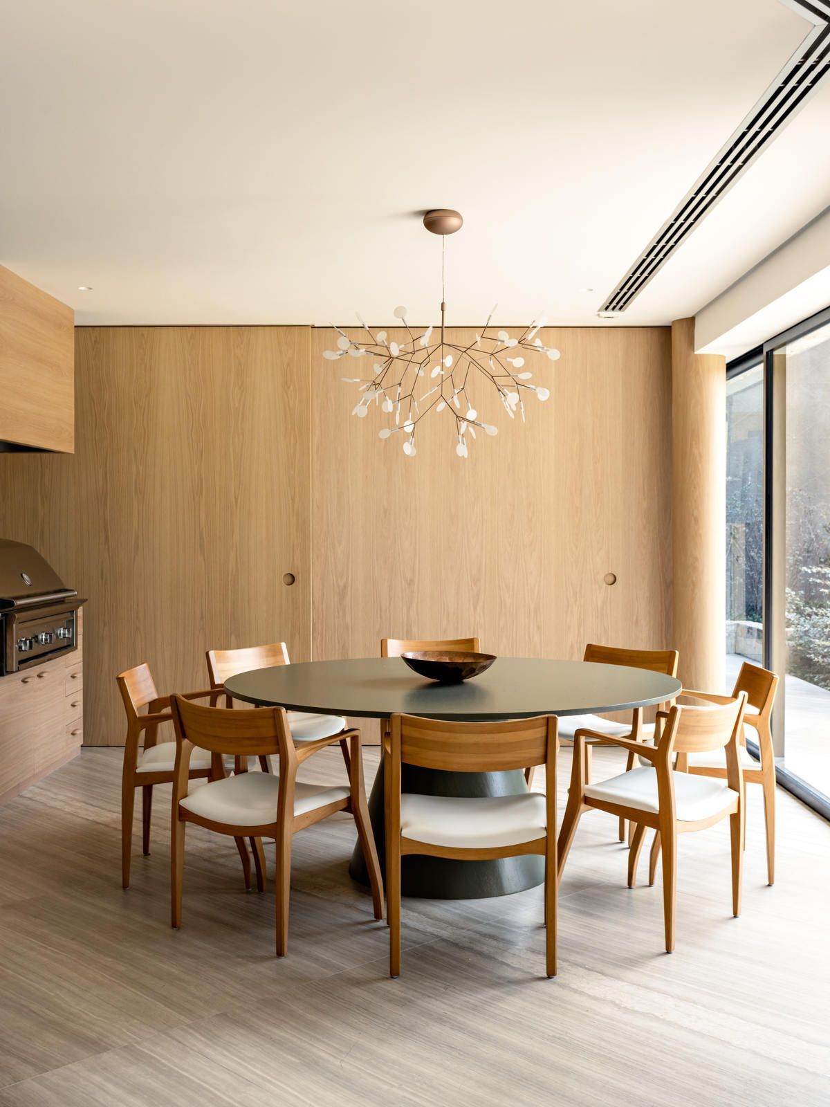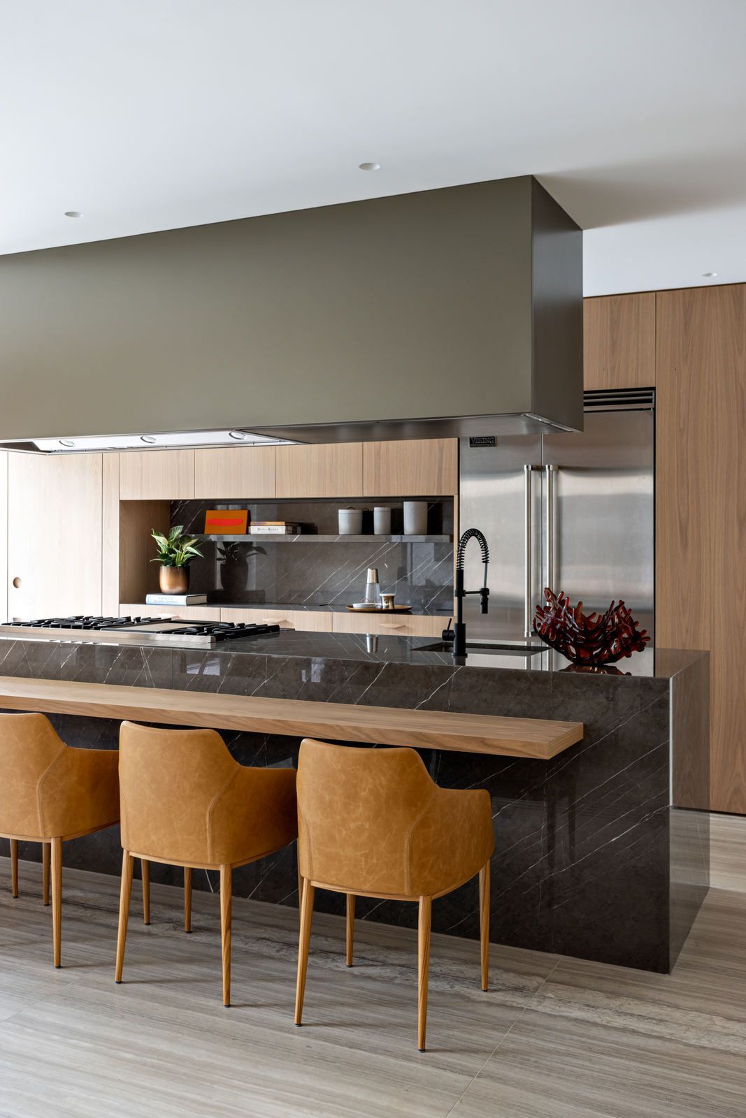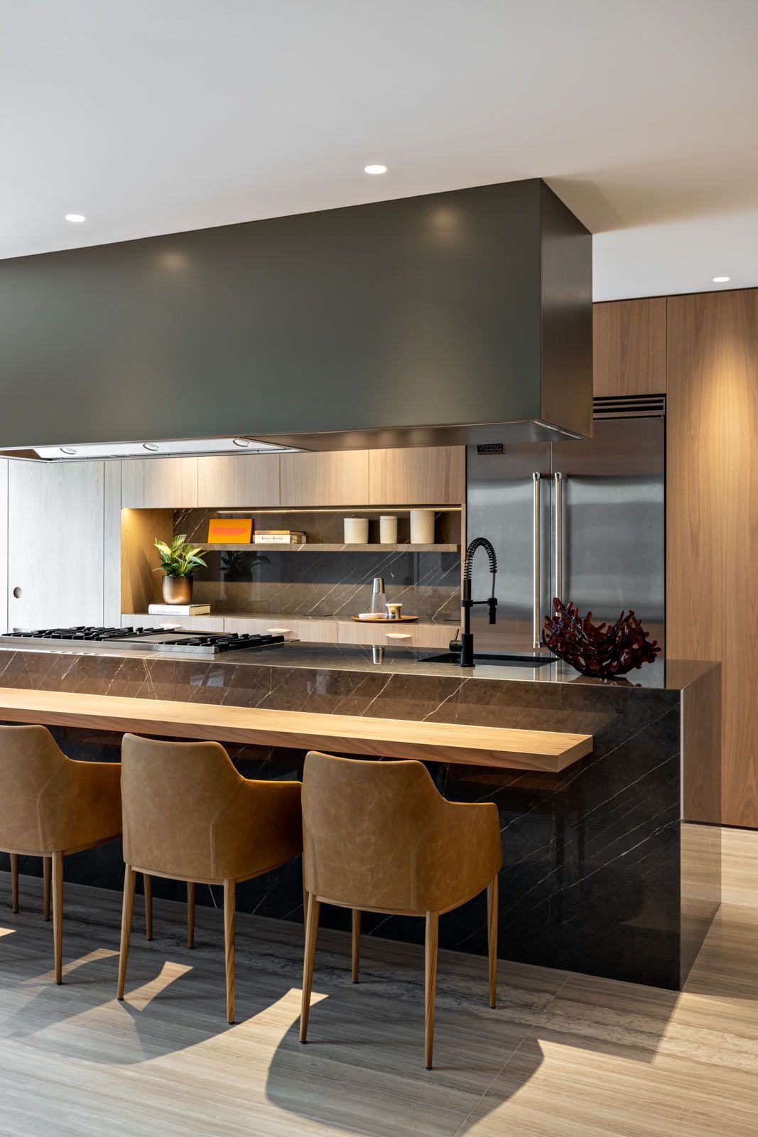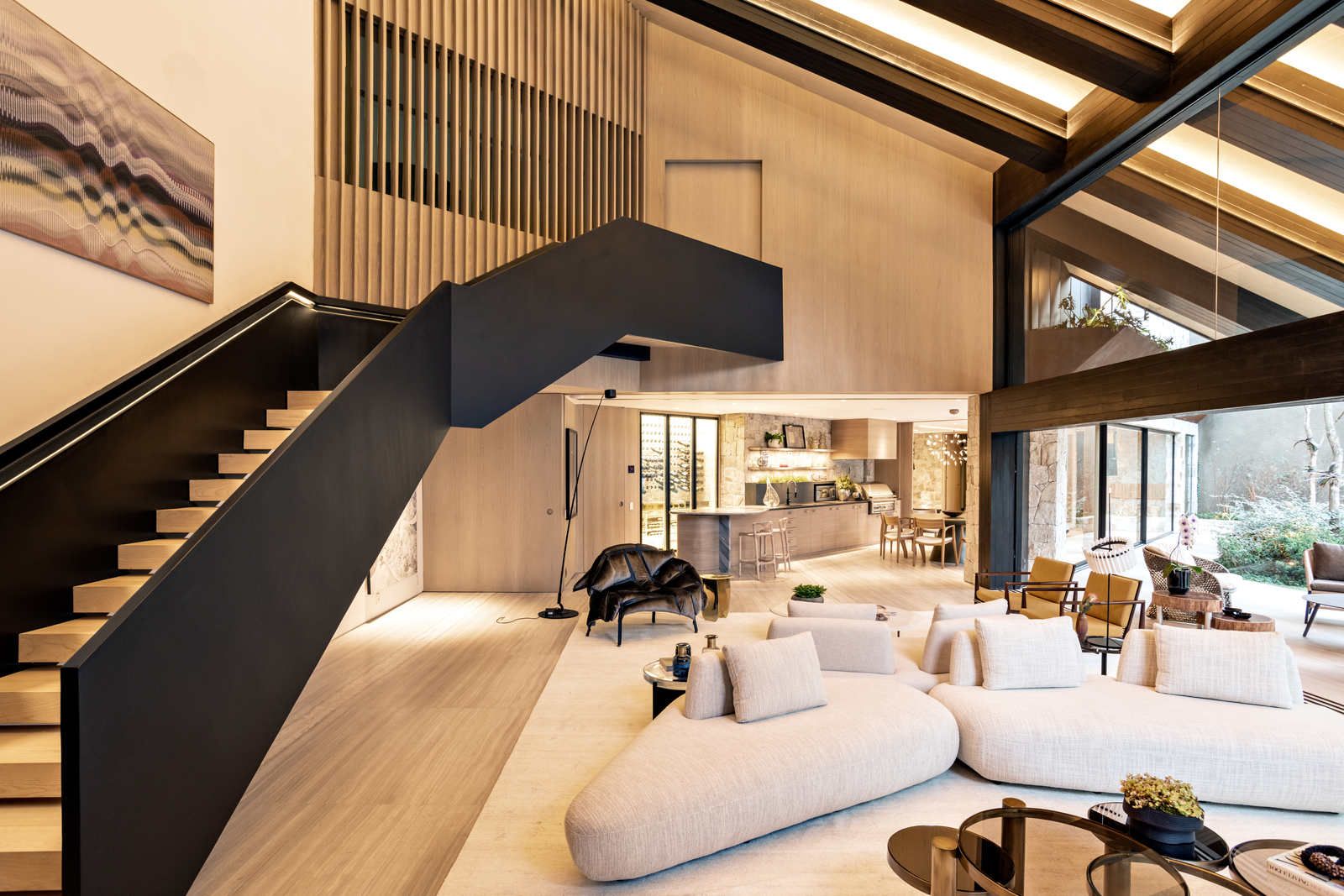 Bia Prado: “Como o conceito foi fazer referência a um chalé, temos bastante madeira em todos os espaços para seguirmos essa linguagem. Foi utilizada madeira ebanizada de preto nas vigas e pilares exatamente para dar esse contraste e destacar essas linhas do projeto. Além disso, o piso em mármore White Wood que dá um clima mais aconchegante.”