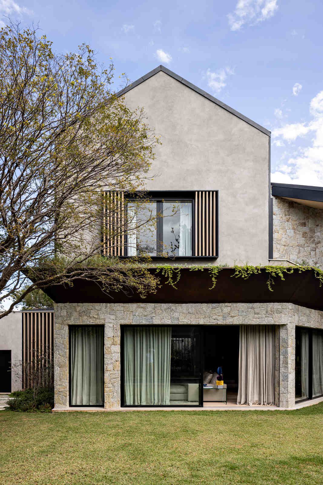 Bia Prado: “Aproveitei justamente esse gosto do proprietário por chalés. Pensando nisso, a única coisa mantida da arquitetura original foi a laje inclinada, com as madeiras aparentes. A partir desse ponto, segui uma linguagem de casa com um toque mais atual, sobretudo pelo mix de materiais nos móveis e revestimentos.”