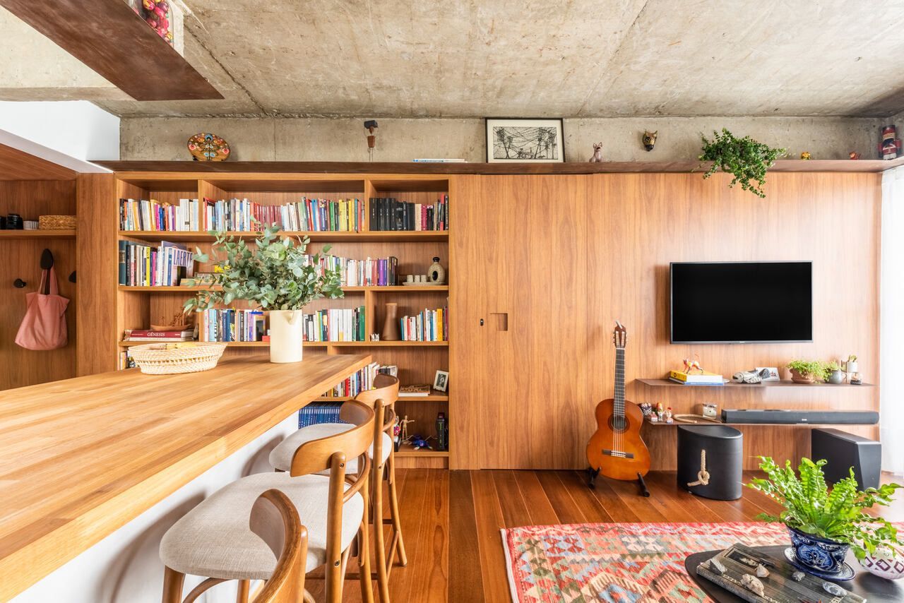 Apesar de toda a história do edifício tombado, os arquitetos Ricardo Melo e Rodrigo Passo toparam o desafio de propor uma renovação completa de um de seus apartamentos, realizando a integração completa entre sala e cozinha e aproveitando ao máximo seus 160m².