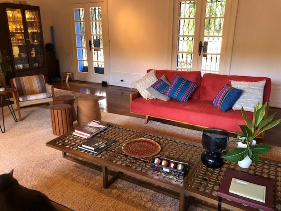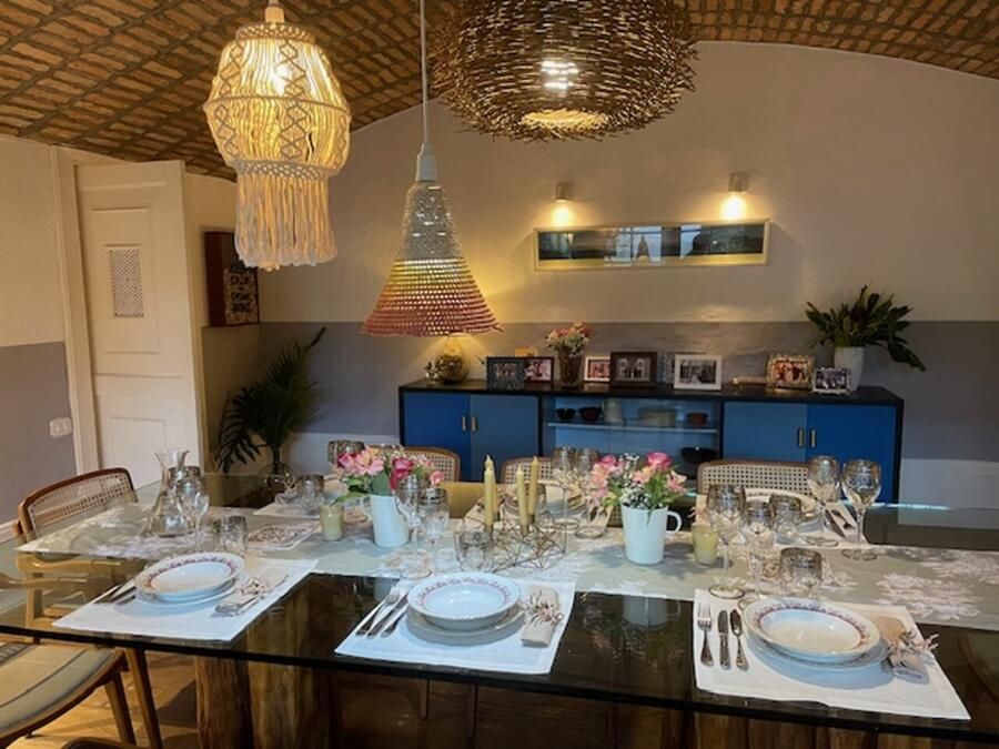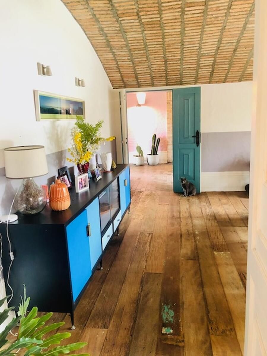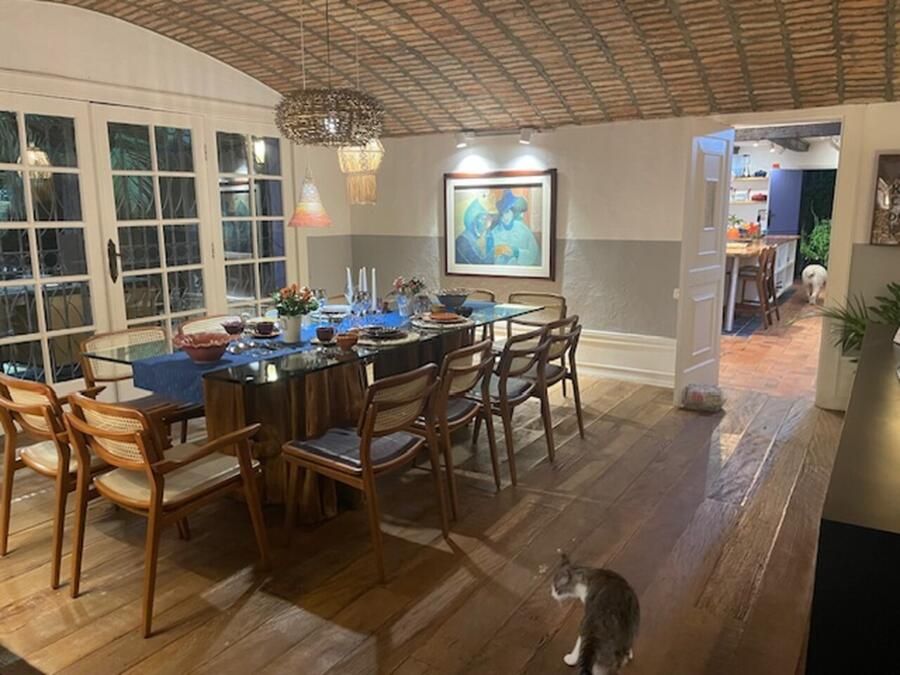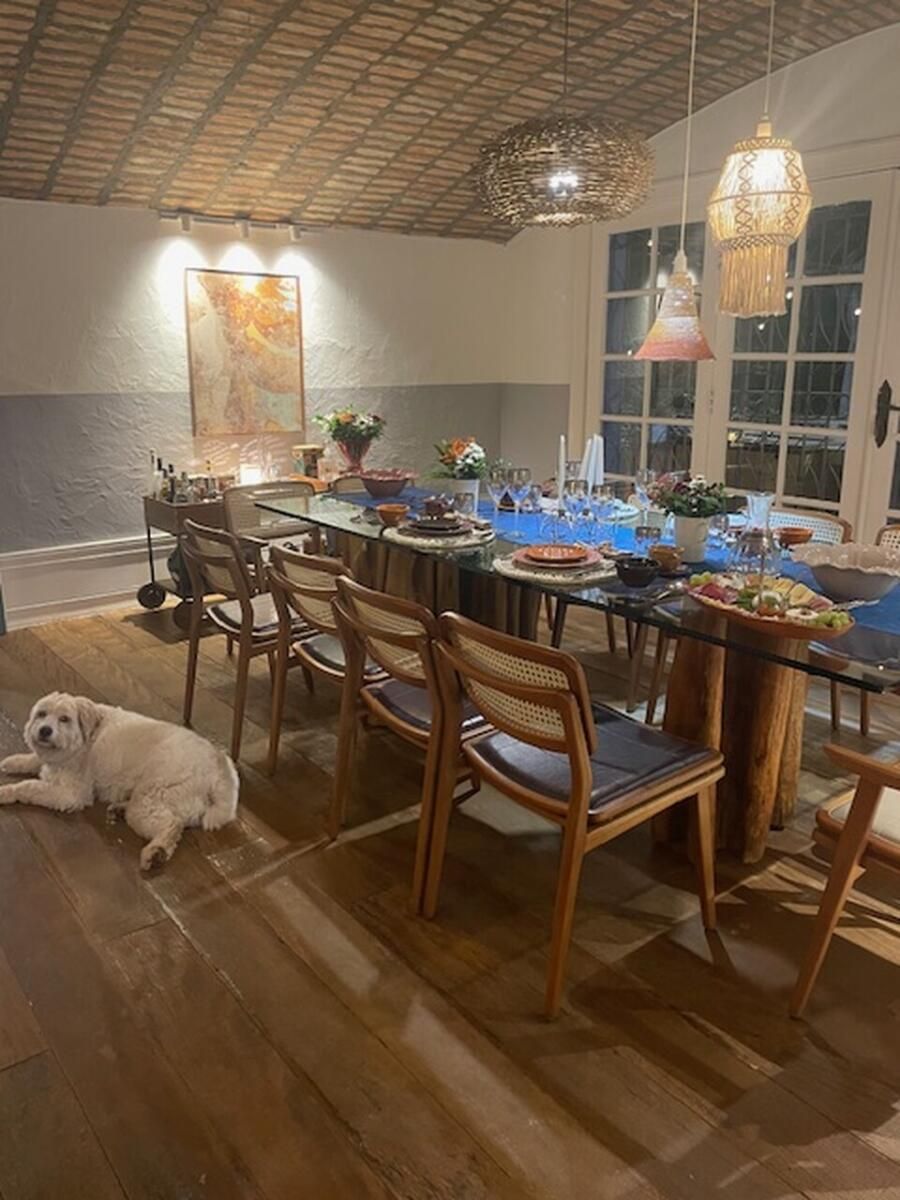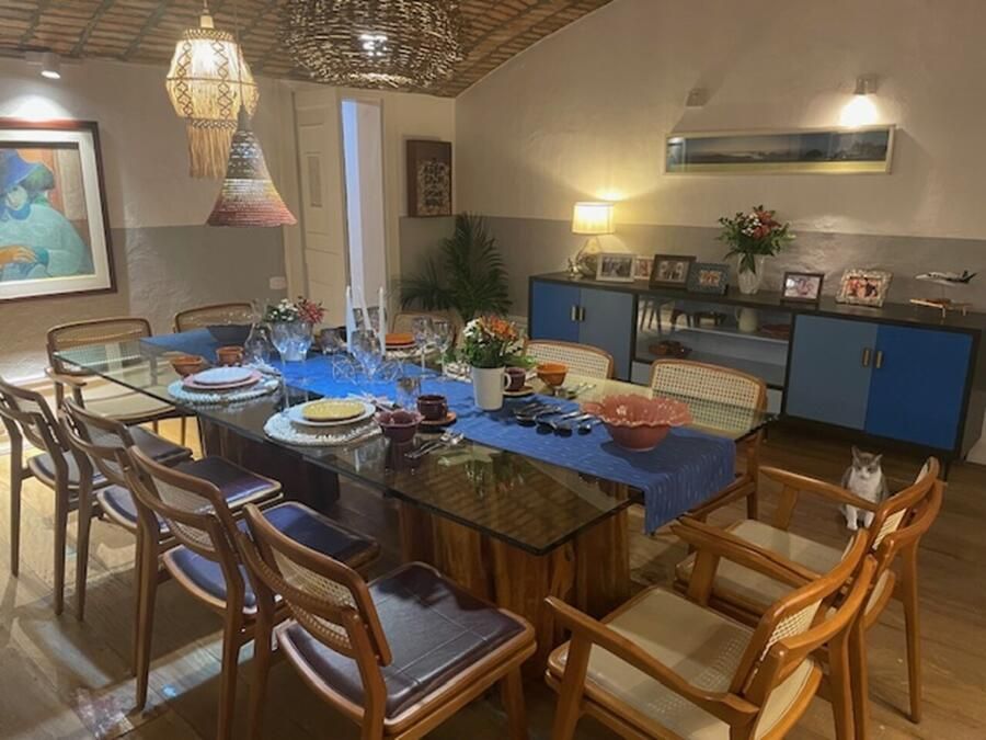 A casa conta com cozinha ampla integrada à copa, sala de jantar, sala de estar com teto abobadado, suíte master com banheiro espaçoso e ateliê pessoal da arquiteta. Esses ambientes se destacam não só pela estética, mas pela funcionalidade e memória afetiva que carregam.