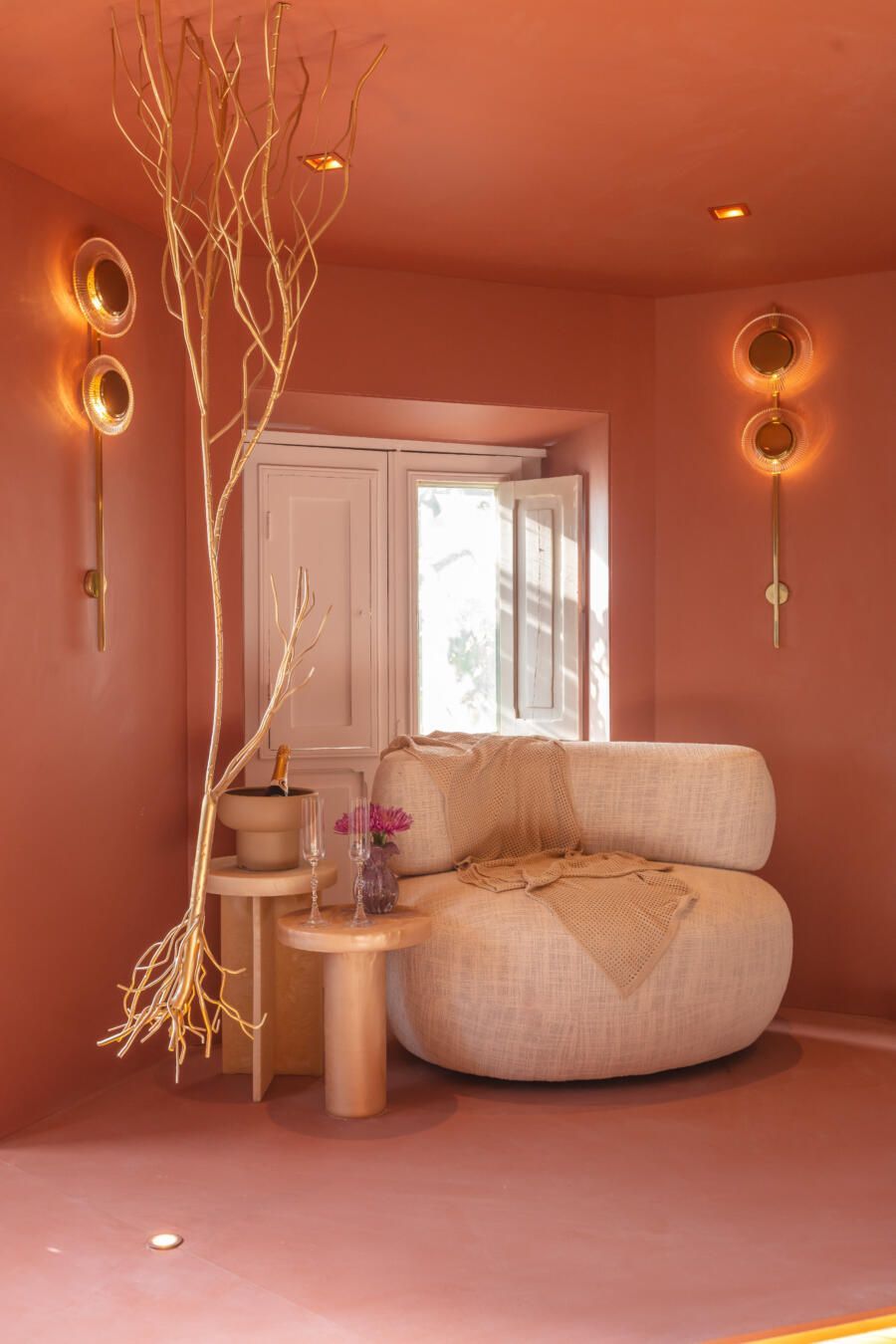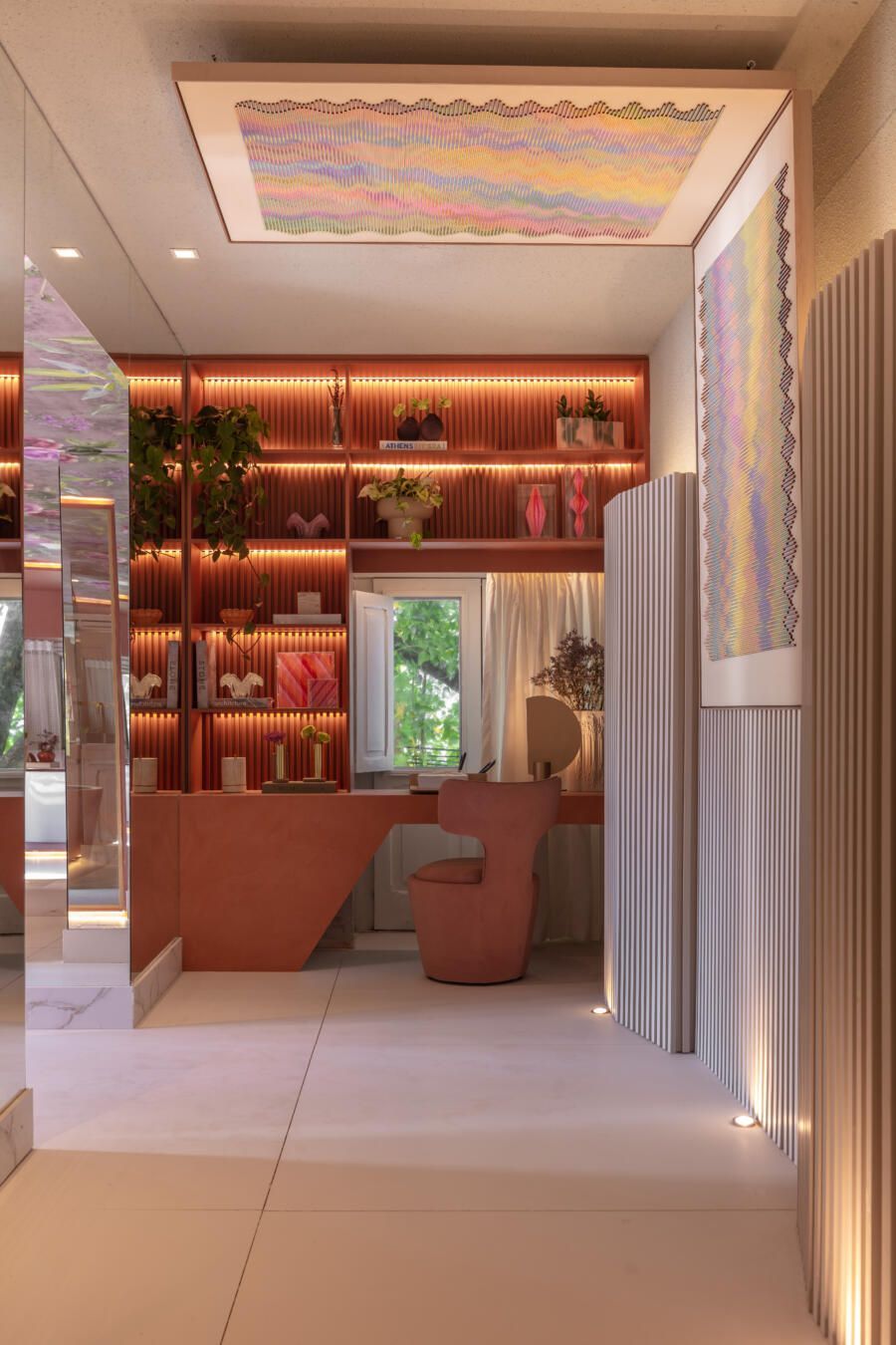 O lançamento Dekton® Umber, parte da nova coleção Kraftizen, foi aplicado na bancada da sala de banho e no escritório, levando o visitante a uma experiência sensorial, onde os cinco sentidos afloram por meio de uma cor poderosa e repleta de volume. Ela é uma homenagem aos mestres artesão e às técnicas que aperfeiçoaram ao longo dos séculos.