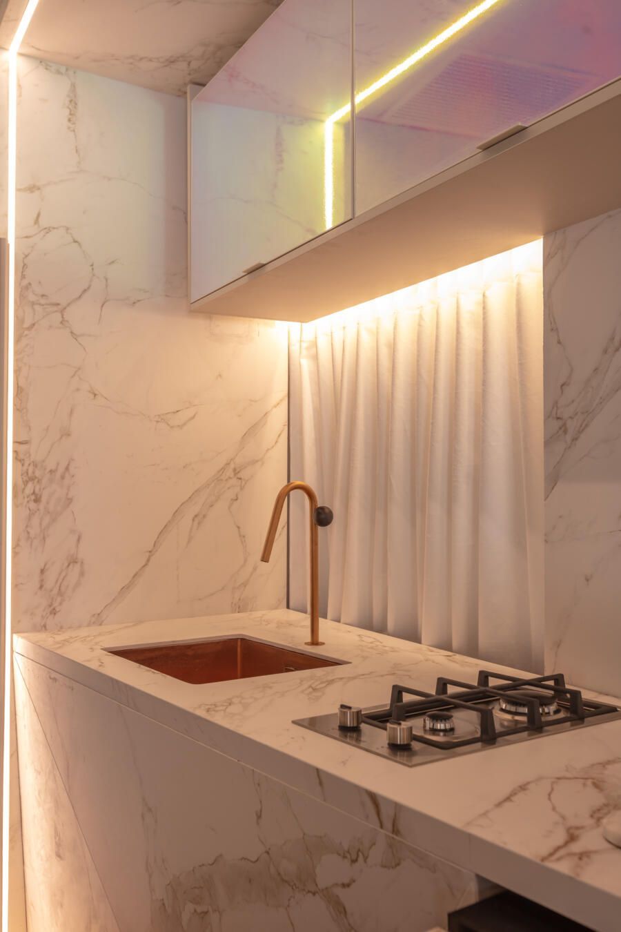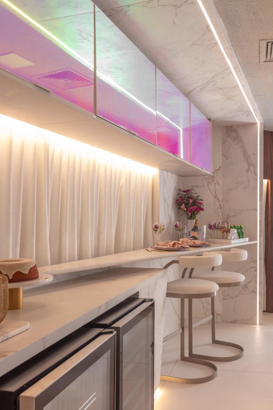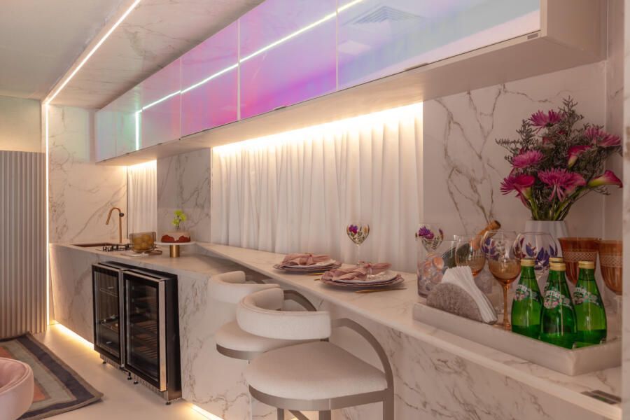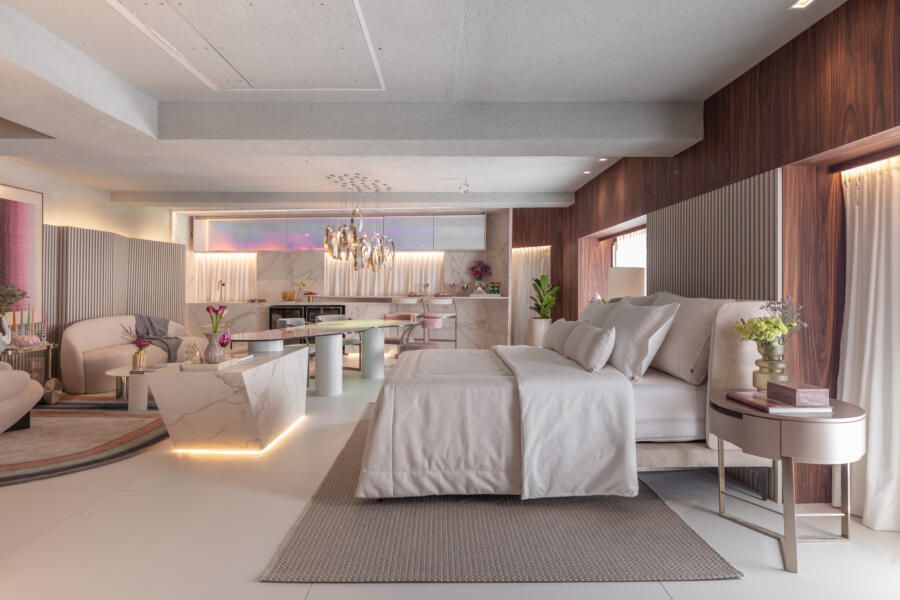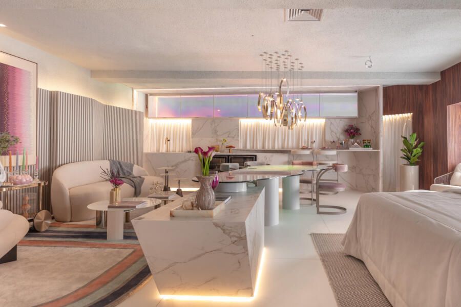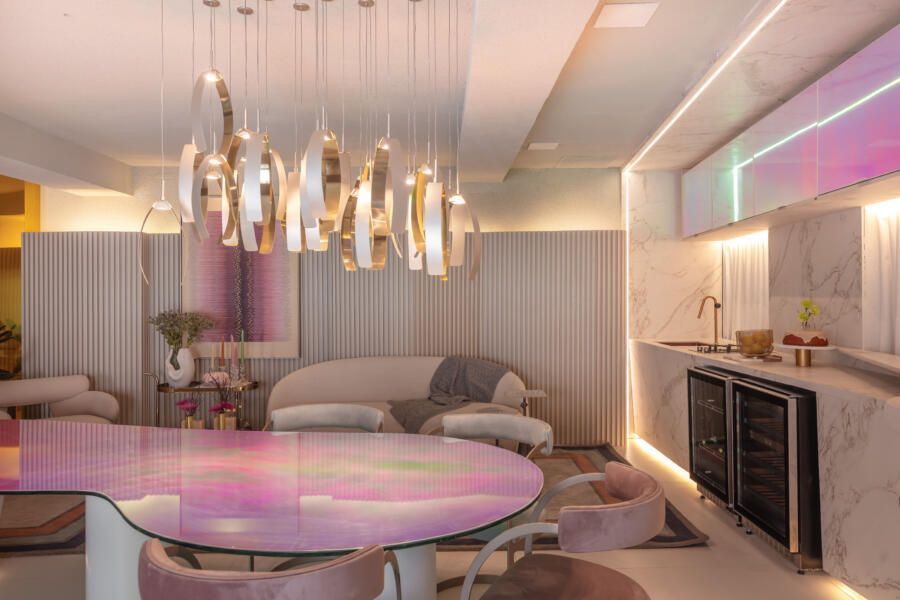 O apartamento integrado, com assinatura das arquitetas Luciana Dias e Mariana Carvalho, do LM Arquitetura, traz a sinergia entre a beleza e sofisticação de Dekton® com a delicadeza do feminino em uma proposta construída apenas por mulheres. No piso, inspirado pelo vidro furta-cor da feira de Milão, a dupla especificou a tonalidade Dekton® Zenith. Já para as bancadas da sala e espaço gourmet, a imponência do Calacatta é fielmente reproduzida pela beleza de Dekton® Entzo em sua versão de 12mm.