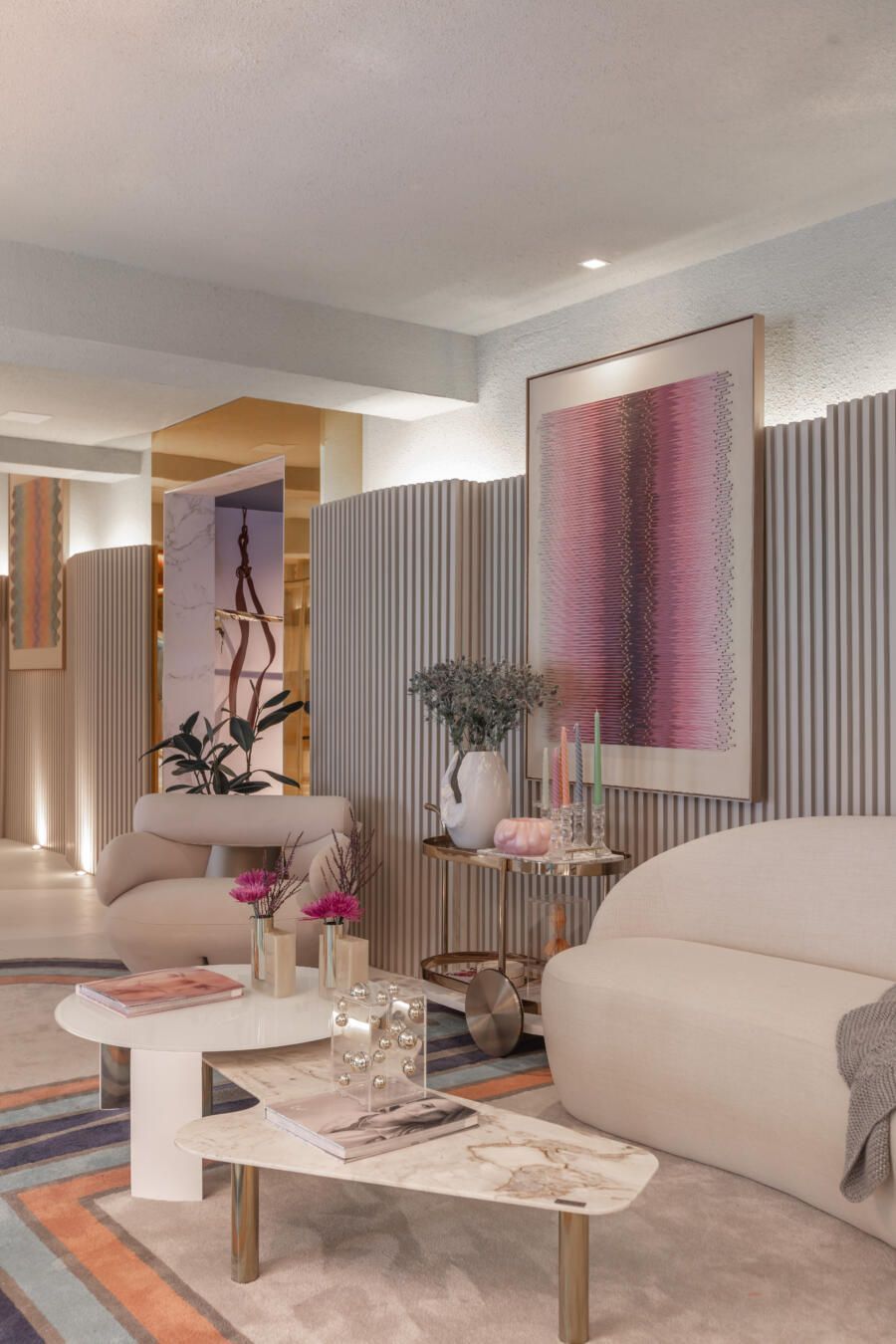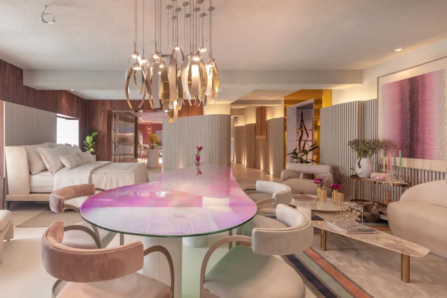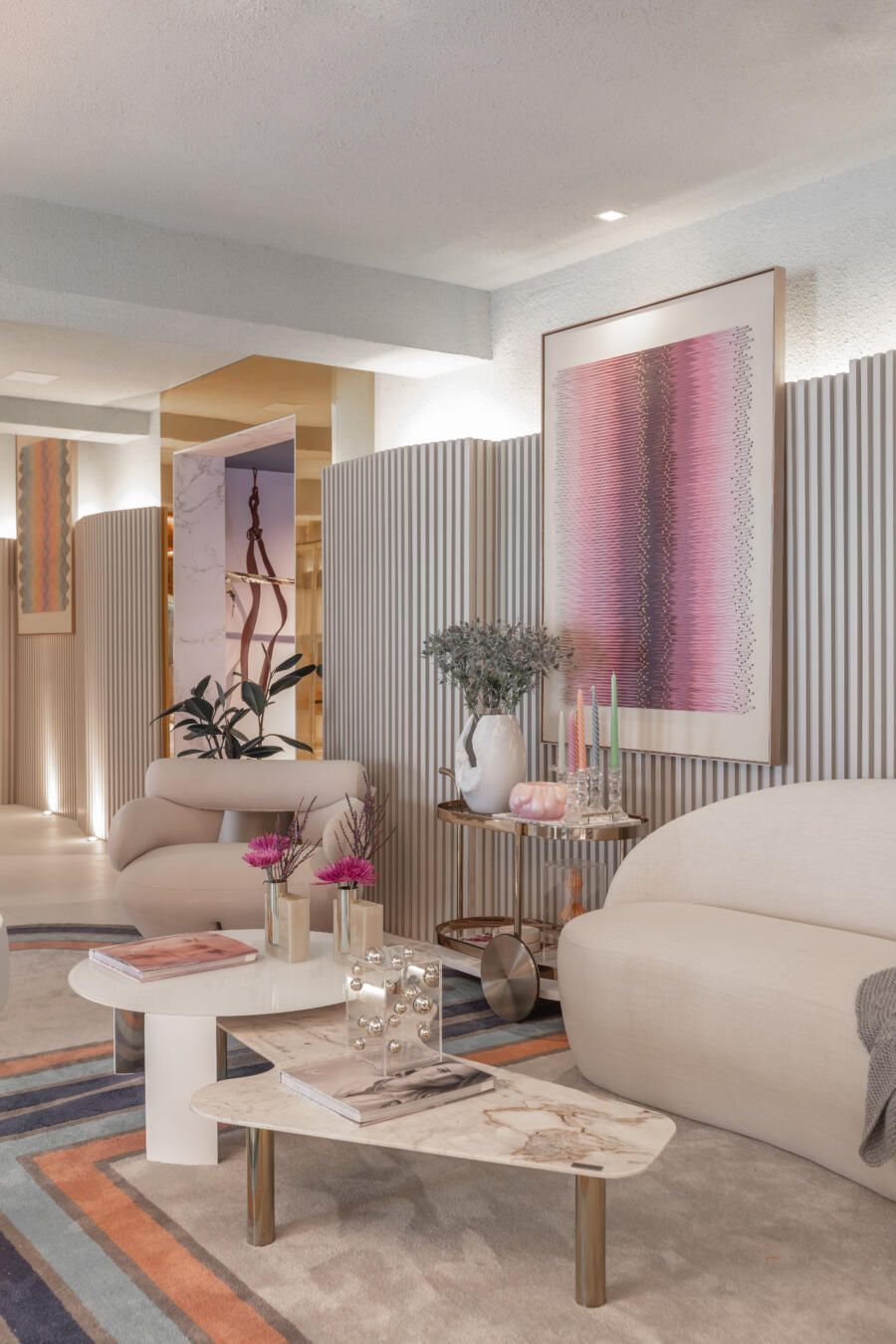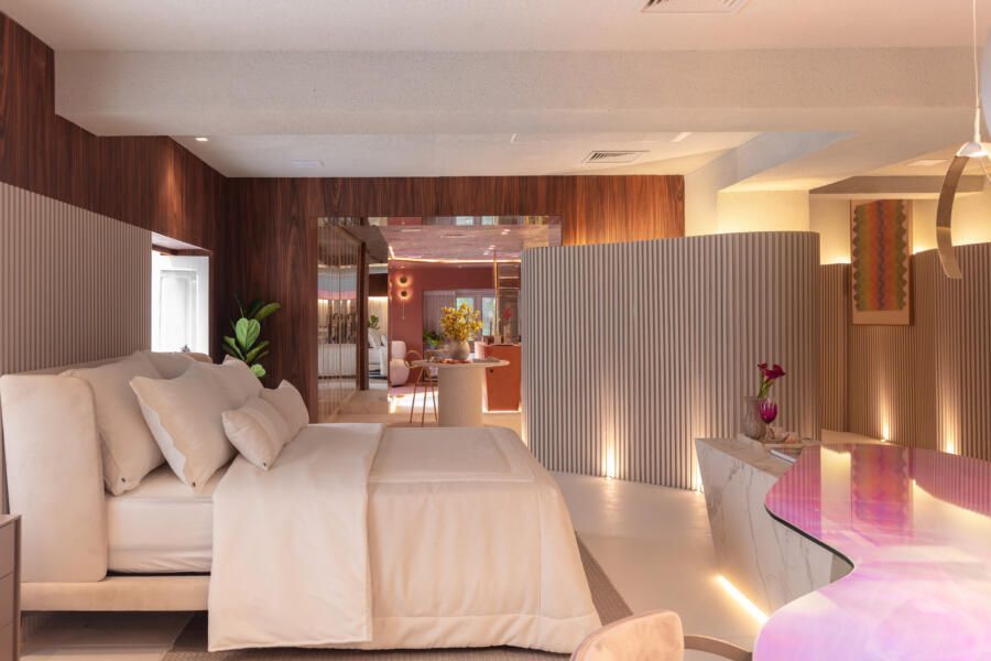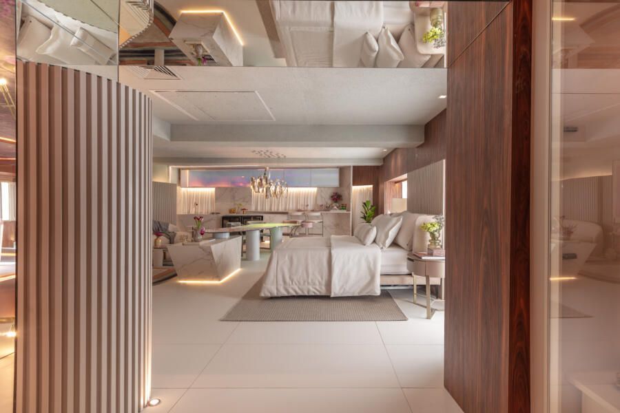O apartamento integrado, com assinatura das arquitetas Luciana Dias e Mariana Carvalho, do LM Arquitetura, traz a sinergia entre a beleza e sofisticação de Dekton® com a delicadeza do feminino em uma proposta construída apenas por mulheres. No piso, inspirado pelo vidro furta-cor da feira de Milão, a dupla especificou a tonalidade Dekton® Zenith. Já para as bancadas da sala e espaço gourmet, a imponência do Calacatta é fielmente reproduzida pela beleza de Dekton® Entzo em sua versão de 12mm.