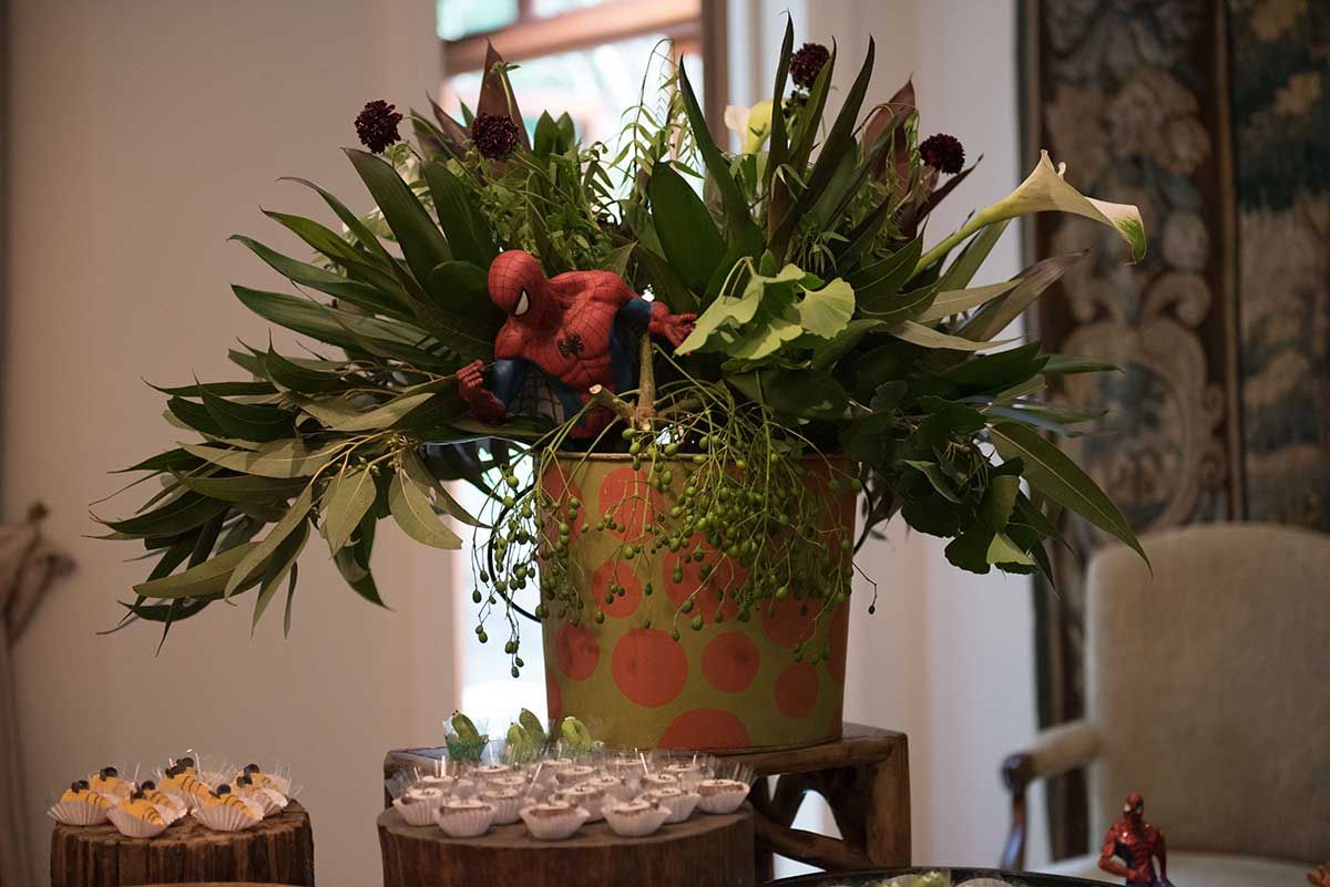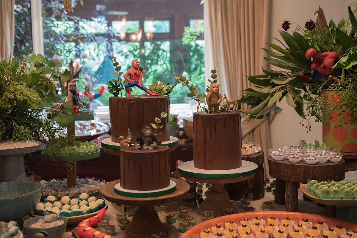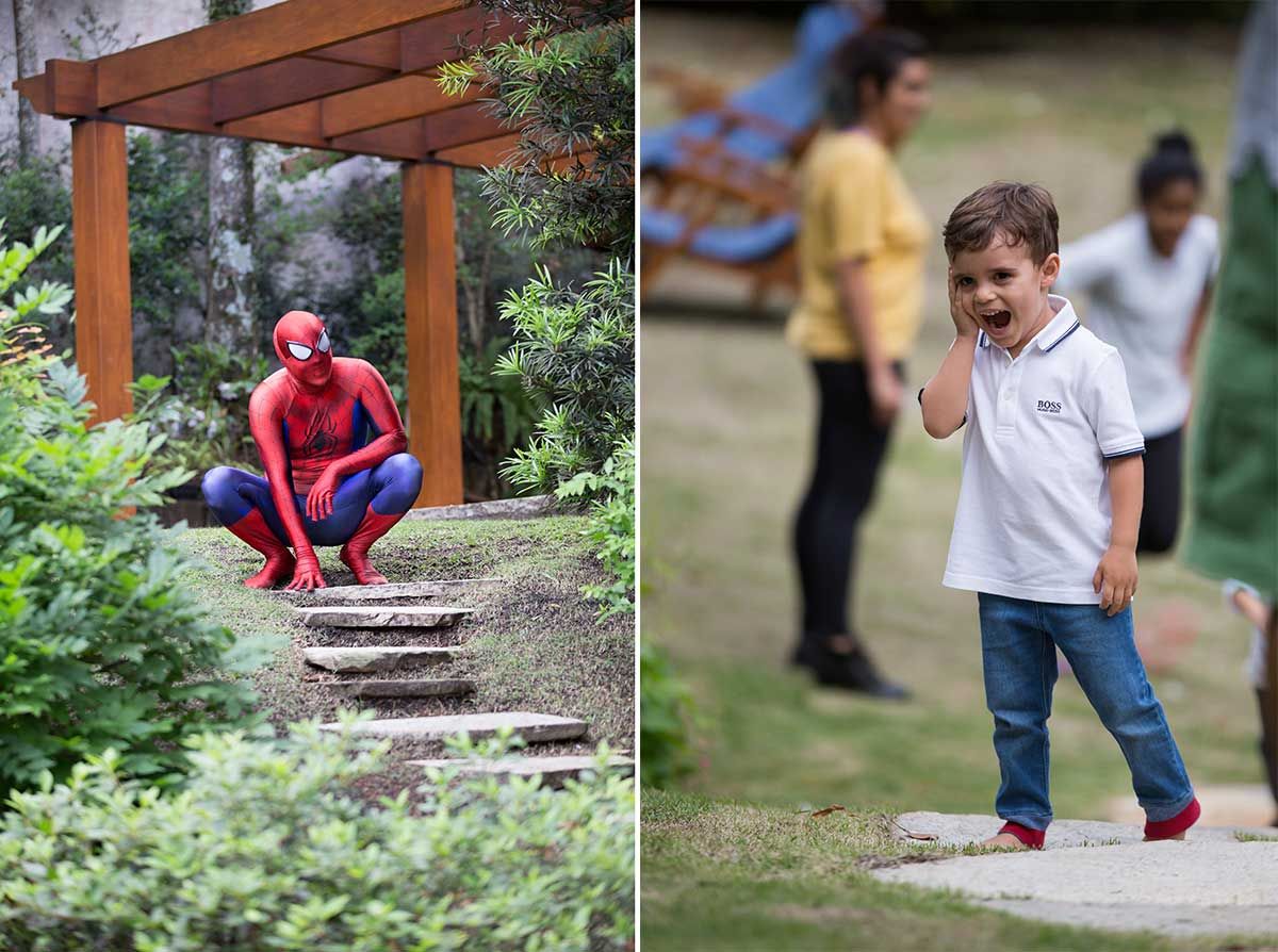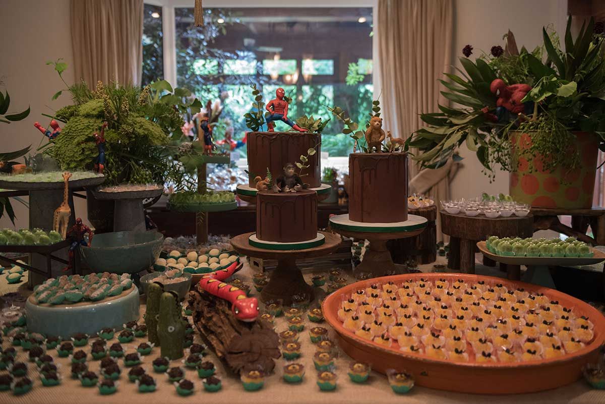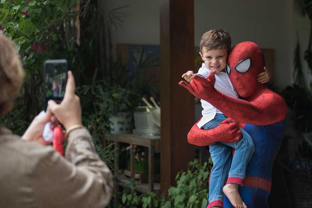 Bom, vamos alinhar o seguinte: eu não curto gritaria nas brincadeiras kkkkk Auto falante então passo beeeeem longe. Então sempre contrato uma recreação bem suave, que brincam com as crianças de brincadeiras a moda antiga (corrida de saco, caça ao tesouro, bambolê, pula corta, bolão, essas coisas…. e sem esteria sabe, sem gritar para chamar as crianças. Os pequenos participam de maneira bem leve e divertida, chama-se Recreart. Chamei também um pula pula e uma cama elástica (aqui vai o contato 94754-0709) e um Homem Aranha que foi o máximo! Passou boa parte da festa com o Bento – viraram amigos – e era uma pessoa super simpática e atenciosa, gostei demais. Contratei na Fabrika de Ilusões.