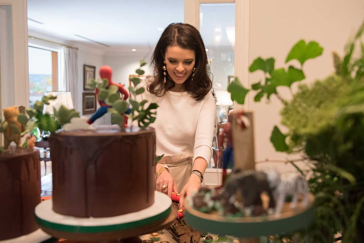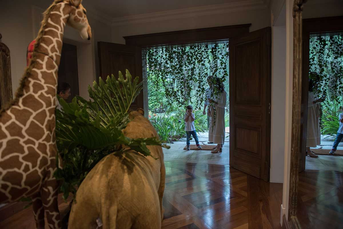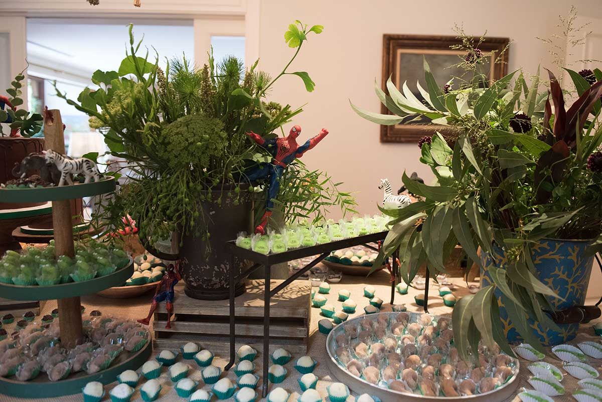Segunda etapa: definir as flores. Queria algo com muito verde e mais wild, lembrei então da Amapá, floricultura que tem bem essa pegada mais solta, com cara de floresta e que me foi apresentada por uma amigo, que é primo da Nina, sócia da Amapá. Foi ótimo trabalhar com elas, mãe e filhas tocam a Amapá e se dedicam de corpo e alma as ideias. Fizemos todos os arranjos da casa, a mesa de doces, o bar e a parede verde da varanda – nessa parede eles colaram as folhas verdes com fita bananinha.
