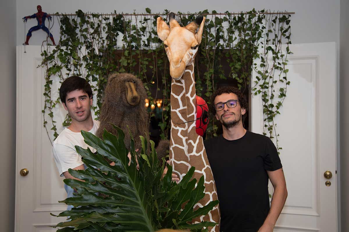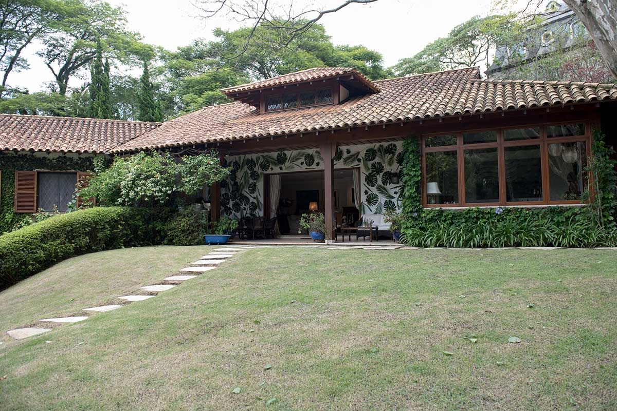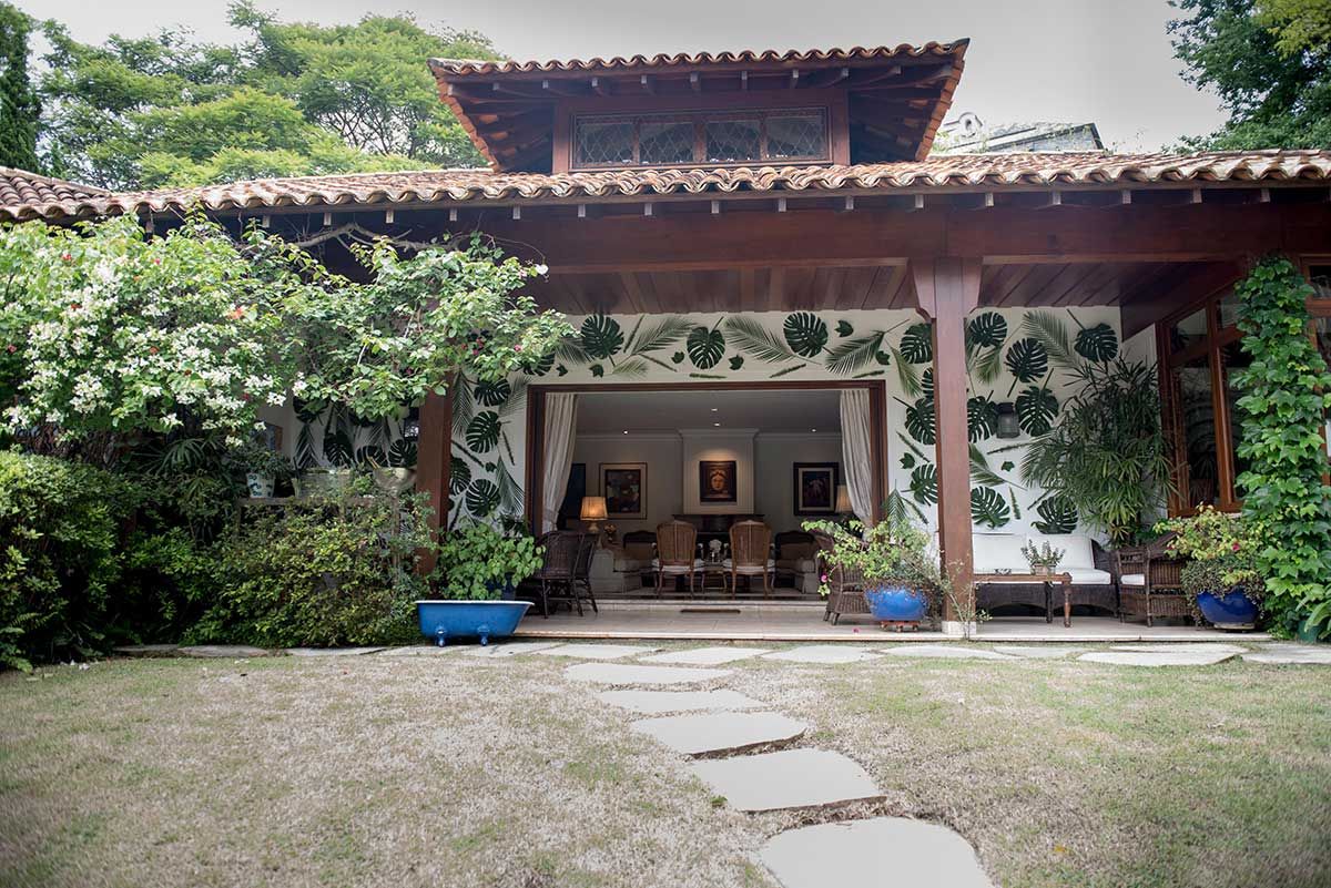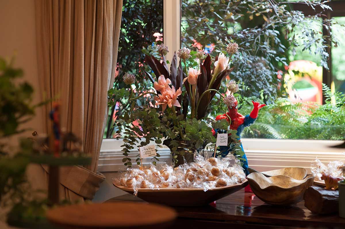 Segunda etapa: definir as flores. Queria algo com muito verde e mais wild, lembrei então da Amapá, floricultura que tem bem essa pegada mais solta, com cara de floresta e que me foi apresentada por uma amigo, que é primo da Nina, sócia da Amapá. Foi ótimo trabalhar com elas, mãe e filhas tocam a Amapá e se dedicam de corpo e alma as ideias. Fizemos todos os arranjos da casa, a mesa de doces, o bar e a parede verde da varanda – nessa parede eles colaram as folhas verdes com fita bananinha.
