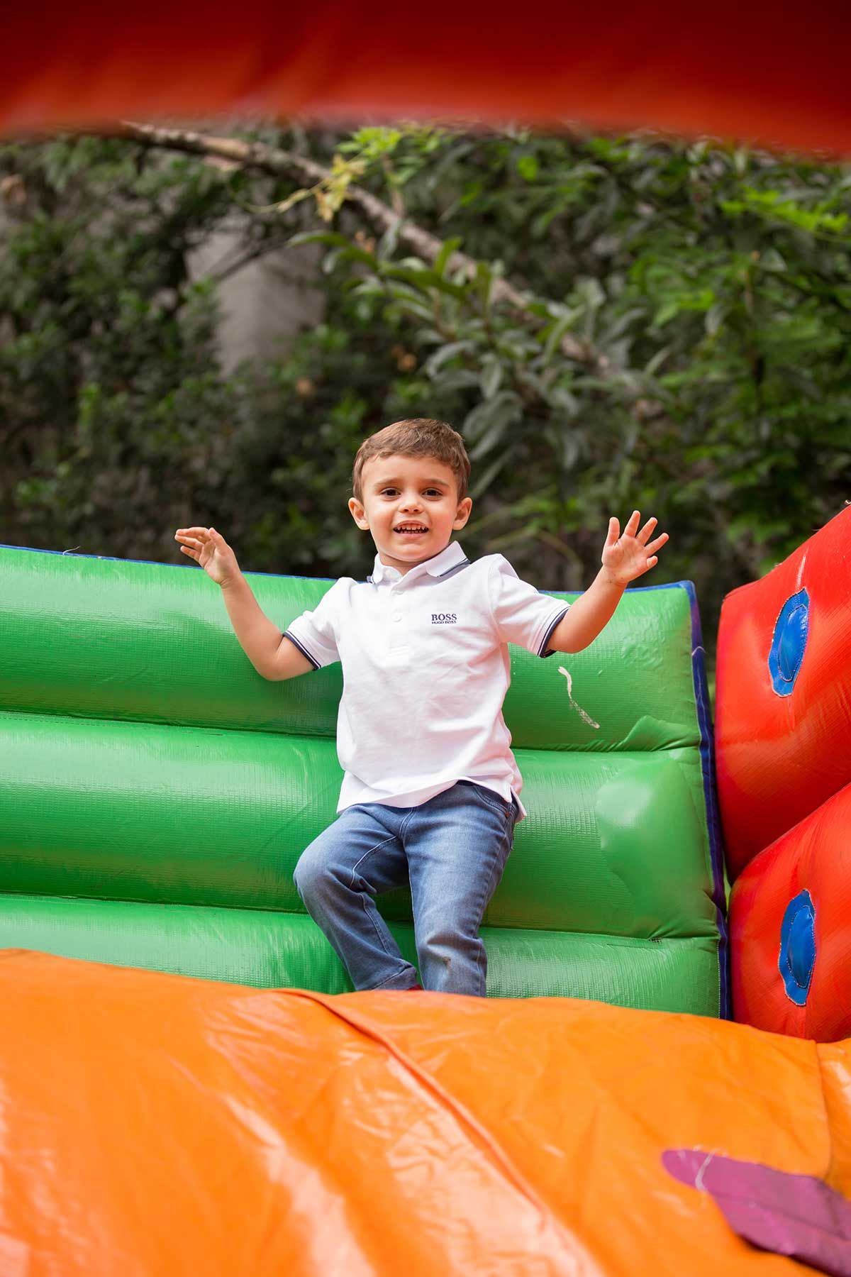 Bom, vamos alinhar o seguinte: eu não curto gritaria nas brincadeiras kkkkk Auto falante então passo beeeeem longe. Então sempre contrato uma recreação bem suave, que brincam com as crianças de brincadeiras a moda antiga (corrida de saco, caça ao tesouro, bambolê, pula corta, bolão, essas coisas…. e sem esteria sabe, sem gritar para chamar as crianças. Os pequenos participam de maneira bem leve e divertida, chama-se Recreart. Chamei também um pula pula e uma cama elástica (aqui vai o contato 94754-0709) e um Homem Aranha que foi o máximo! Passou boa parte da festa com o Bento – viraram amigos – e era uma pessoa super simpática e atenciosa, gostei demais. Contratei na Fabrika de Ilusões.