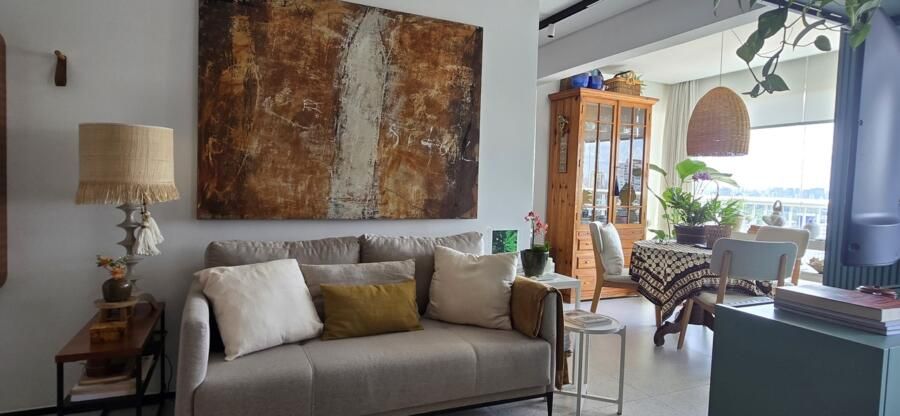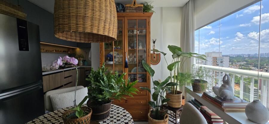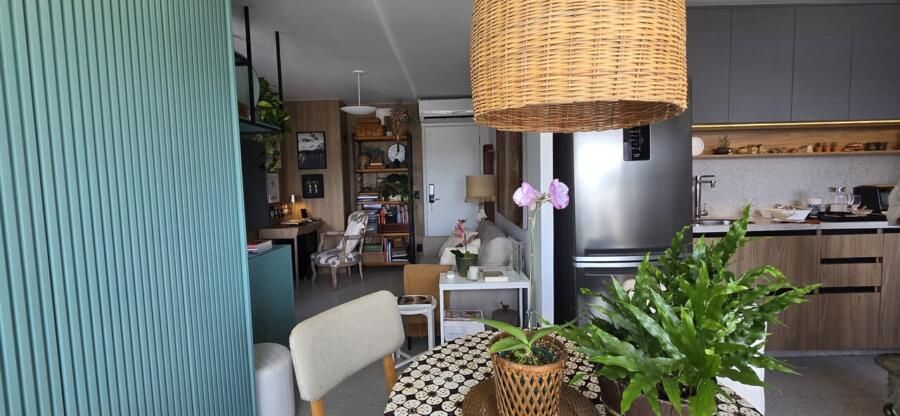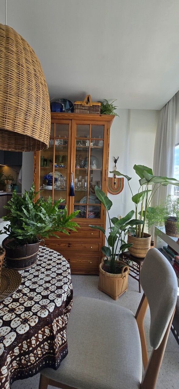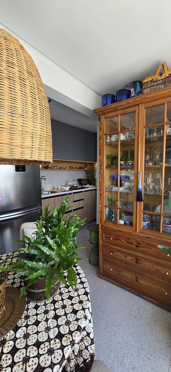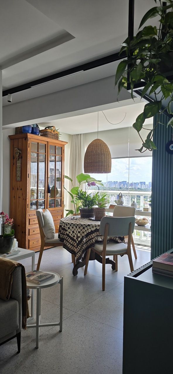 A única mudança estrutural já havia sido feita antes da compra: a integração da varanda com fechamento de vidro, criando um espaço perfeito para a sala de jantar. Para complementar a decoração, um armário em Pinho de Riga trouxe charme e personalidade ao ambiente.