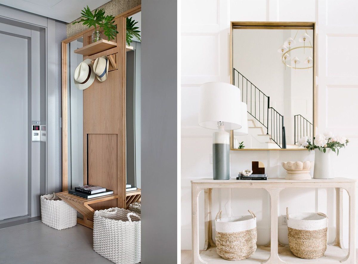 - Espelho: aaah, um mar de opções nesse tópico hahaha os redondos geralmente são os queridinhos para a entrada, mas não é regra; já vi halls com espelhos clássicos, retangulares, pequenos, espelhos de corpo inteiro e também composições com vários formatos e diferentes molduras. A composição que mais vemos é sobre a prateleira, que fica balanceada e prática para quem gosta de checar o visual antes de sair rsss.
