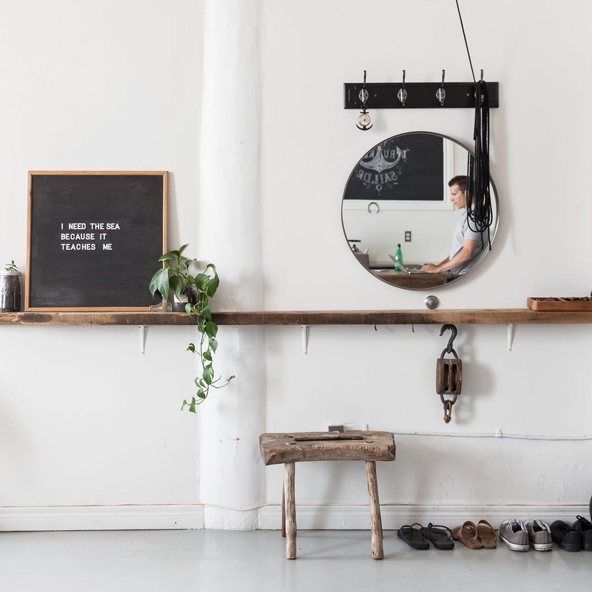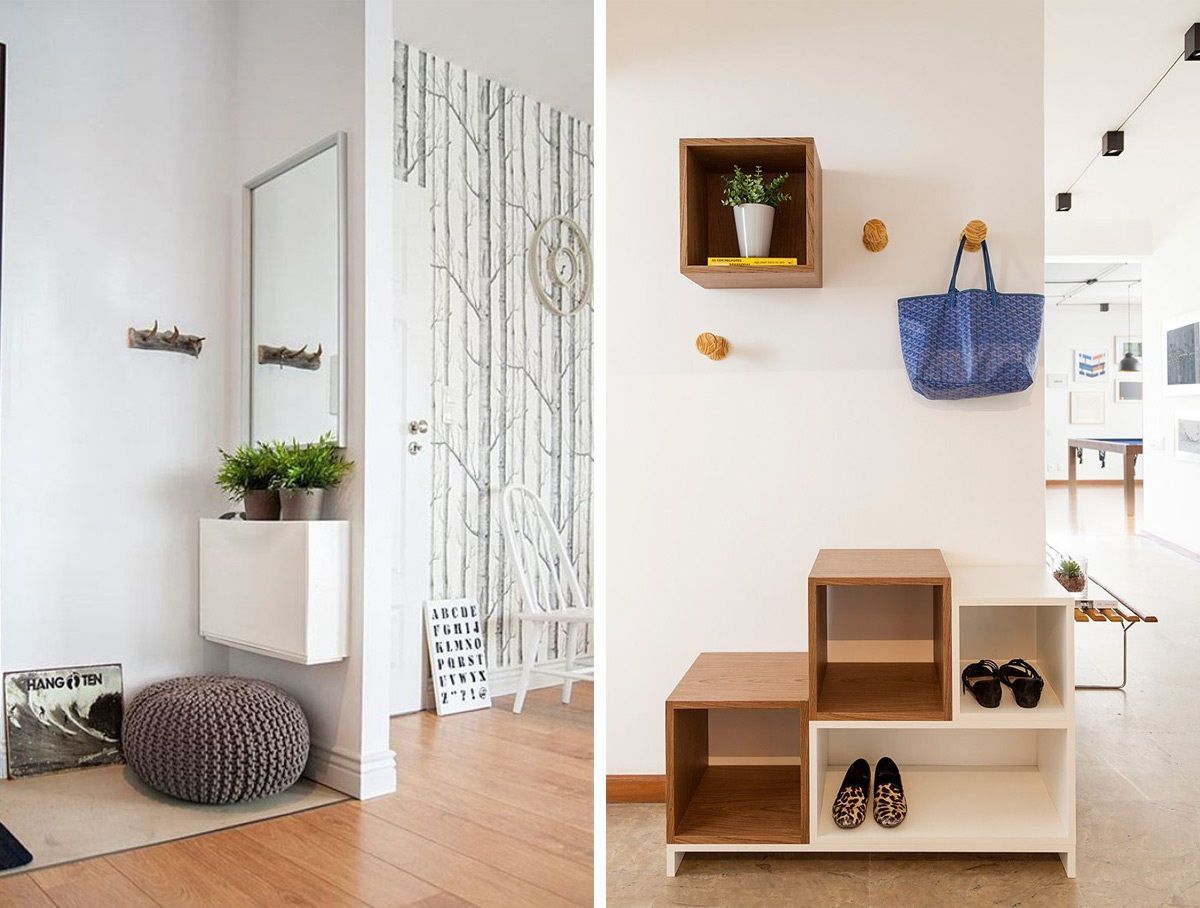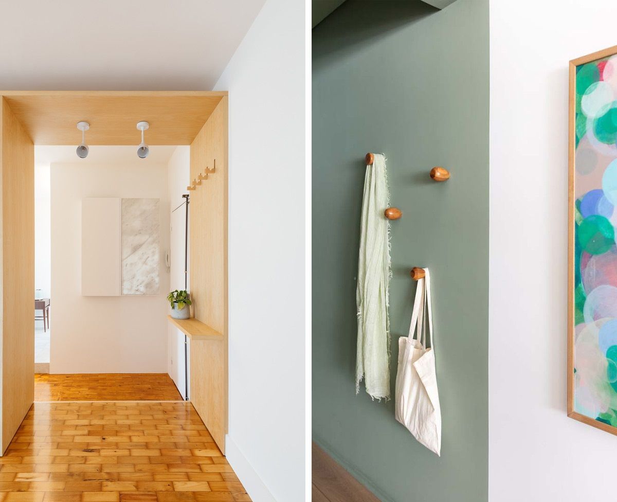 - Prateleira, aparador ou nicho: qualquer uma dessas opções, embutidas na parede, economizam espaço e servem como apoio para objetos pessoais, decoração ou aquele item que você não pode esquecer de pegar ao sair de casa.