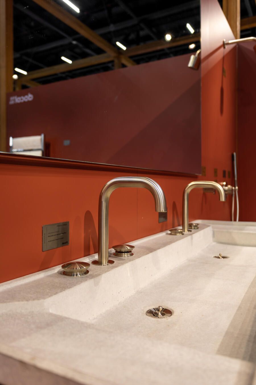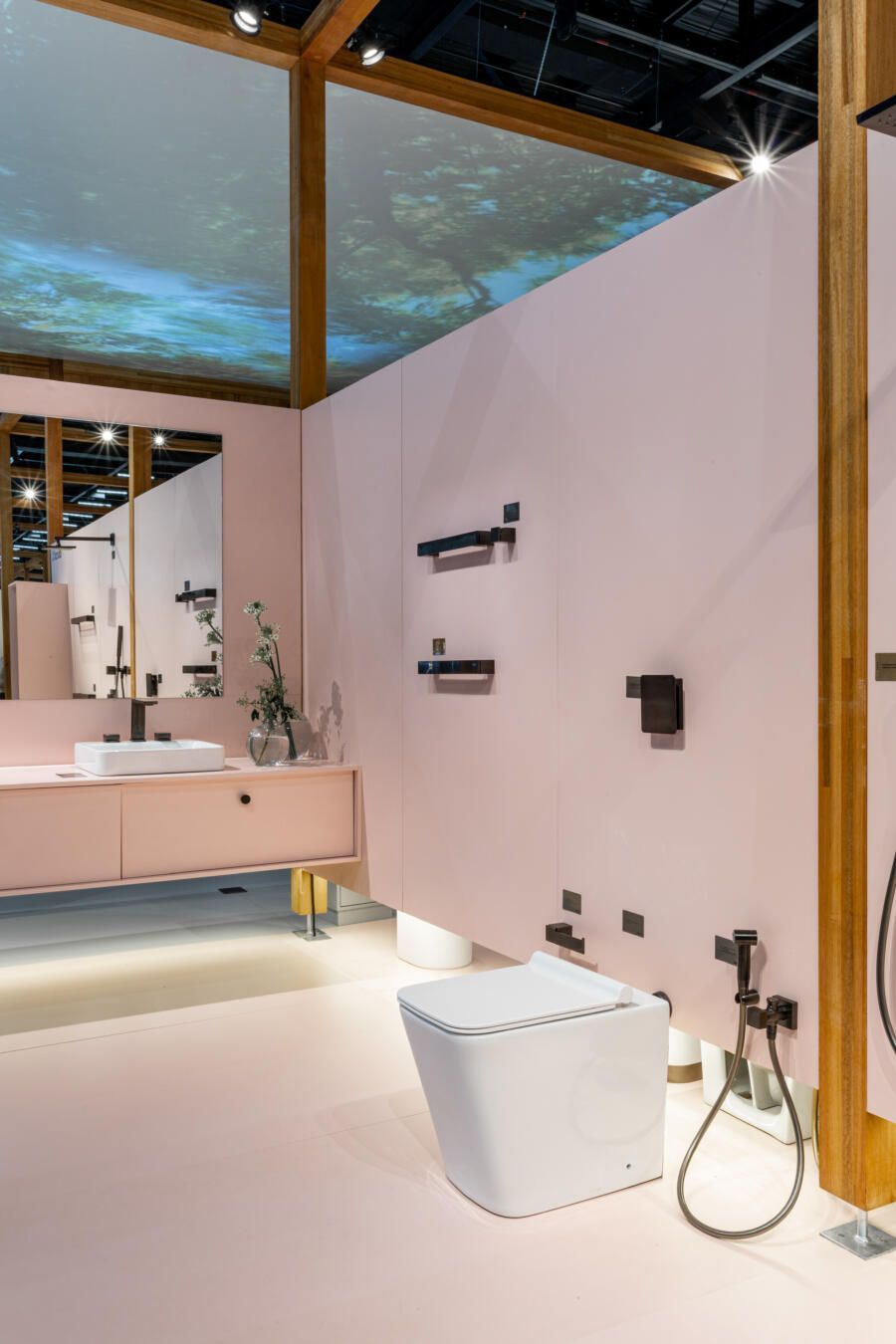 Para mostrar todas as novidades, fiz um tour completo pelo estande! O conceito que guiou a Docol na maneira como apresentaram os produtos foi a conexão indissociável entre as matas e a água. Por isso, o Estande Docol era uma verdadeira floresta de pilares de madeira laminada colada (MLC), com mil metros quadrados, projetado pela BLOCO Arquitetos e executada pela Ita Construtora. O mais interessante é que pode ser montado e desmontado para outros eventos, reforçando o compromisso da marca com a sustentabilidade.