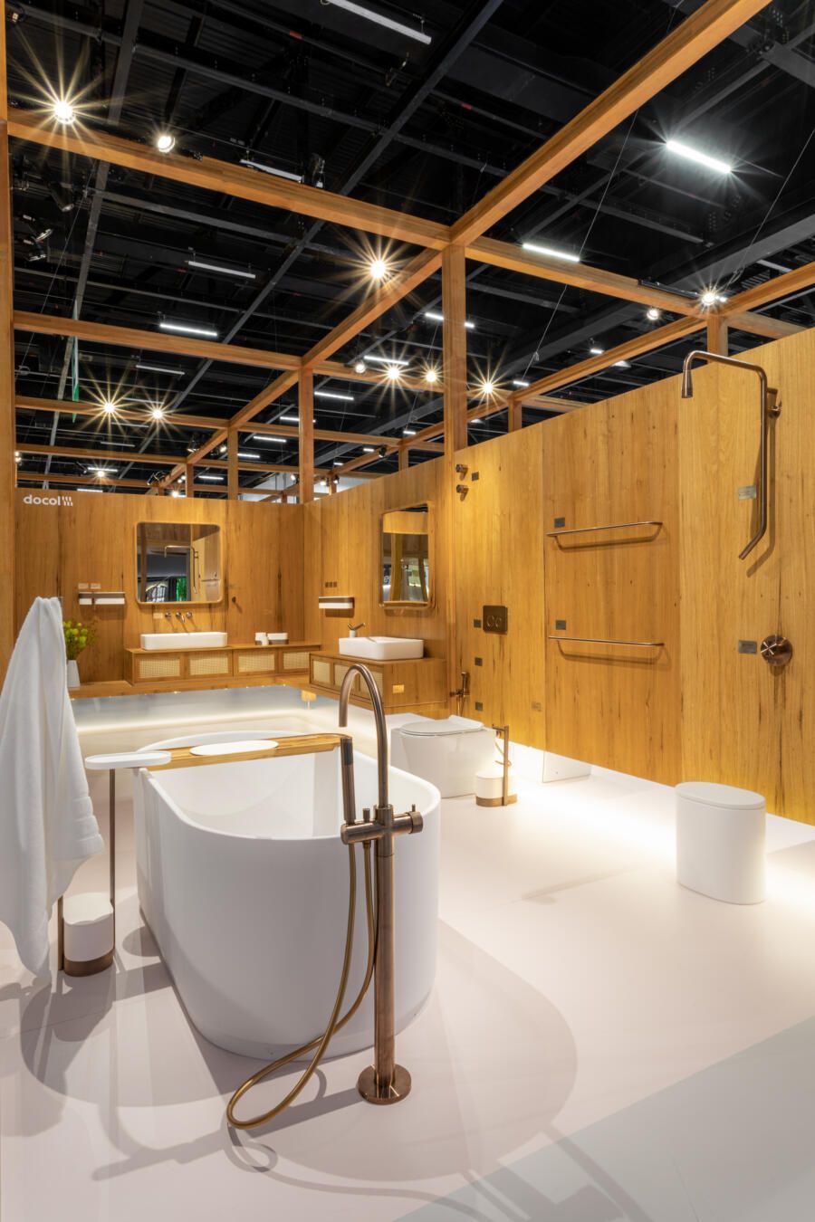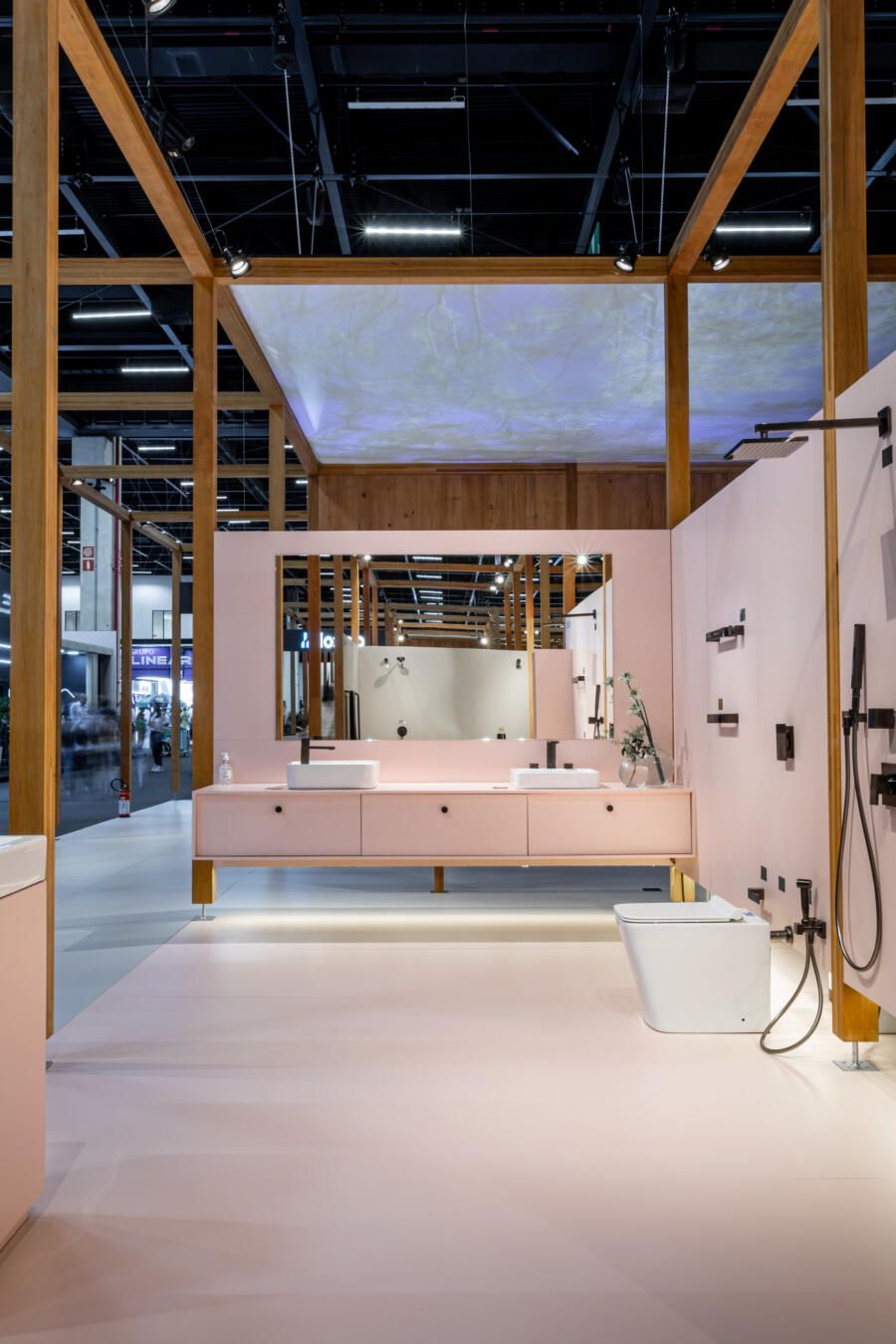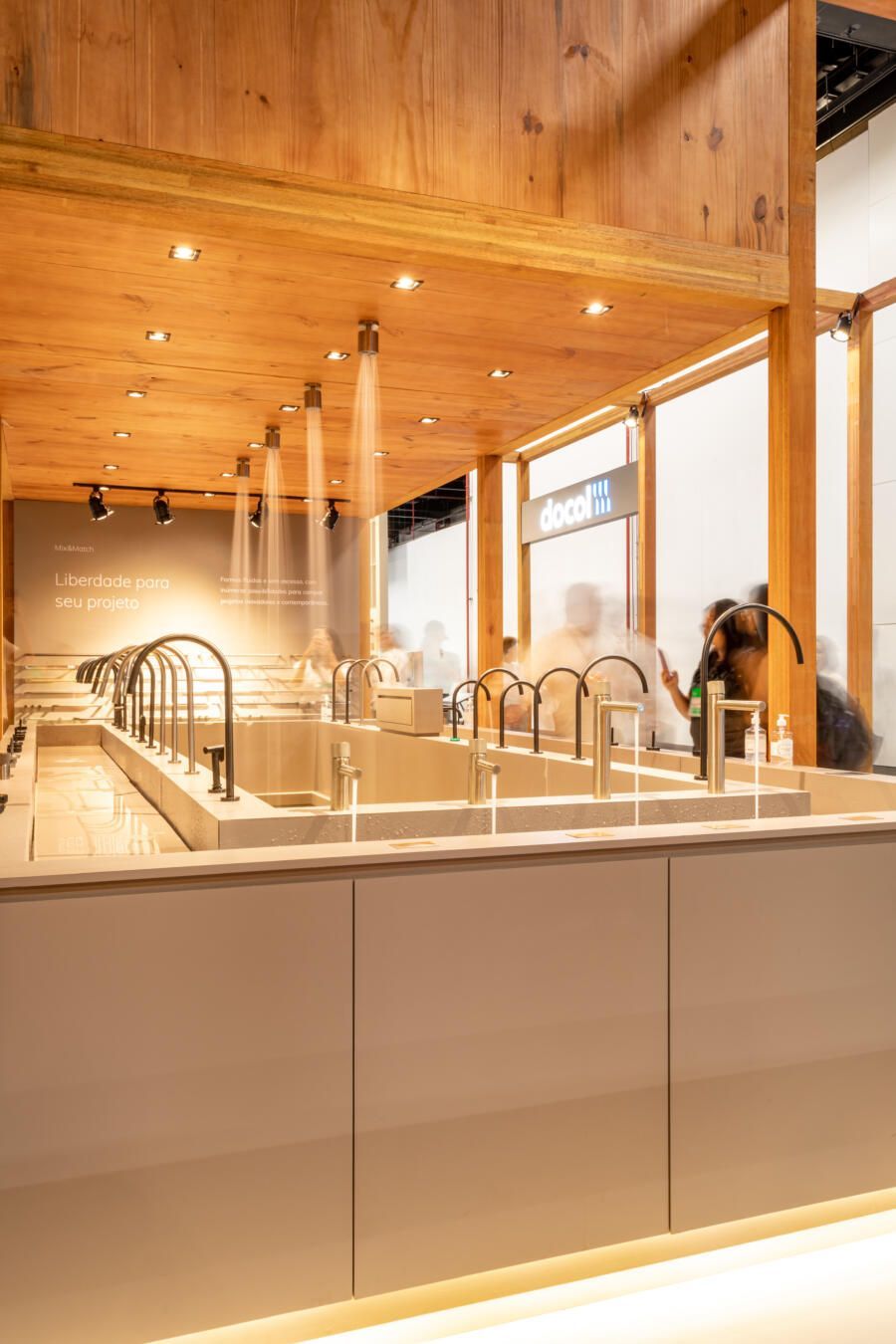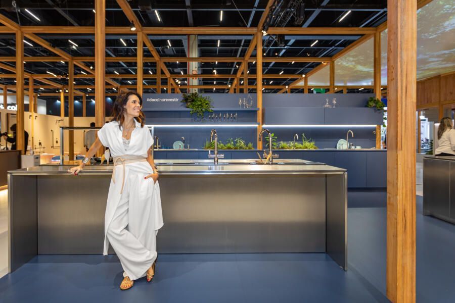 Para mostrar todas as novidades, fiz um tour completo pelo estande! O conceito que guiou a Docol na maneira como apresentaram os produtos foi a conexão indissociável entre as matas e a água. Por isso, o Estande Docol era uma verdadeira floresta de pilares de madeira laminada colada (MLC), com mil metros quadrados, projetado pela BLOCO Arquitetos e executada pela Ita Construtora. O mais interessante é que pode ser montado e desmontado para outros eventos, reforçando o compromisso da marca com a sustentabilidade.