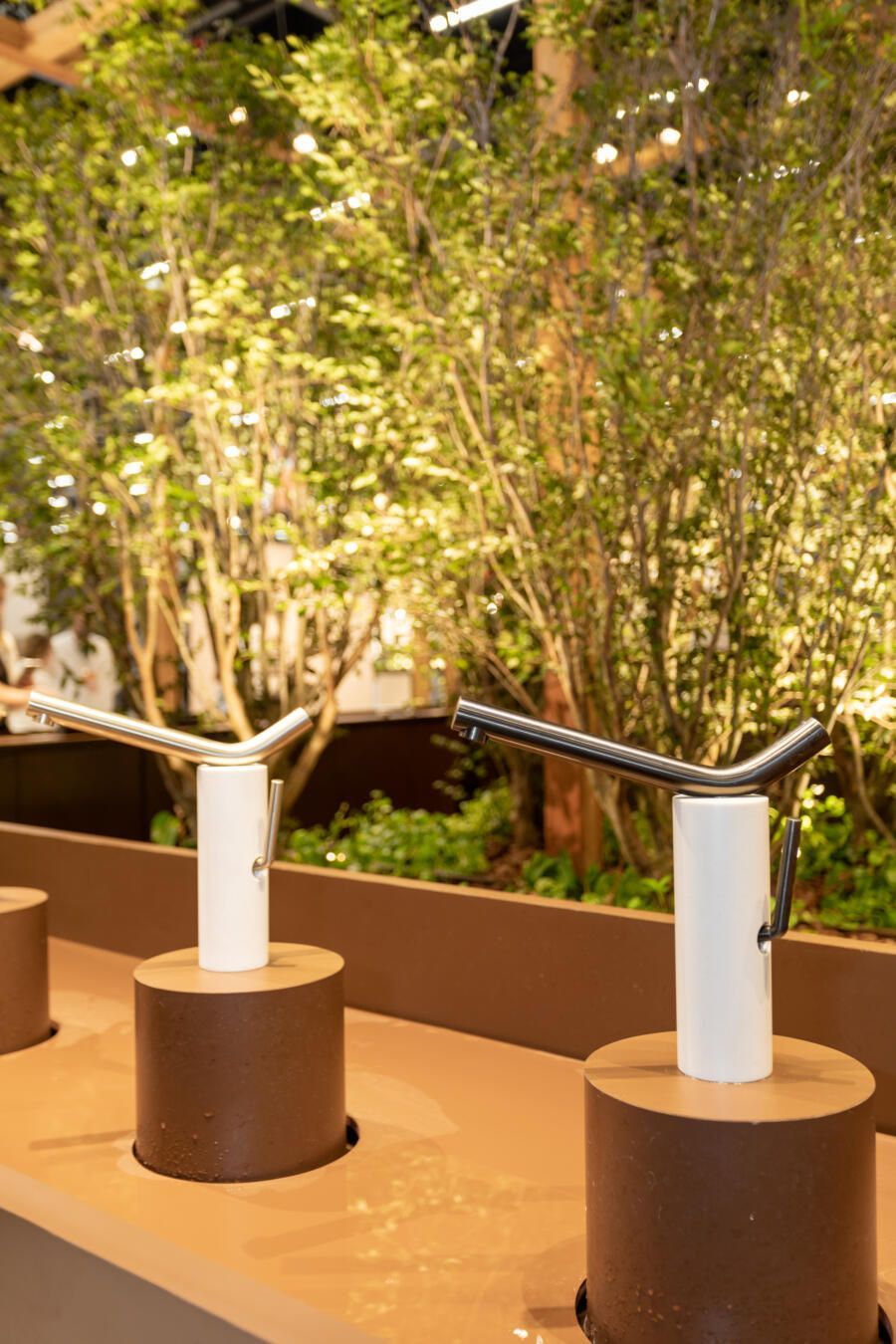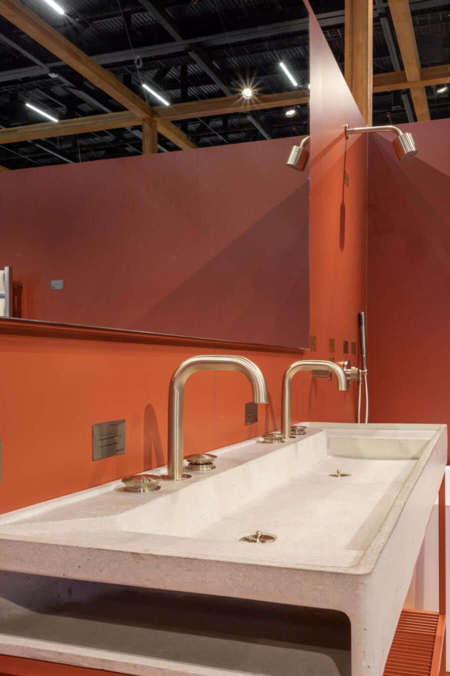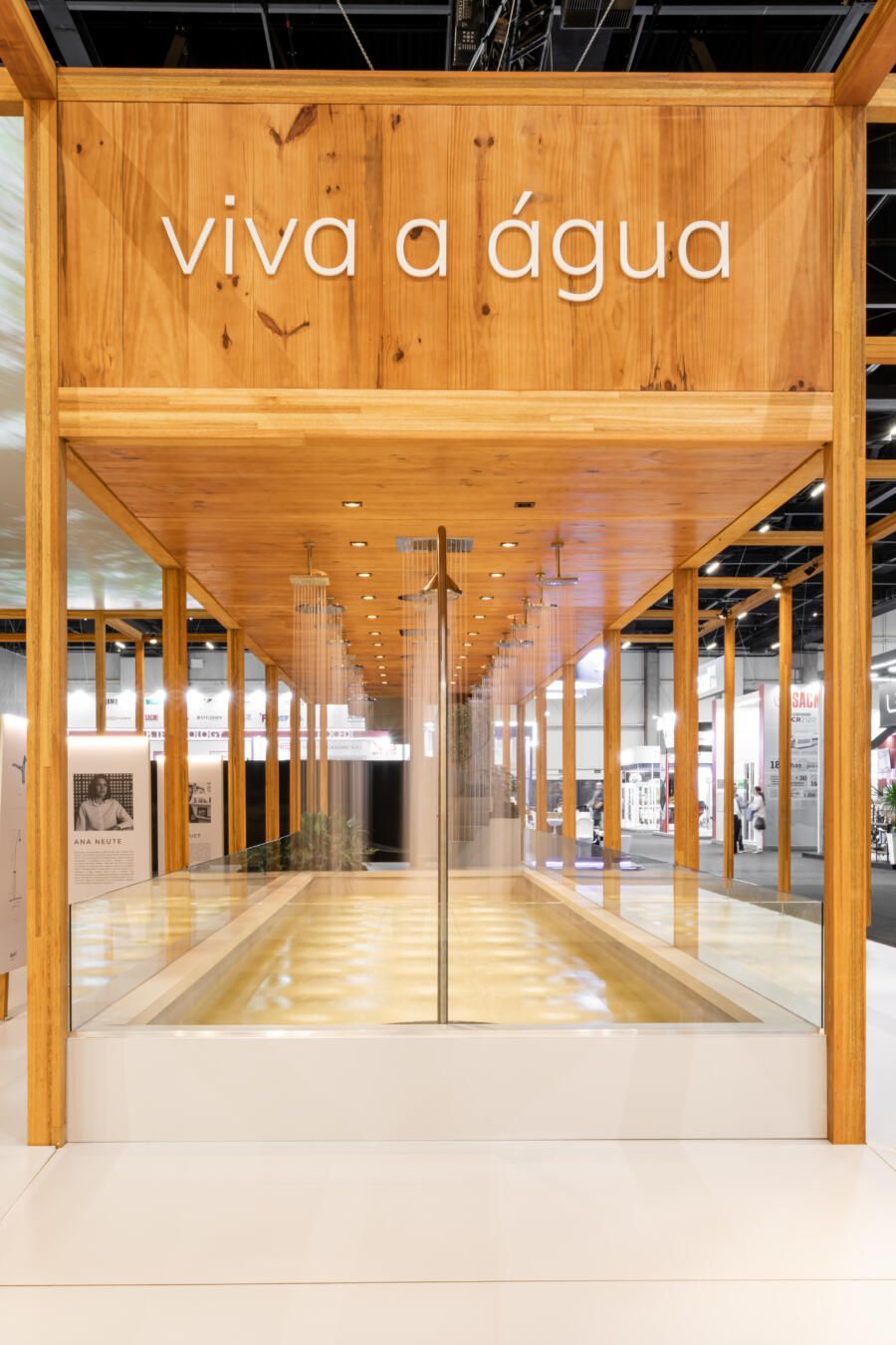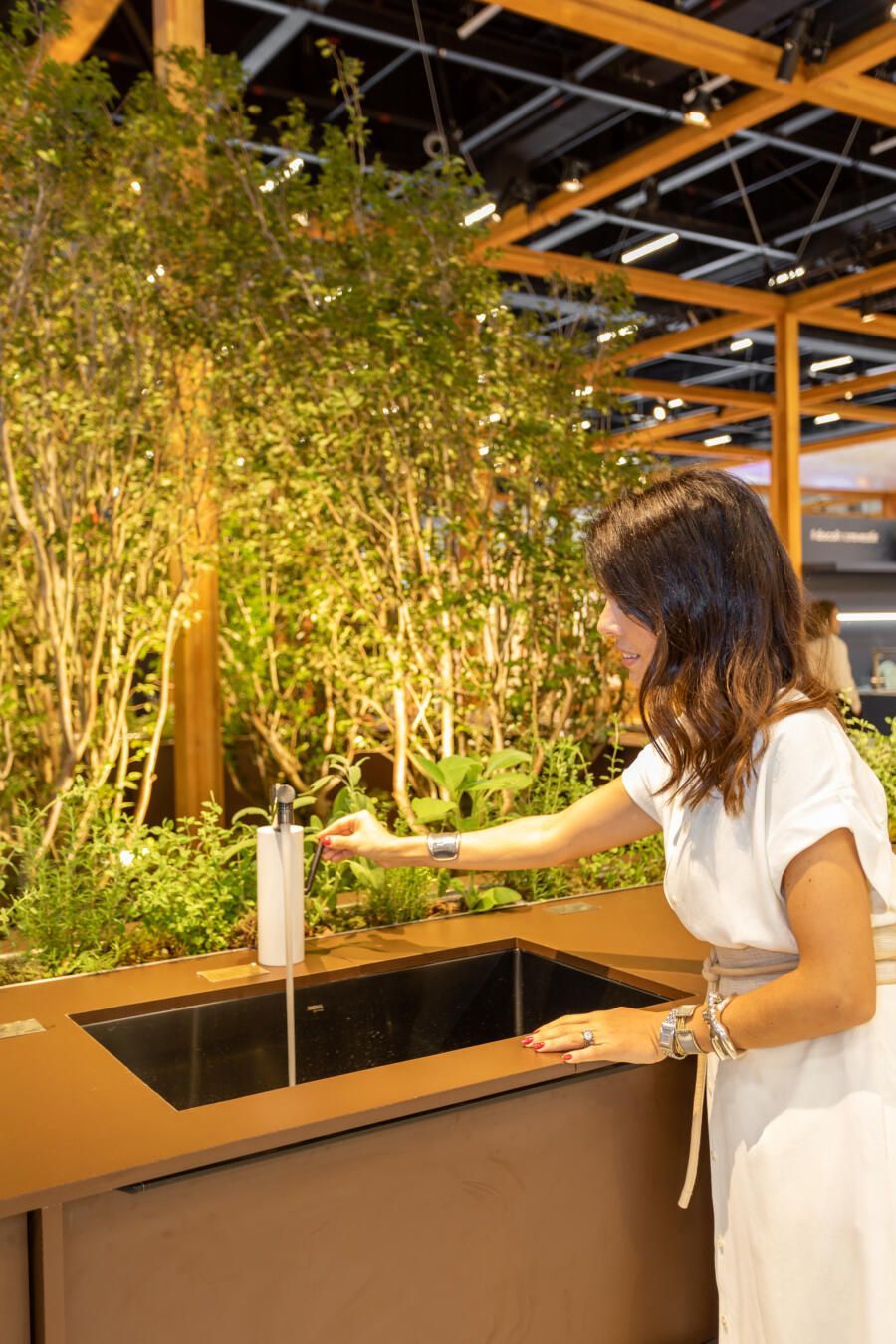 Para mostrar todas as novidades, fiz um tour completo pelo estande! O conceito que guiou a Docol na maneira como apresentaram os produtos foi a conexão indissociável entre as matas e a água. Por isso, o Estande Docol era uma verdadeira floresta de pilares de madeira laminada colada (MLC), com mil metros quadrados, projetado pela BLOCO Arquitetos e executada pela Ita Construtora. O mais interessante é que pode ser montado e desmontado para outros eventos, reforçando o compromisso da marca com a sustentabilidade.