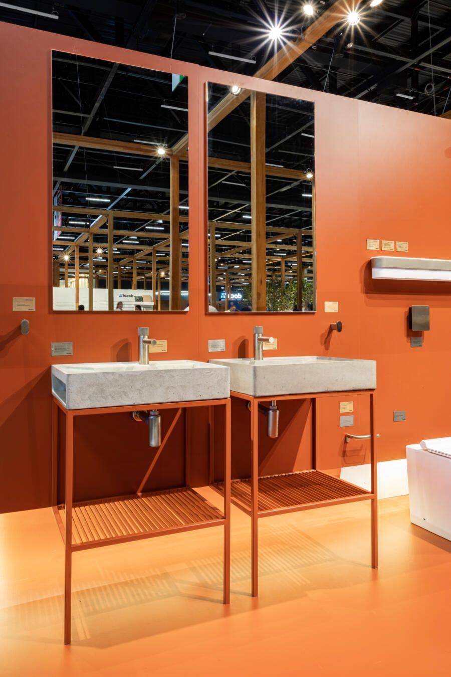 As peças são ao mesmo tempo funcionais e lúdicas, produzidas a partir da combinação de Neoclast® e Aço Inox tonalizado. O Neoclast® é um material moldável composto de resina e agregados minerais, resistente, homogêneo e de baixa porosidade, o que garante um toque suave e natural.