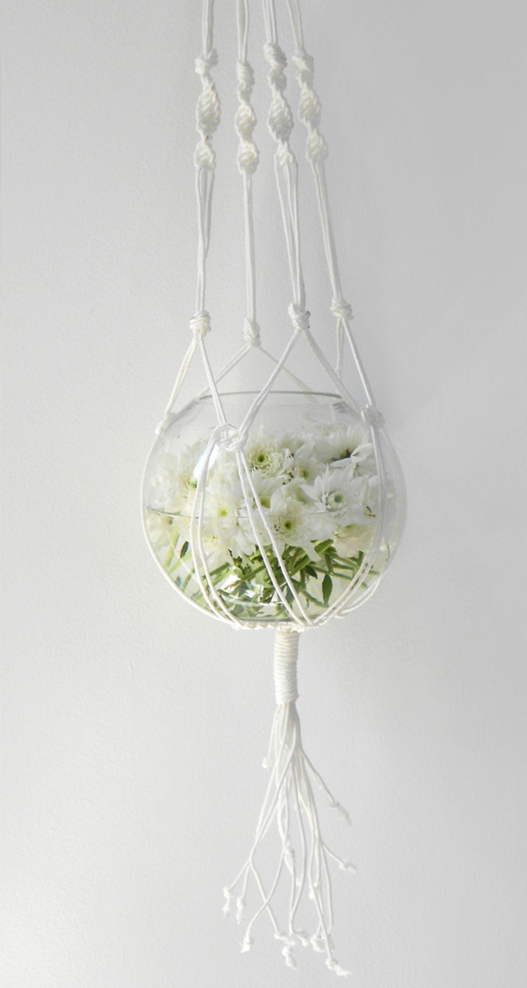 Já que o post de hoje falou sobre plantas e natureza, decidimos seguir nesse mesmo tema e mostrar um projeto "Faça Você Mesmo" bem interessante e com efeito delicado. É um vaso suspenso de vidro preso ao teto com cordas em macramê – que, para quem não sabe, é uma técnica antiga de tecer fios usando apenas as mãos. A ideia é do site Craft.Tutsplus, cheio de tutoriais bacaninhas para enfeitarmos a casa.