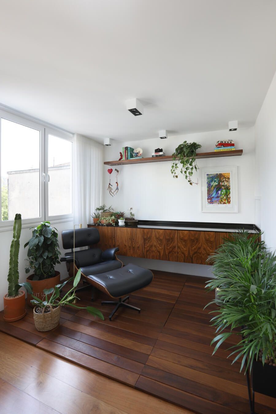 Neste jardim de inverno, o deck de madeira e a poltrona tornaram o cantinho do apartamento da arquiteta Mayumi Matsube prático e confortável. Fotos: Mariana Orsi / Divulgação
