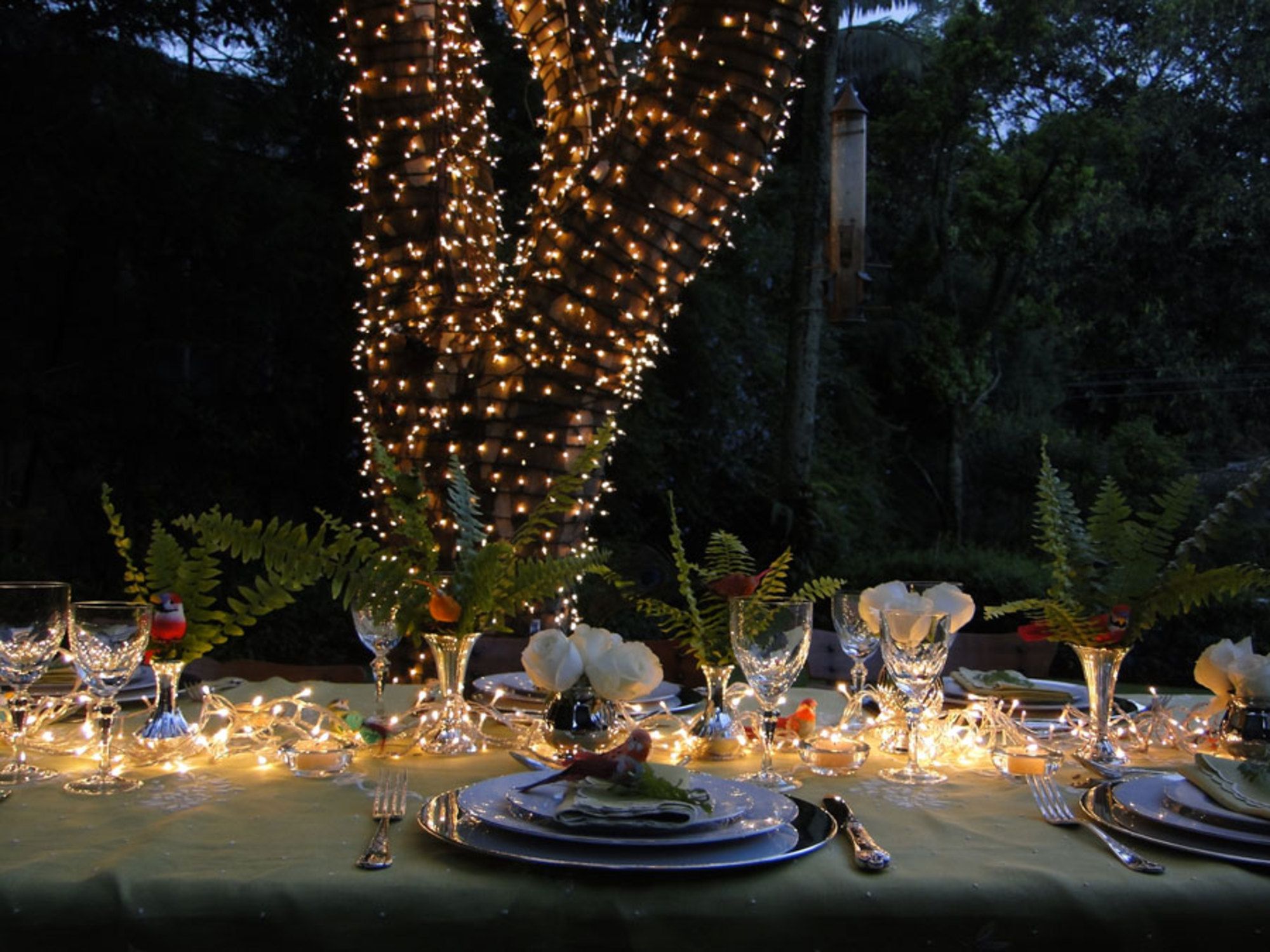 Há tempos quero montar uma mesa de jantar para o Natal embaixo da principal árvore da casa da minha mãe. Todos os anos a árvore fica inteira iluminada e brilha como personagem principal do jardim. Finalmente deu certo! Para a brincadeira ficar ainda melhor estipulei o valor de R$100,00 para fazer toda e decoração.Comprei: 3 fios de luzes (45,00), 2 maços de rosas (28,00) e 12 passarinhos (25,00) = R$98,00Daí vcs vão falar "haaaa Lucila mas assim é fácil. E os vasinhos de prata, porcelanas, taças, faqueiro, etc." Bom, realmente com tudo a mesa fica mais cara, mas essas peças podem tranquilamente ser substituídas por outras que vcs tenham em casa, pois a "pegada" dessa mesa são esses 3 ítens que comprei.Quem acompanha o blog há tempos já deve ter reparado que as minhas decorações natalinas nunca são em tons de vermelho, verde e dourado. Pois é… eu gosto também, mas acho que já que o nosso Natal vem acompanhado de sol e um clima agradável, pq não usarmos uma decoração mais tropical? O que vcs acham?