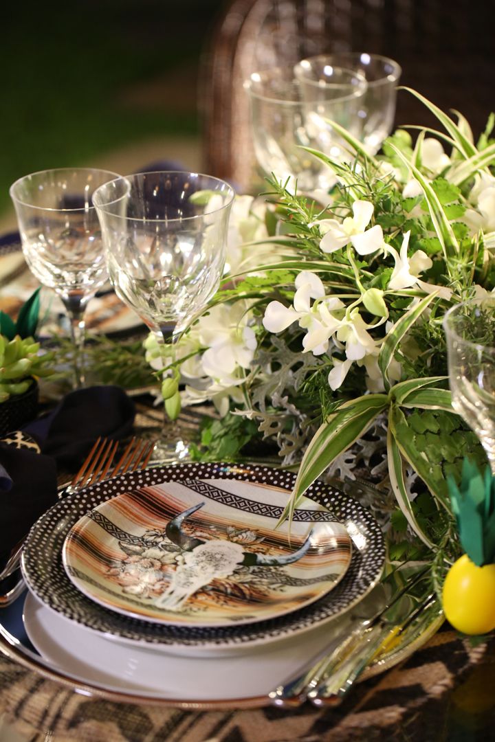 Com isso, a palavra de ordem da vez é despojamento! A Fê e a Paula escolheram trabalhar com bastante folhagens para que no final o arranjo ganhasse um formato mais solto e selvagem, com o intuito de ressaltar a atmosfera étnica, um tanto boho, da produção. Elas mandaram ver nos raminhos de alecrim, cinerária, avenca e arremataram o arranjo com orquídeas. As suculentas, queridinhas da vez, marcaram presença em peso e foram plantadas em copinhos de chá que ficaram perfeitos como mini vasinhos.