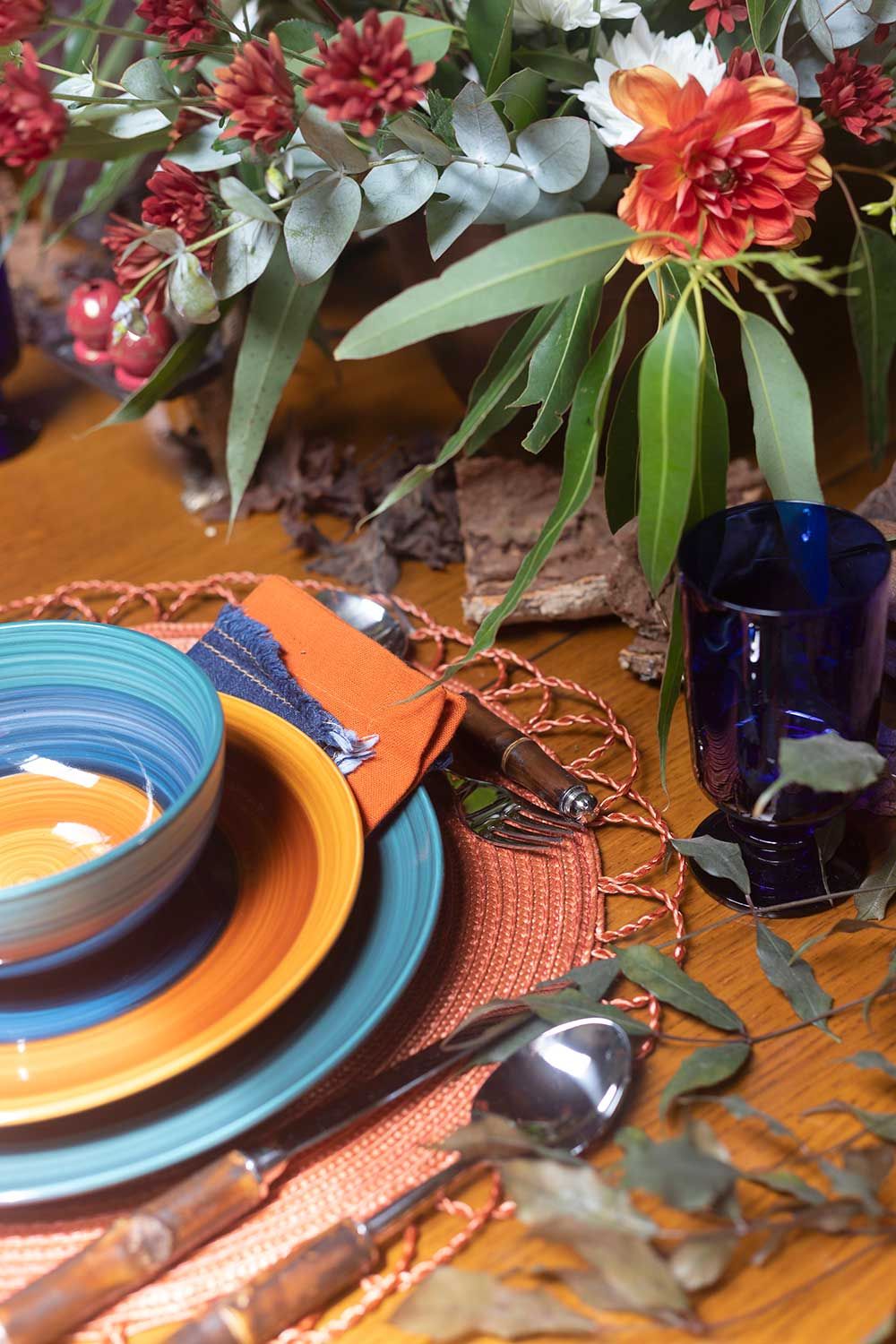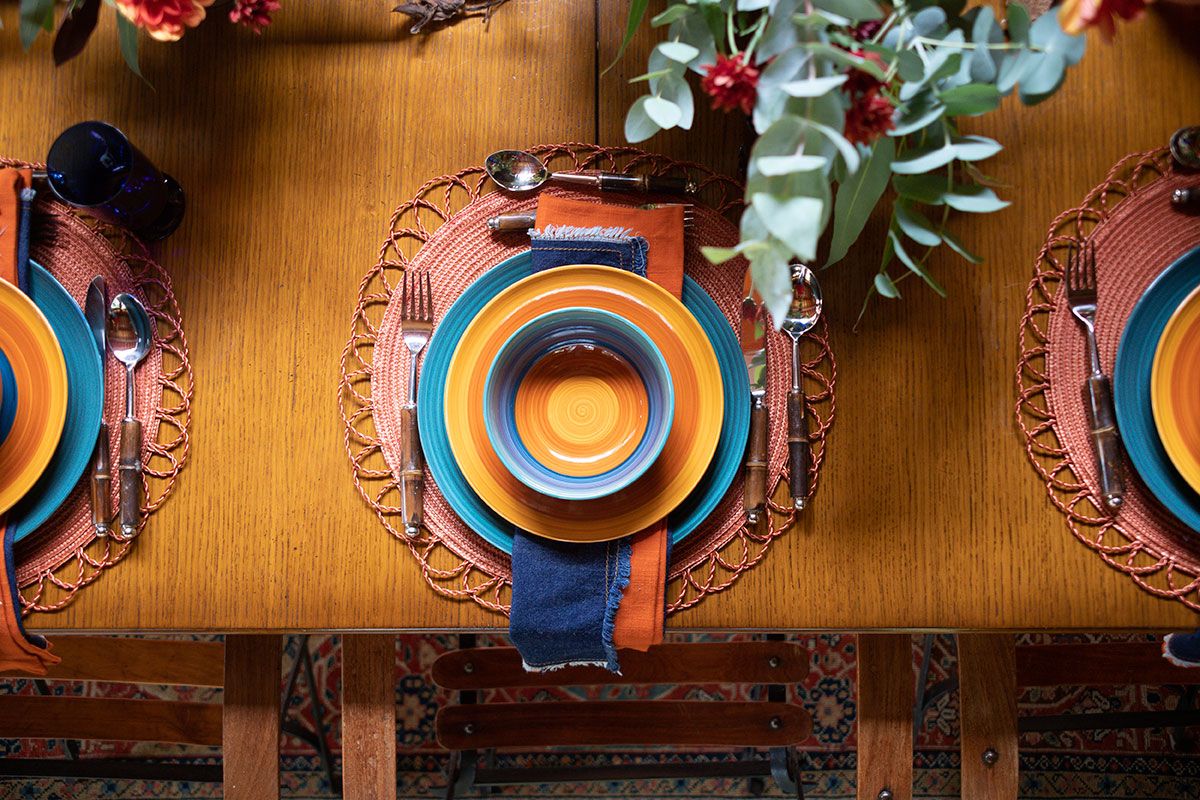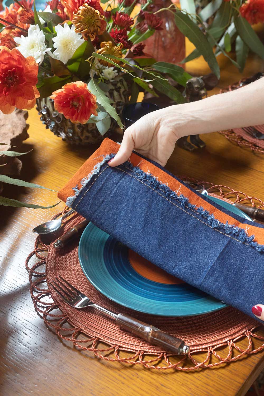 Quis tirar proveito do tom lindo da madeira da mesa que tinha tudo a ver com o clima ocre que estava criando. Por isso, optei em usar jogos americanos ao invés de uma toalha de mesa. Escolhi o modelo redondo com esse detalhe na borda que lembra um sol emoldurando a louça – bem no estilo boho, né? Para completar, usei o jogo de talheres com hastes em bambu e fiz uma composição de guardanapos: um terracota básico junto do modelo jeans moderninho que tem as bordas desfiadinhas.