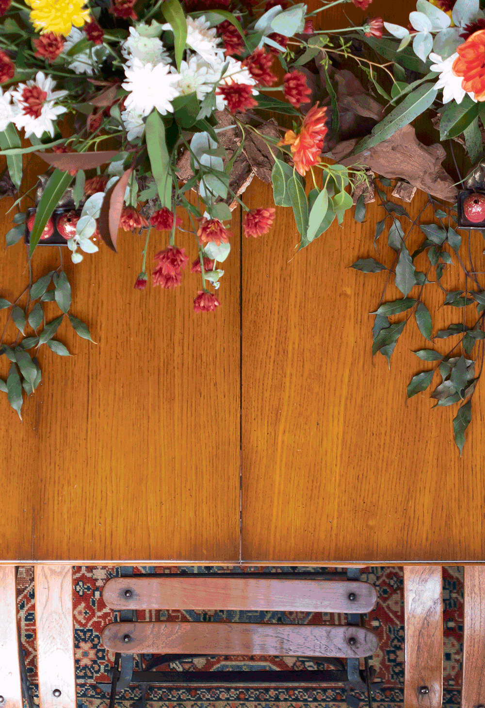 Seguindo essa proposta de cenário com nuances de pôr do sol, a Carol da Sinhá Flor produziu alguns arranjos com predominância de flores alaranjadas, mas que trazem também o tom de verde das folhagens, além de detalhes amarelos e brancos. Ela criou uma fileira de vasos marrons baixos, todos da D. Filipa, com o intuito de intensificar as texturas e criar a sensação de um caminho de mesa florido. As cascas de madeira e folhagens secas se misturam com as peças de um jeito super harmônico. Amei o efeito que deu!!