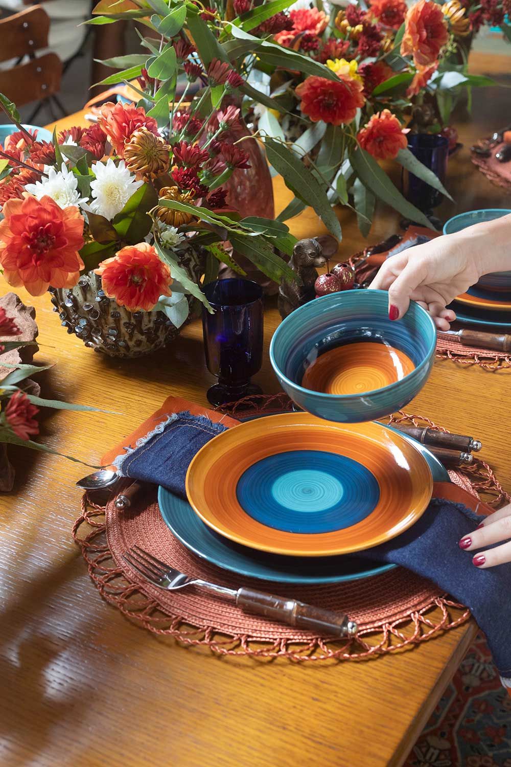 O primeiro passo foi encontrar um jogo de louças da Copa&Cia ideal para criar a base do cenário. Me encantei logo de cara pelo degradê da linha Curaçao, assinada pela ceramista Carolina Haveroth, e a partir do tom de ocre das peças comecei a pincelar o restante da mesa com uma mistura boa de cores. Pensa no céu de fim de tarde de um dia de verão… tá aí a paleta desta mesa!! As variações de azul vieram como o complemento perfeito quebrando um pouco do calor da decoração, mas de uma maneira sutil e visualmente interessante.
