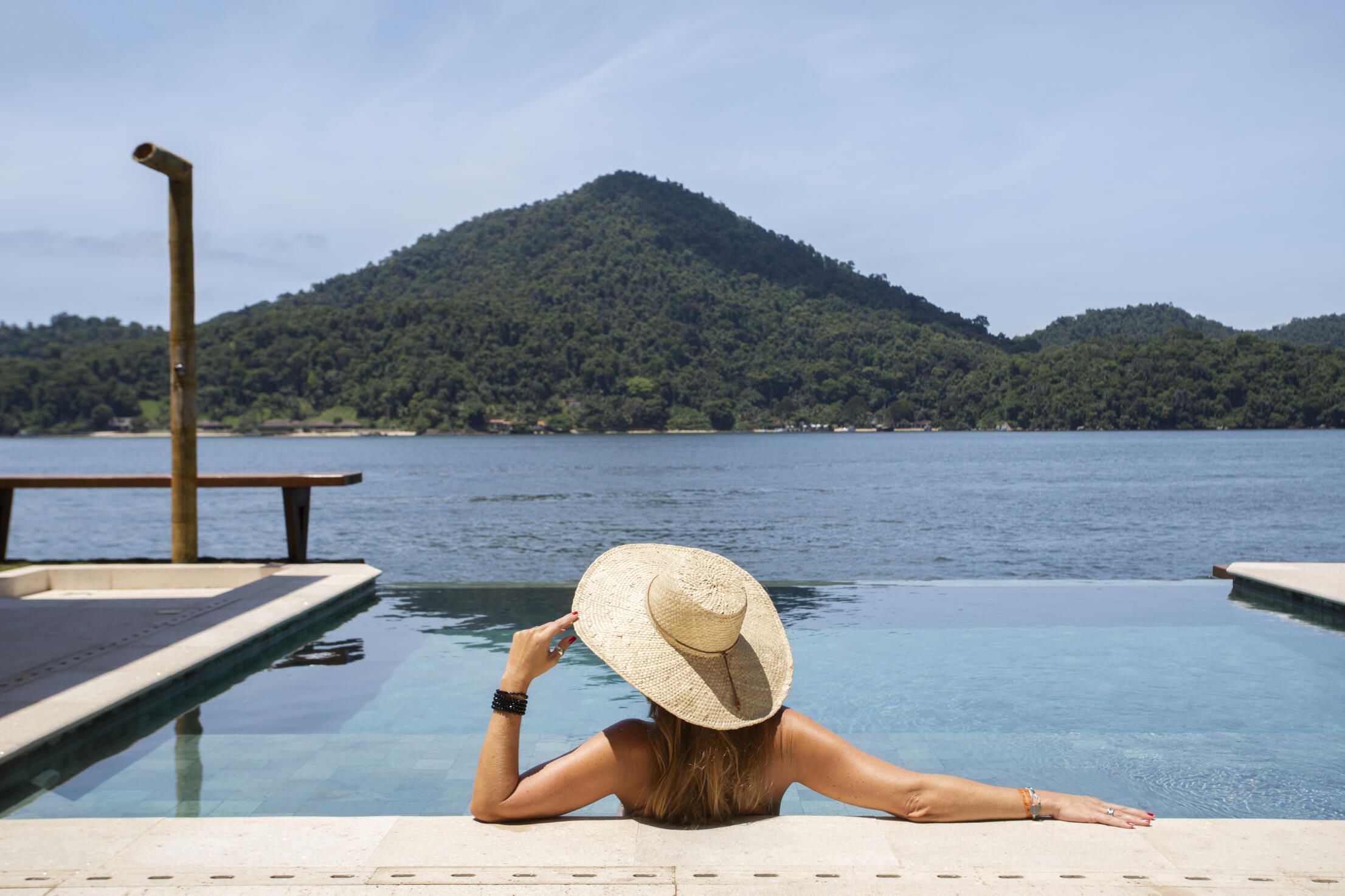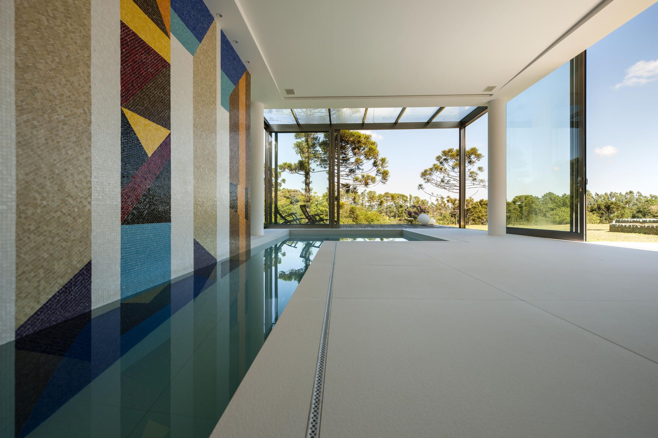 Casa ampla com coleção de arte e mural na piscina