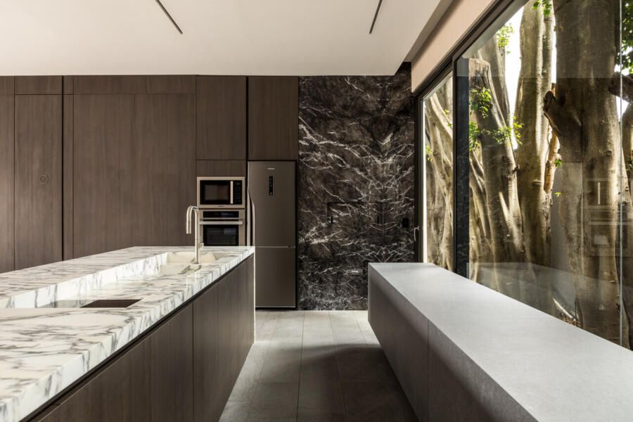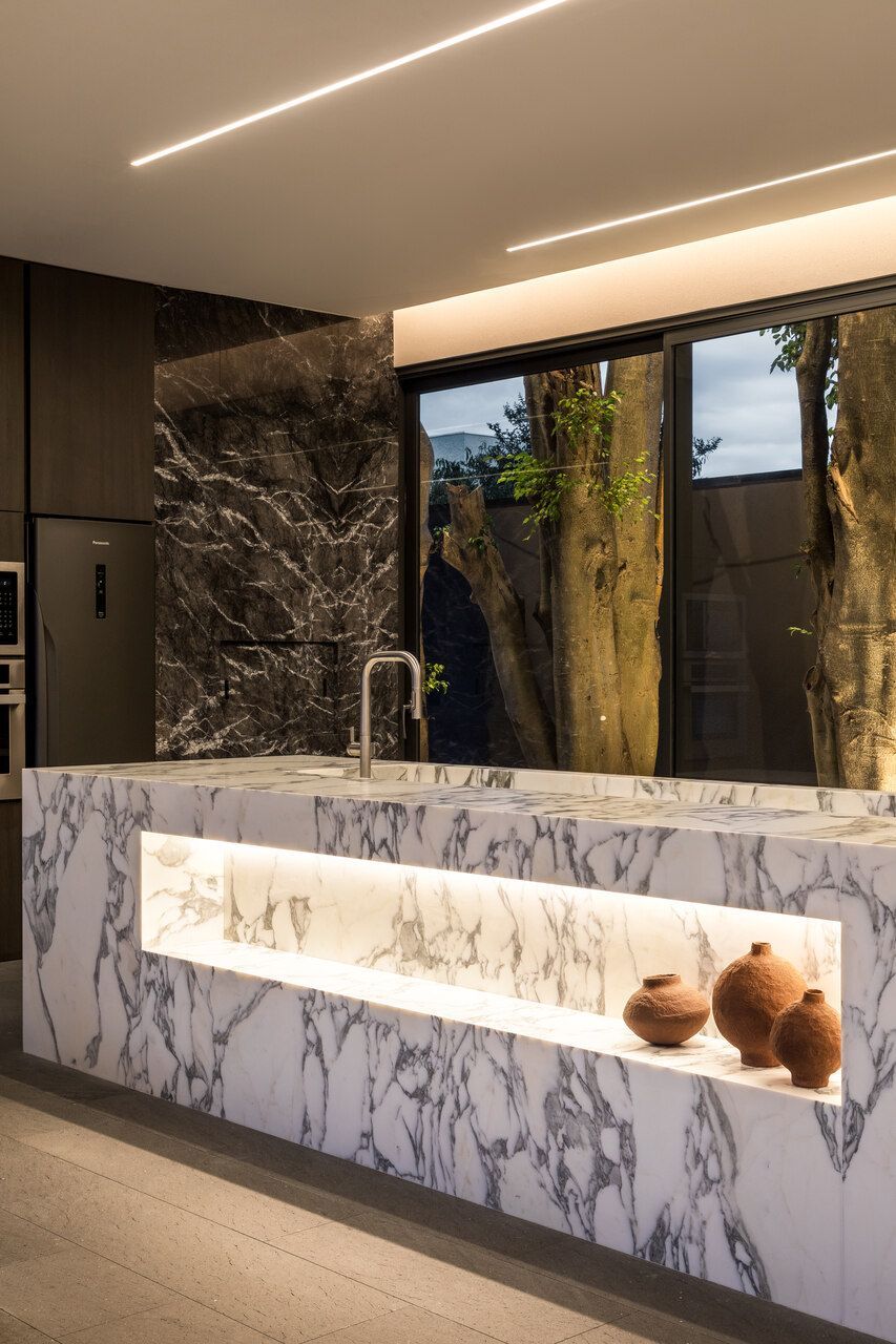 Logo na entrada, o showroom exibe painéis imponentes, incluindo um com 14 pedras naturais em uma paleta de cores atemporal e outro com seis pedras de Ônix, que se destacam pela beleza e autenticidade. O piso é revestido com Travertino Negro, uma pedra natural italiana que também é utilizada em lojas internacionais como Dolce & Gabbana e Celine. Além disso, o Mármore Italiano Arabescatto Corchia, um dos mármores mais nobres da natureza, cobre toda a bancada da área gourmet.