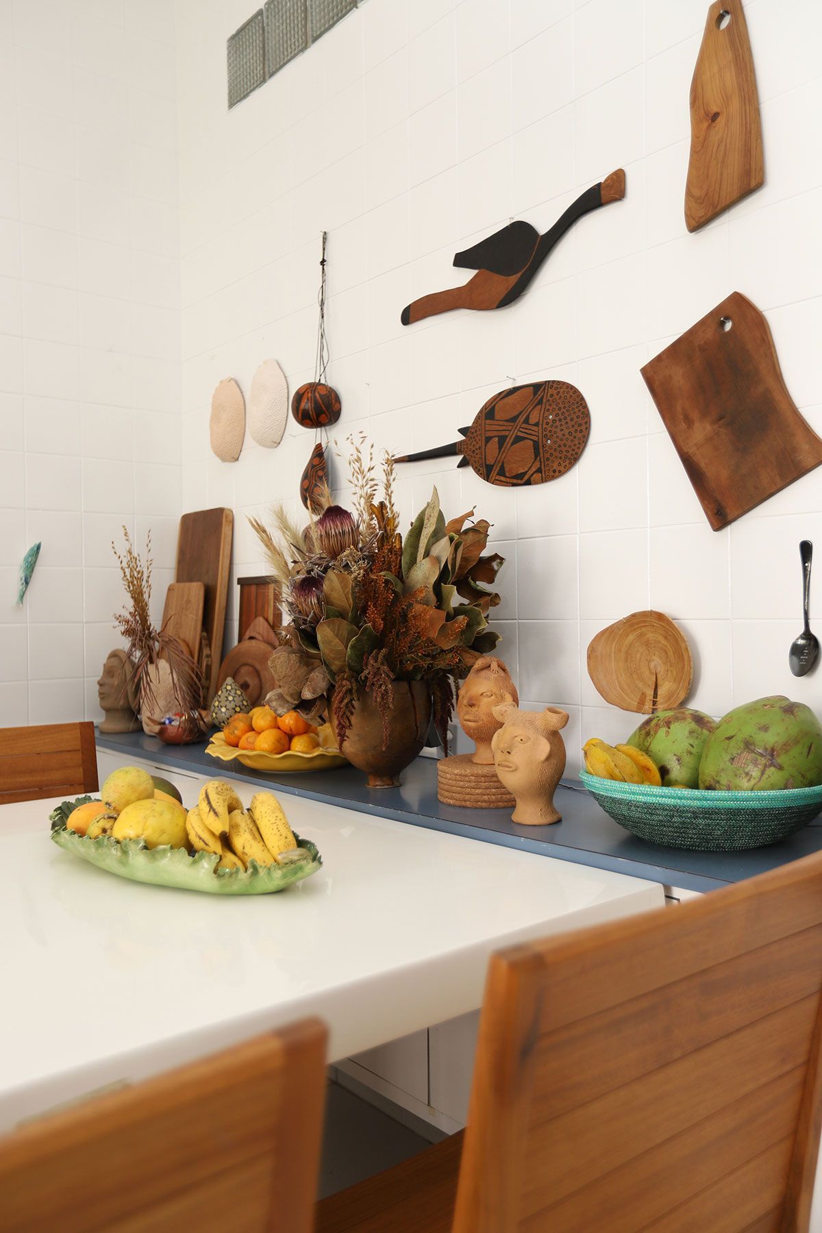 Na decoração, optamos por misturar móveis e objetos que já tínhamos no nosso apê anterior, que já estavam na casa da minha avó e pitadas de novas aquisições. Foi hiper prazeroso revisitar as memórias, dar uma nova cara à peças antigas e entender como cada item que temos pode se ajustar em um novo cenário. Ainda, mergulhamos no universo das plantas para espaços com sombra e, com a ajuda da Catê Poli, paisagista também da casa que estamos construindo, criamos um pequeno bosque no estar e uma horta de 7,5m de largura – que viraram xodós por aqui na quarentena rsss