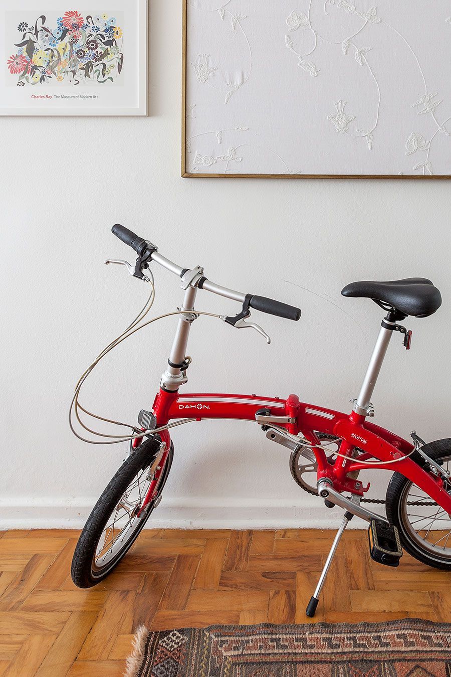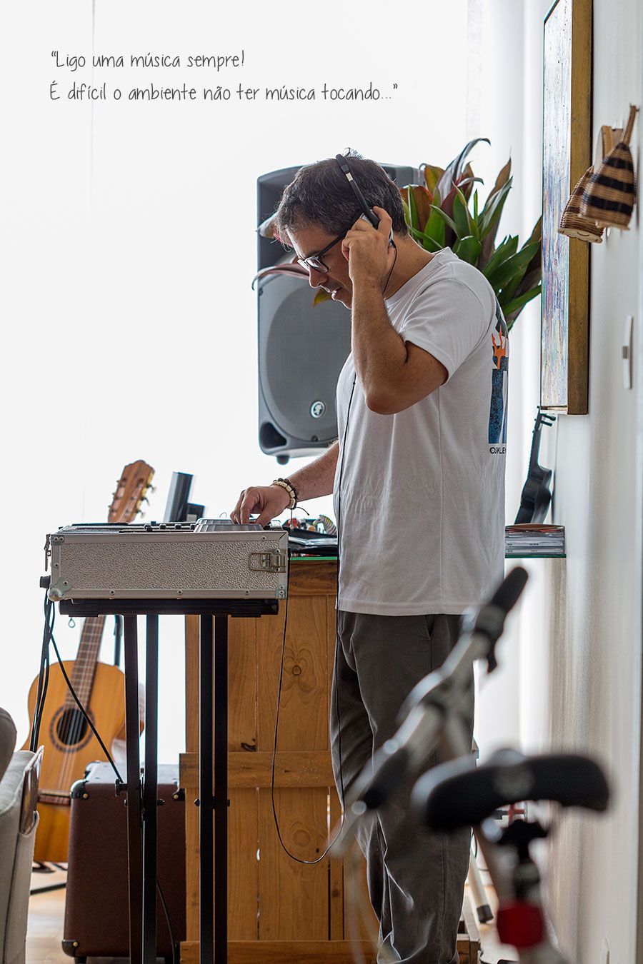 Boa parte da vida do Ribeiro (ele é mais conhecido como Ribeiro do que como André), gira em torno da música. Então, quando se separou resolveu montar um novo apartamento onde a música fosse protagonista da situação. E conseguiu! Logo que encontrou este apê vago, pertinho do trabalho – ele usa no dia a dia essa bike aqui da foto – com os tacos que sempre gostou e uma iluminação que pega praticamente todos os espaços não pensou muito, foi disso direto para a reforma.