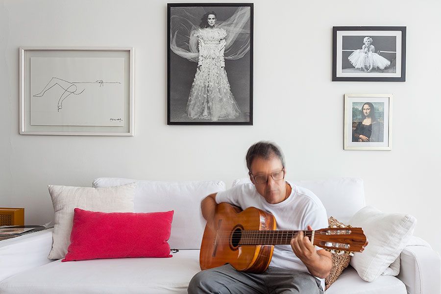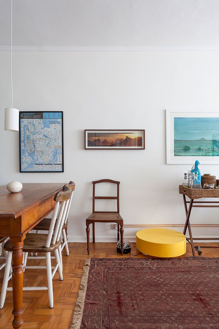 Também tem um vai e vem de móveis interessante na casa. A mesa de jantar ele ganhou emprestada de uma amiga, mas vai comprar logo logo. E, da mesma maneira que comprou móveis de amigos e clientes, vende os seus também “assim como um showroom que muda de tempos em tempos aqui as coisas mudam também, às vezes algum amigo chega aqui, gosta de algo, e eu vendo. Não sou apegado, com raras exceções.”
