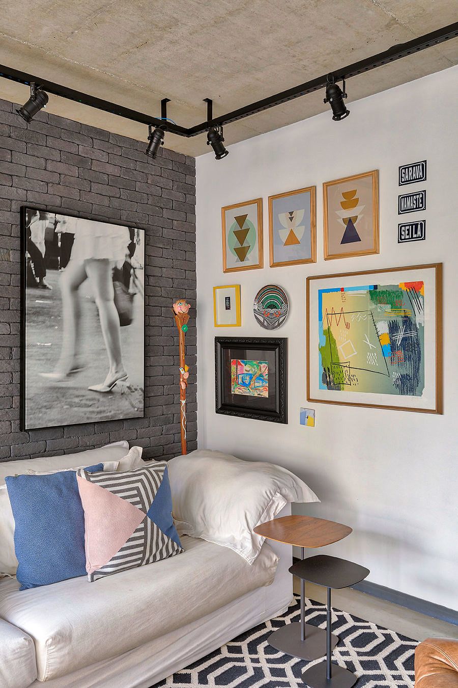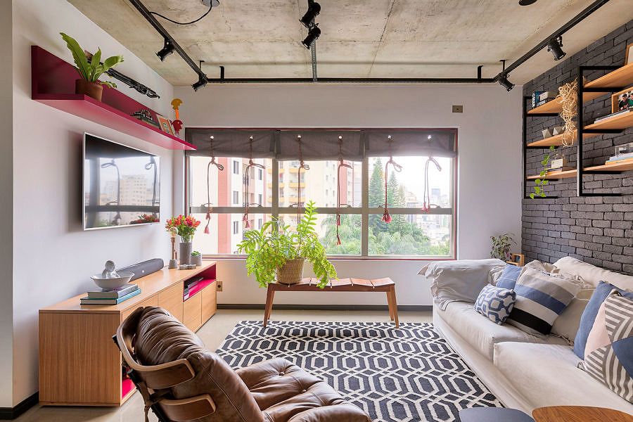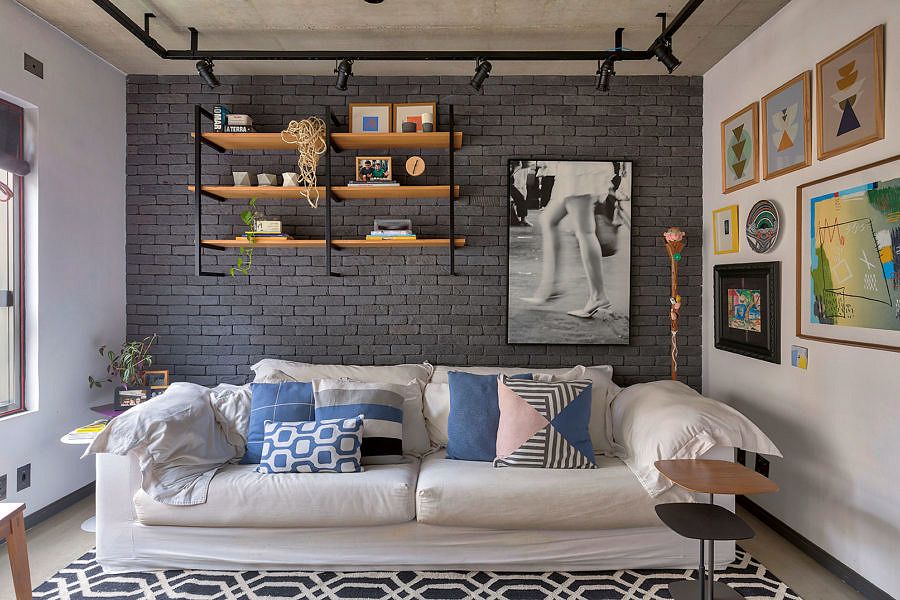 Foram poucas as mudanças estruturais propostas pelo morador. O imóvel foi entregue cru, com as paredes brancas, a laje de concreto aparente, o piso sem revestimento e apenas um banheiro. Pensando no conforto diário, o Bruno transformou o único banheiro em dois: um privativo e outro para visitas e hóspedes. Também roubou um pouquinho do espaço da varanda para conseguir encaixar um closet na suíte. Apaixonado pelo estilo industrial, enfatizou o visual bruto das estruturas ao pareá-lo com outros elementos bastante urbanos, como a serralheria, os trilhos com spots e os tijolinhos aparentes. Aliás, os tijolos, tão essenciais para a proposta do projeto, têm um segredinho extra… São, na realidade, um tipo de revestimento cimentício que simula a textura e aparência dos tijolos reais. Utilizá-lo foi quase estratégico: “era a melhor alternativa para manter esse ar industrial sem perder espaço na sala”.