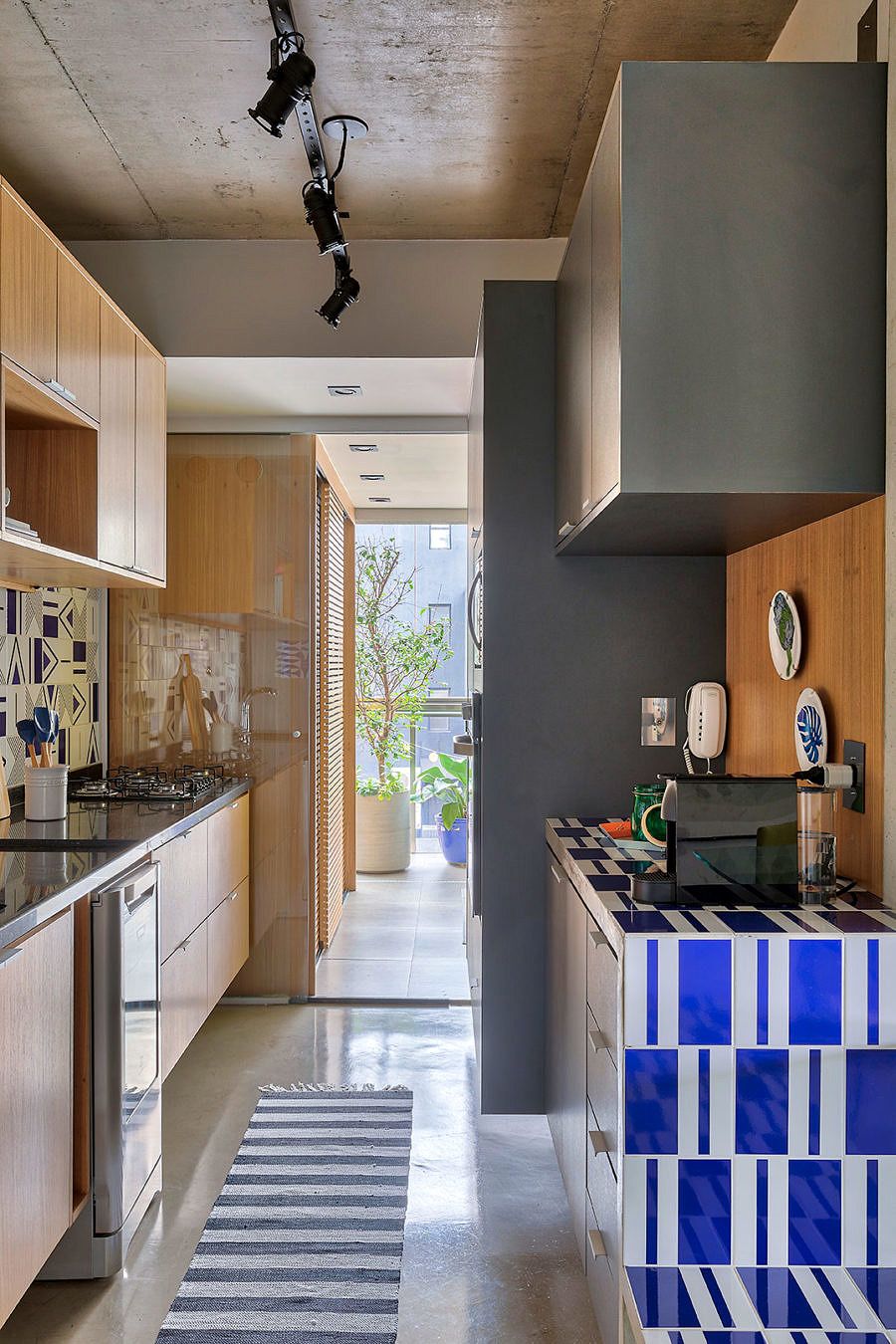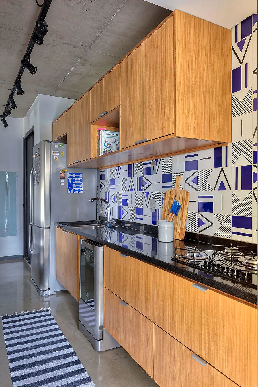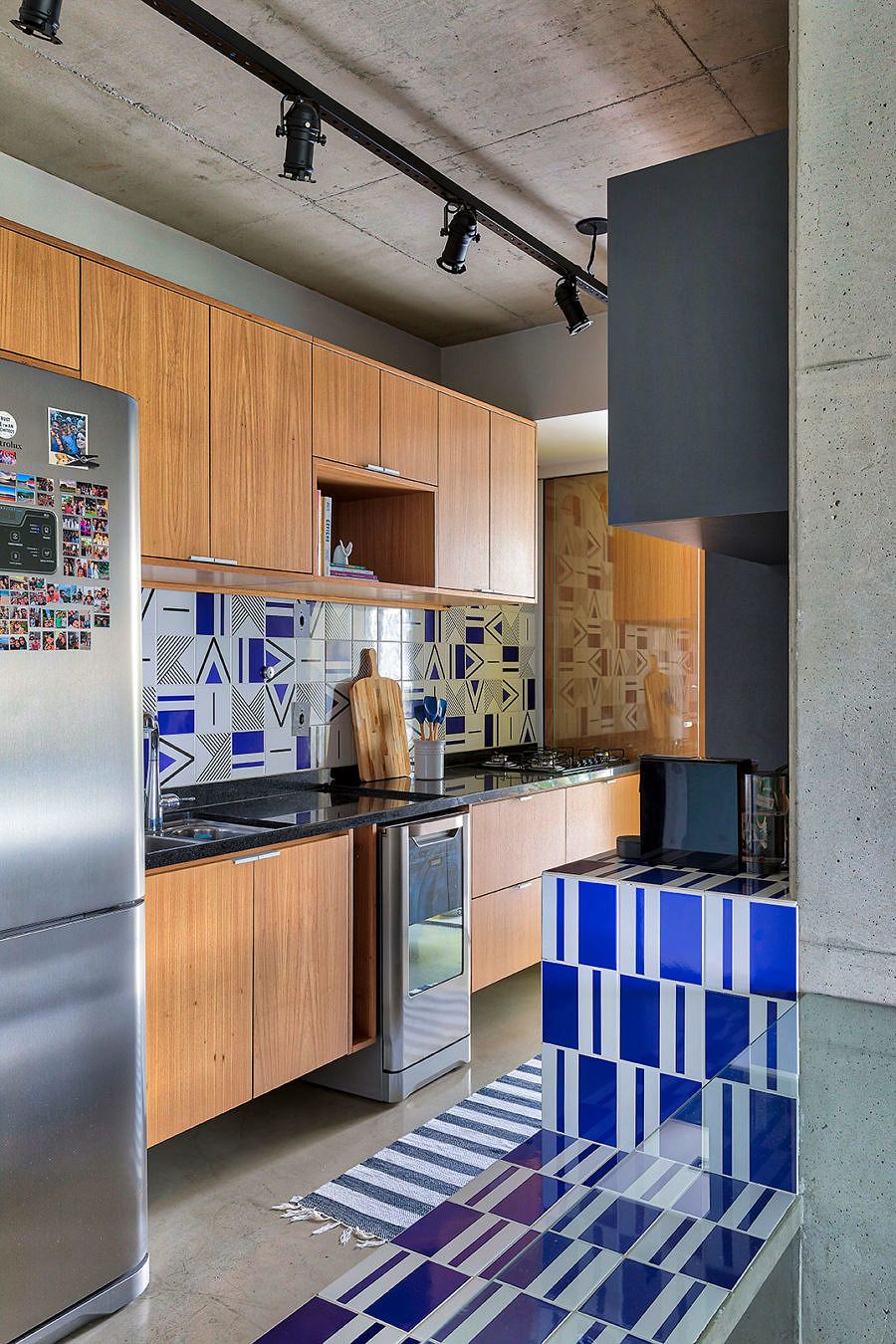 O cimento também foi matéria-prima de alguns itens do mobiliário. Tanto a bancada como o banco da cozinha foram construídos em alvenaria recobertos de azulejos brancos e azuis, criando um padrão que conversa com o frontão da pia. Um charme!