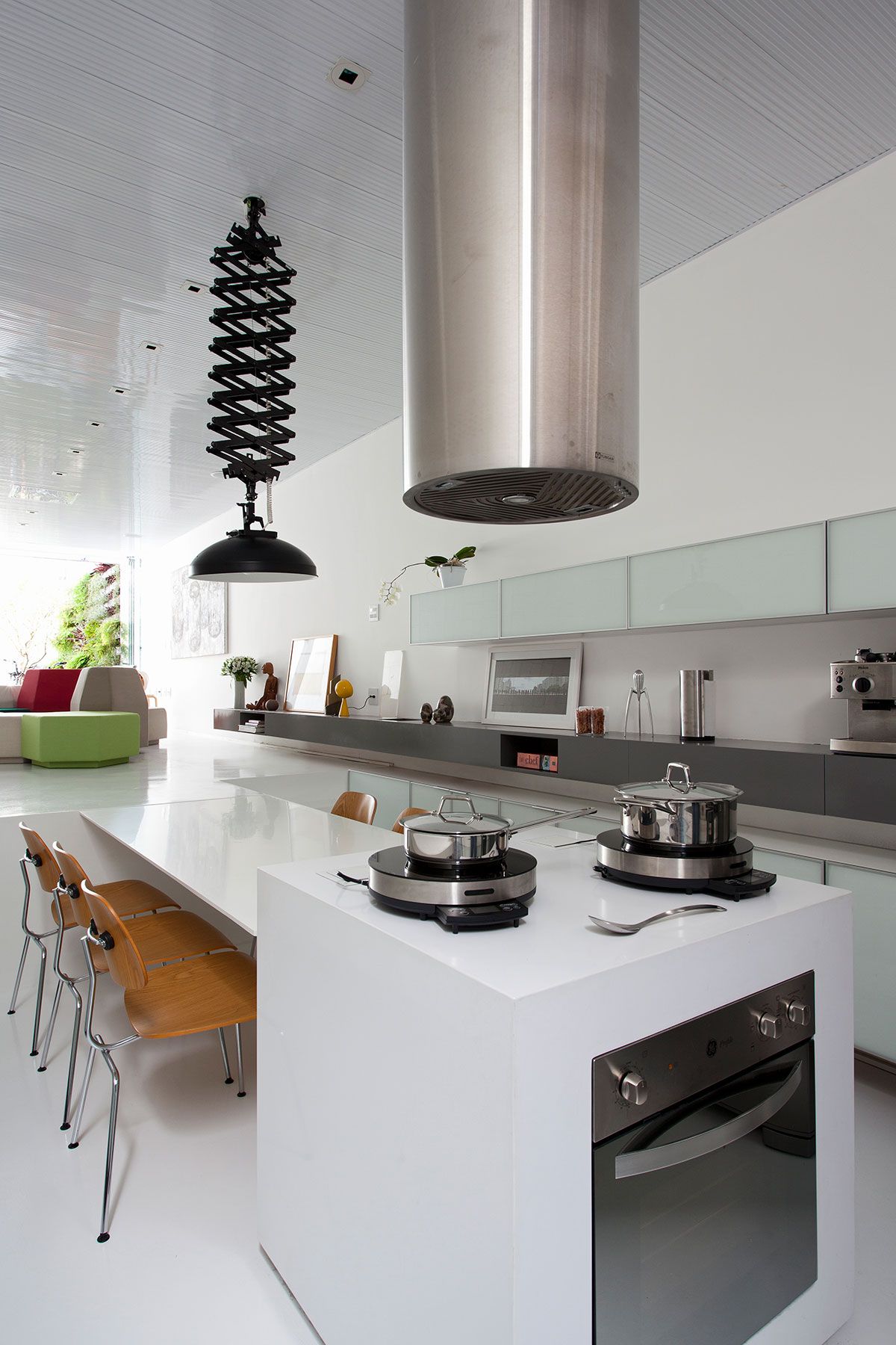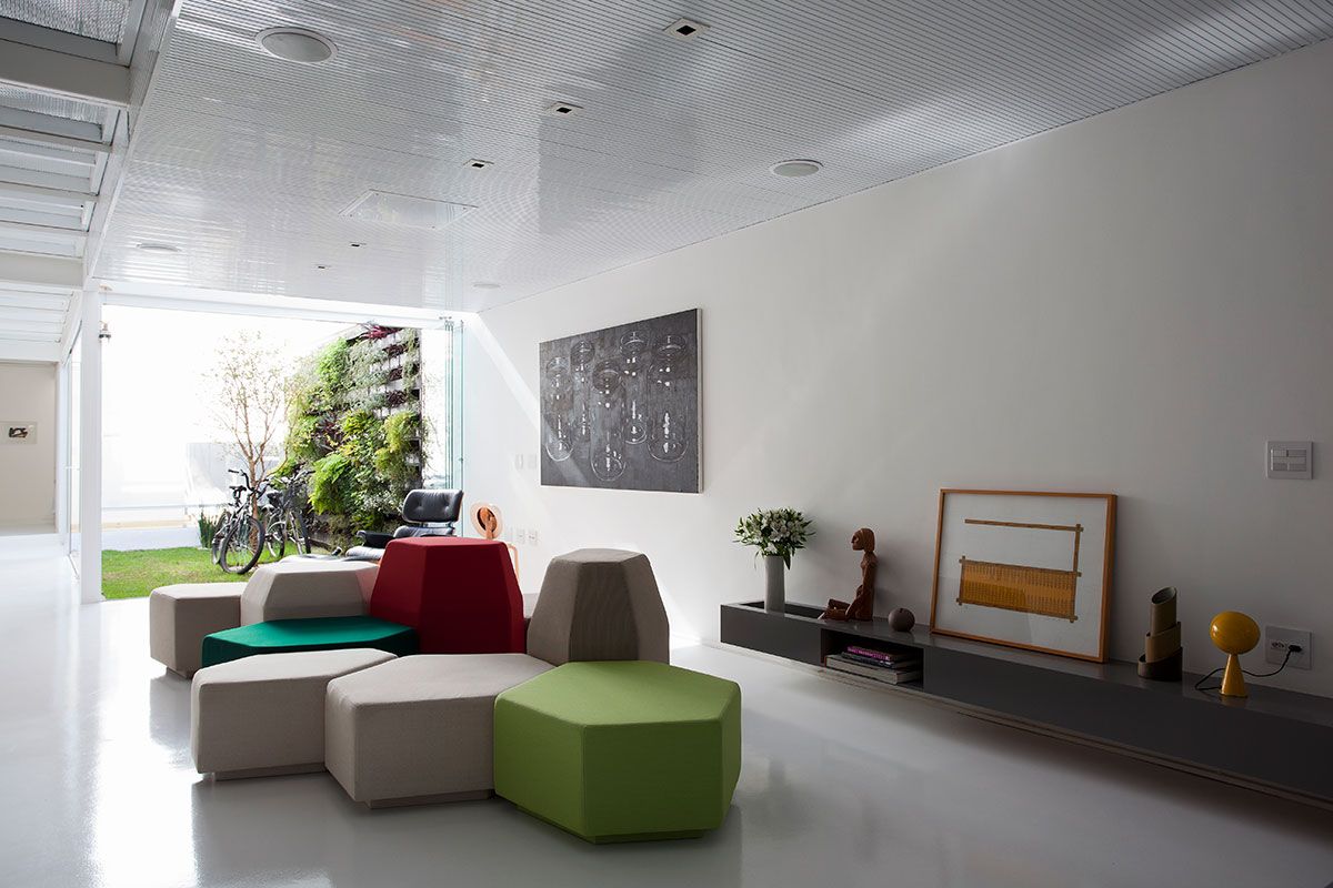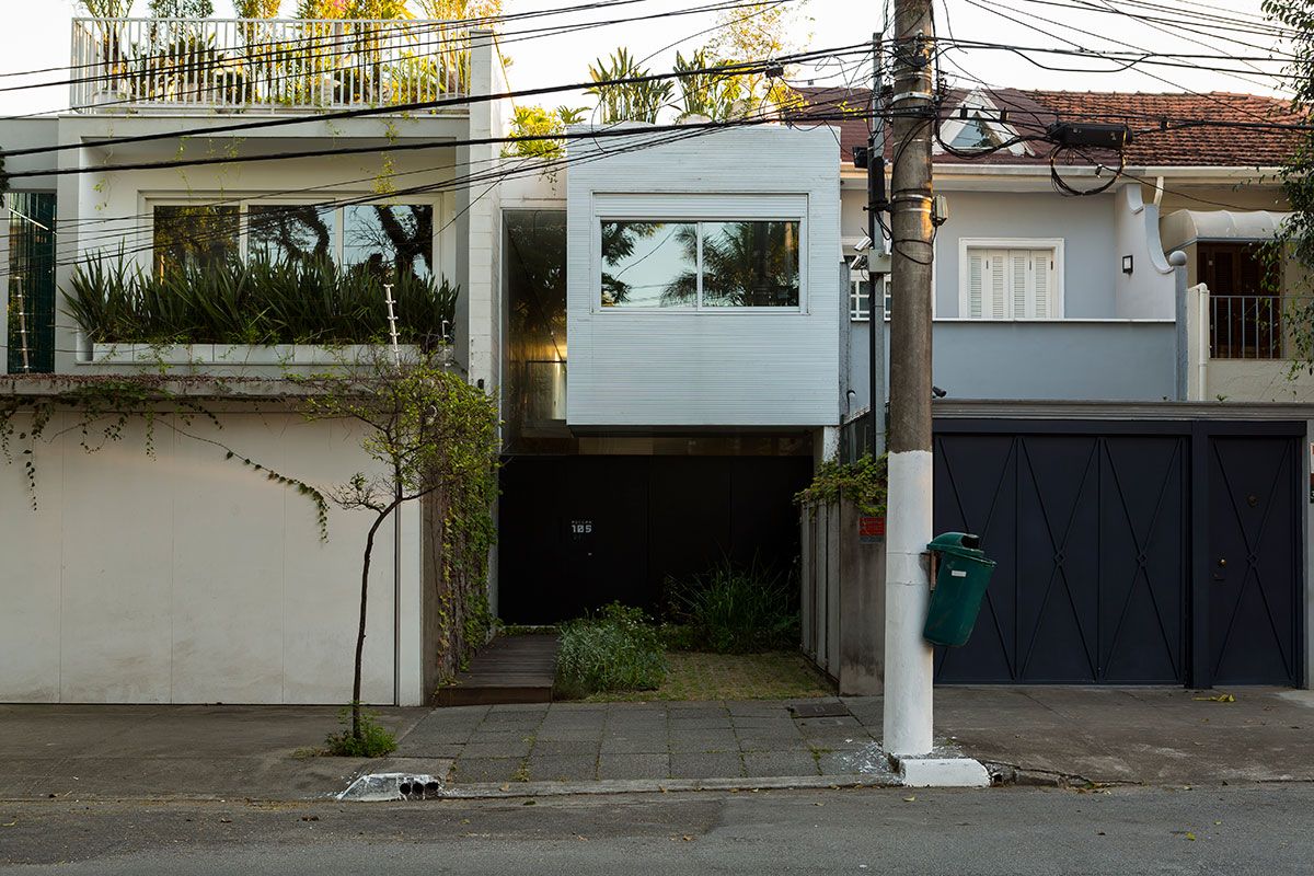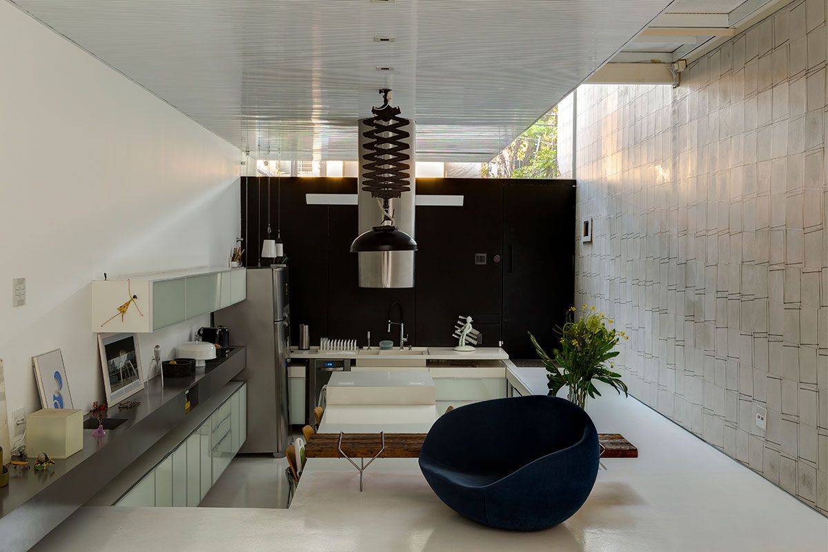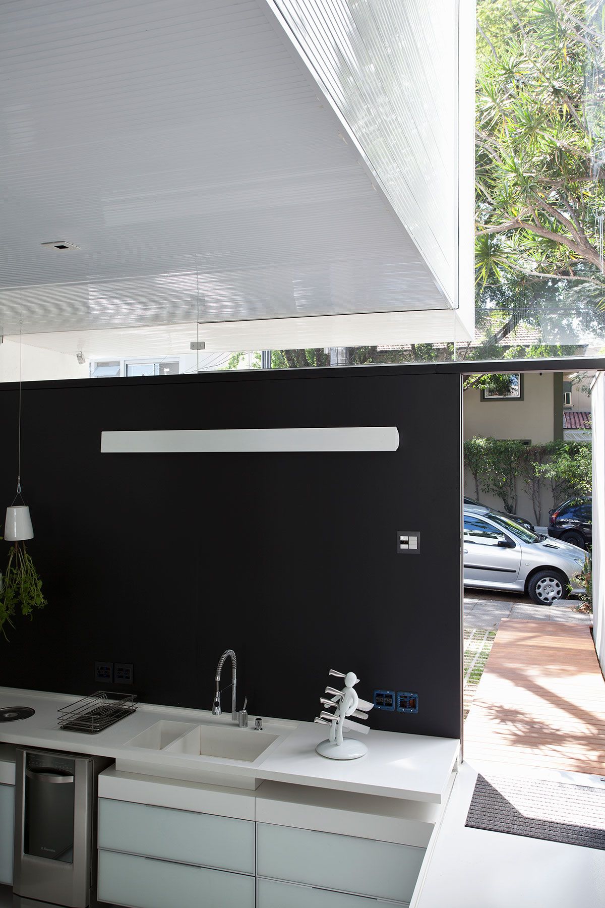 O projeto desta casa já começa pela ousadia da dupla em ter topado encarar uma obra em um terreno tão estreito – 4 metros de frente por 30 de profundidade, e depois do desafio aceito as soluções encontradas foram tão inusitadas que é impossível não repensar a maneira com que estamos habituados a viver. Mesmo que esta casa te cause uma surpresa inicial, duvido que você passe ileso pela cozinha encravada na sala, pela mesa de jantar que na verdade é uma continuidade do piso da sala, pelo jardim que se mostra presente em cada movimento e pela garagem que saiu de cena para dar vez a uma horta comunitária que resgata o que ainda resta de coletividade aqui em São Paulo.