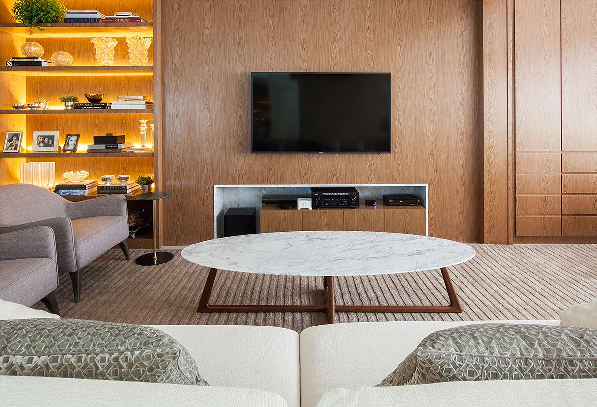 Inicialmente, o Gustavo, marido da Erika, tinha a ideia de construir uma casa em um terreno que eles já haviam adquirido, mas a arquiteta queria mesmo era morar em um apartamento que ficava bem pertinho do seu escritório. E foi pra lá que eles foram! O prédio tinha acabado de ser erguido e o apê foi entregue cru pela construtora. Super organizada, a Erika colocou na ponta do lápis tudo o que precisaria ser feito, o que eles abririam mão e o que era essencial. Pouco a pouco, o projeto foi ganhando forma e um visual único, com a cara dos moradores: “Não trocamos o piso, mas investimos na marcenaria”, explica. Na sala, o protagonista é o painel de madeira que se estende de um lado ao outro da parede do home theater e se transforma em estante e armários mimetizados.