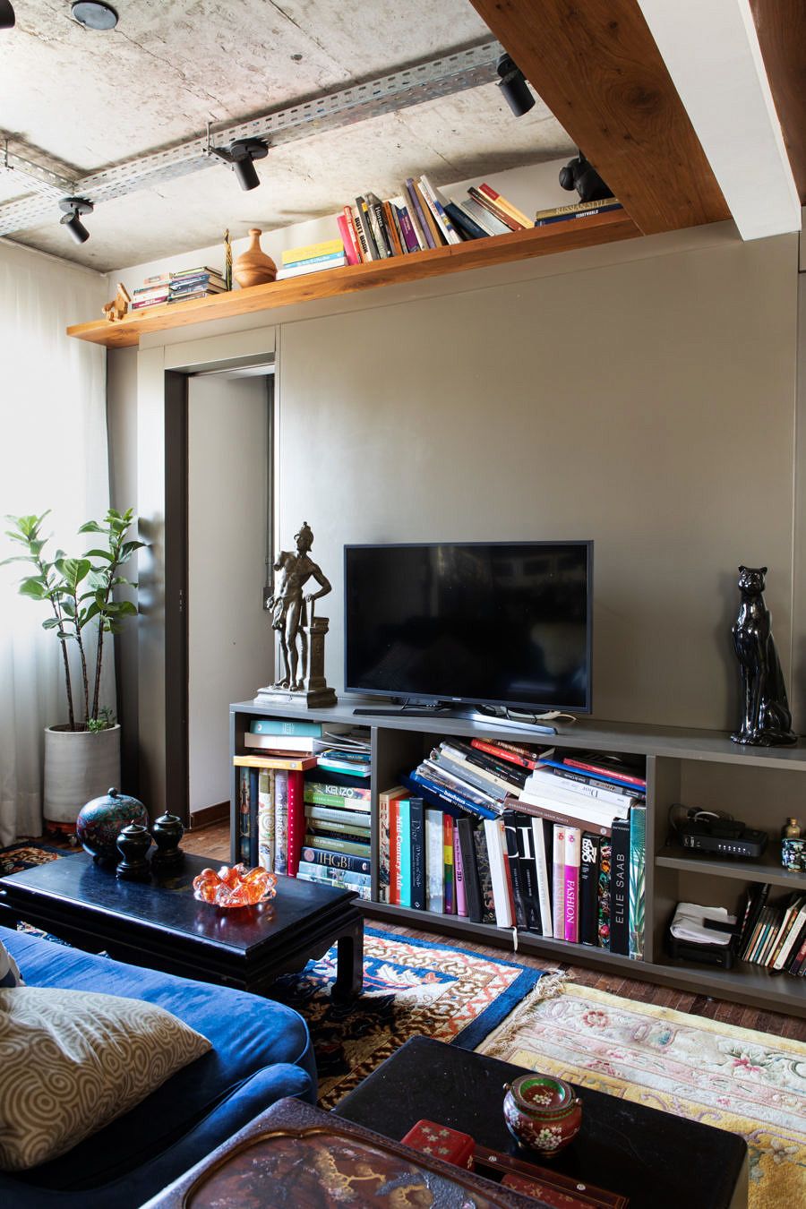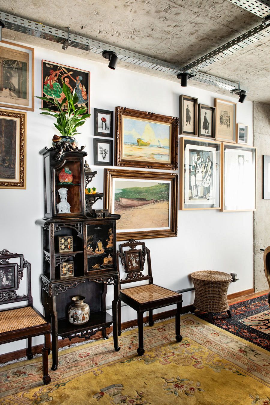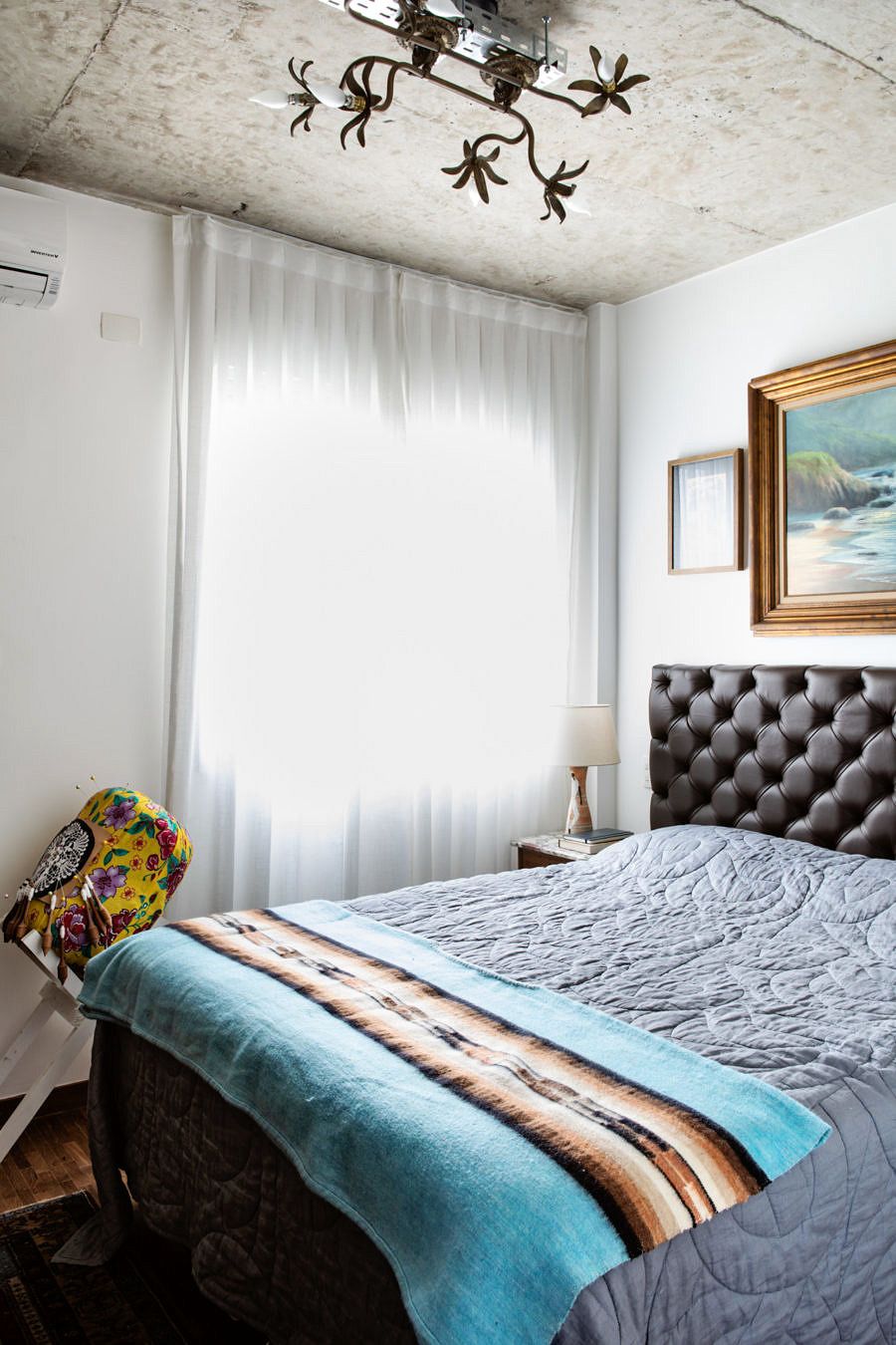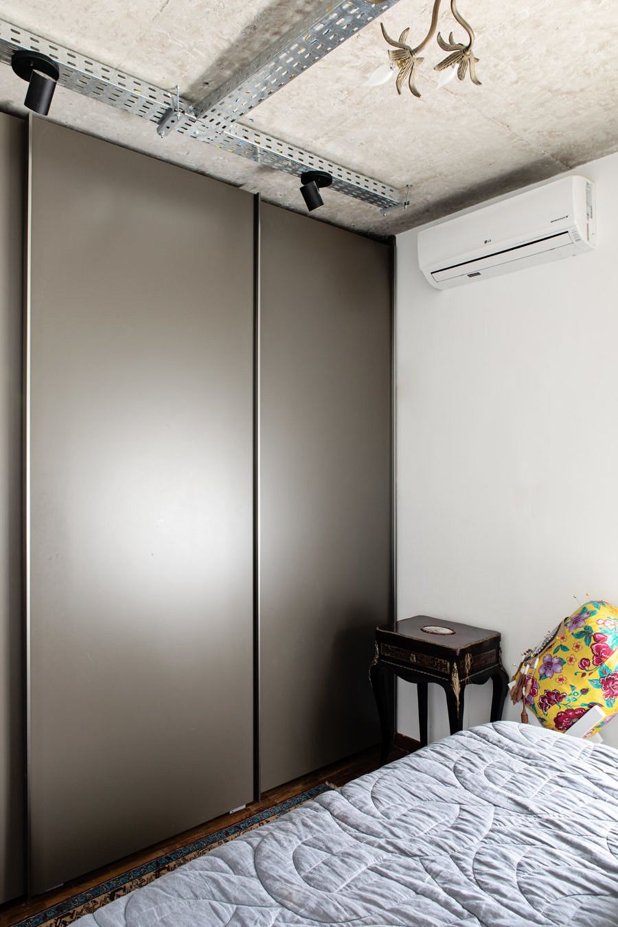 Seguindo o mesmo estilo do living, a decoração da suíte faz uma mistura – ousada, mas equilibrada – de objetos antigos e modernos. Repara no contraste lindo que o Gabe e a Ju criaram ao instalar a luminária art nouveau no perfil metálico sobre a laje exposta! Acho que esse pequeno cuidado estético resume com precisão o conceito de todo projeto.
