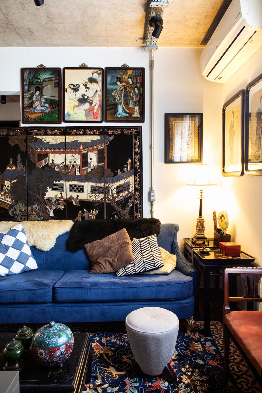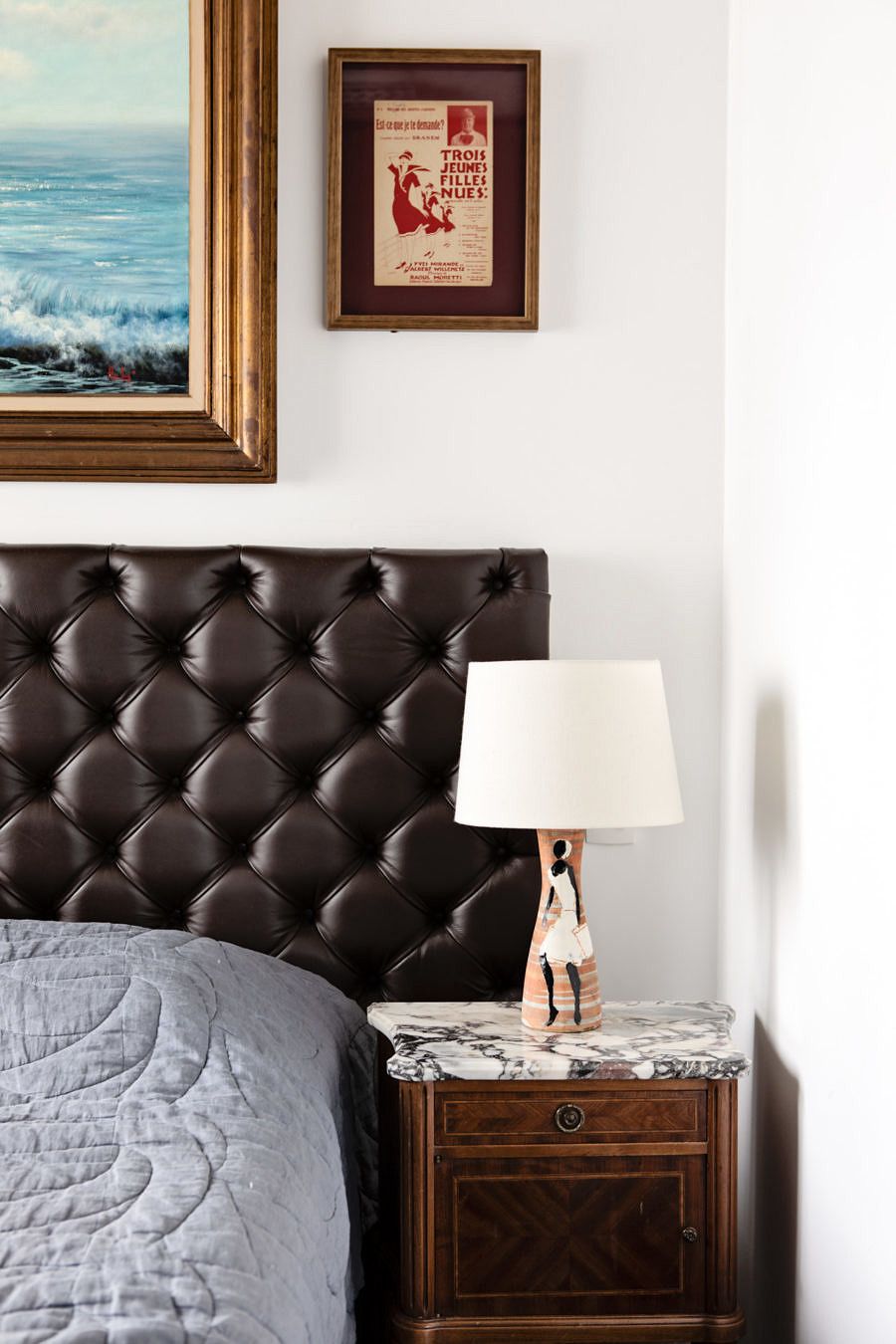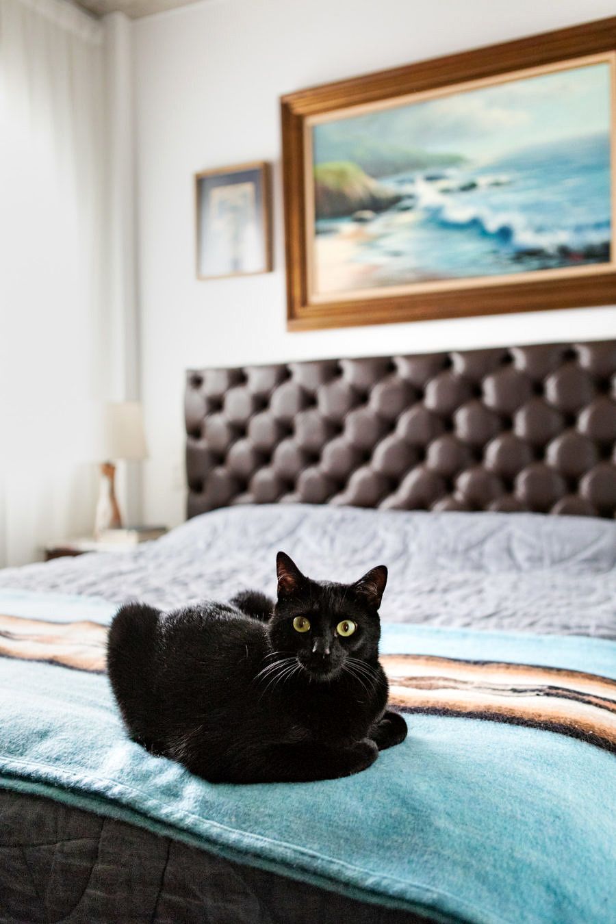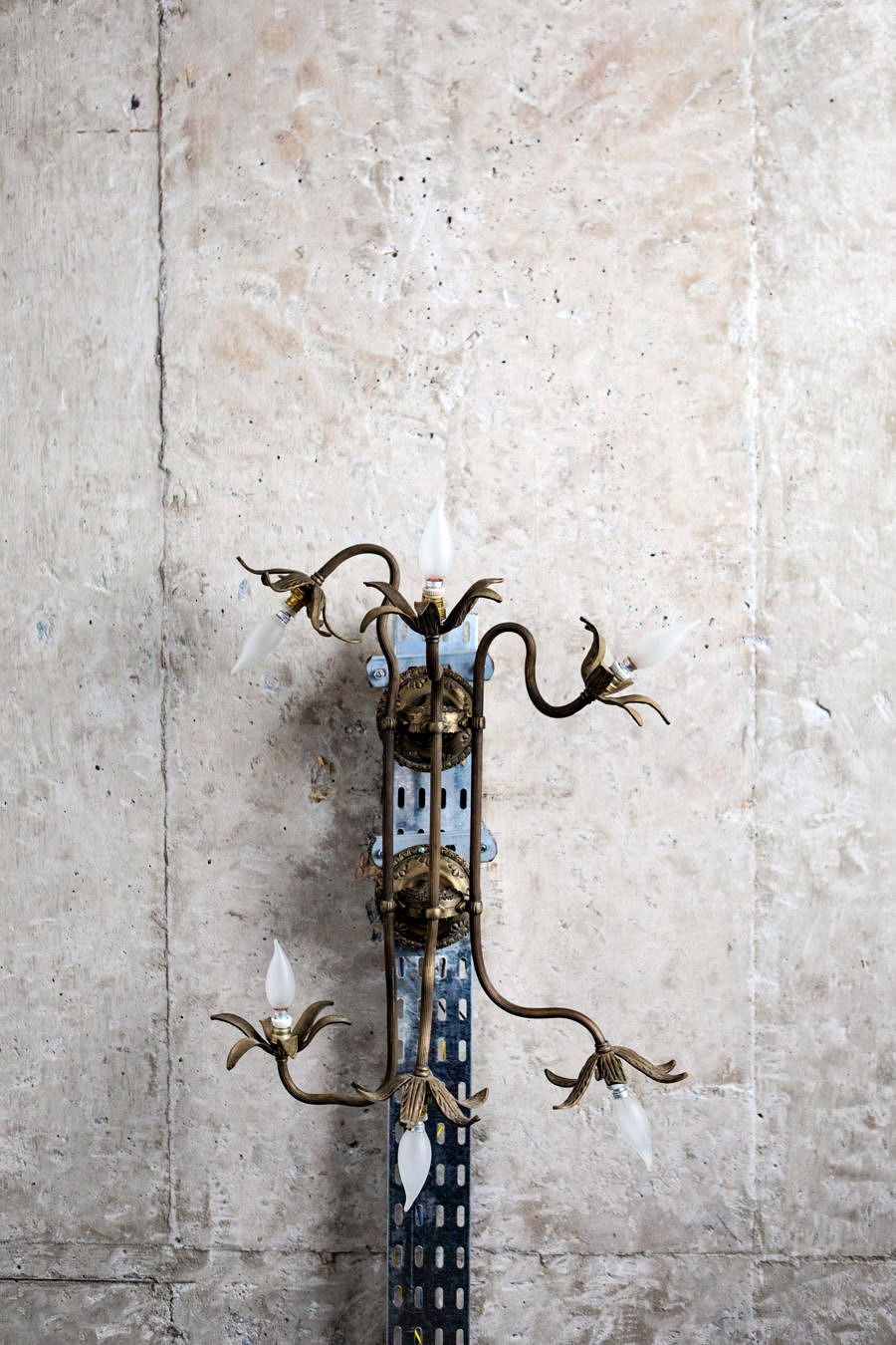 Seguindo o mesmo estilo do living, a decoração da suíte faz uma mistura – ousada, mas equilibrada – de objetos antigos e modernos. Repara no contraste lindo que o Gabe e a Ju criaram ao instalar a luminária art nouveau no perfil metálico sobre a laje exposta! Acho que esse pequeno cuidado estético resume com precisão o conceito de todo projeto.
