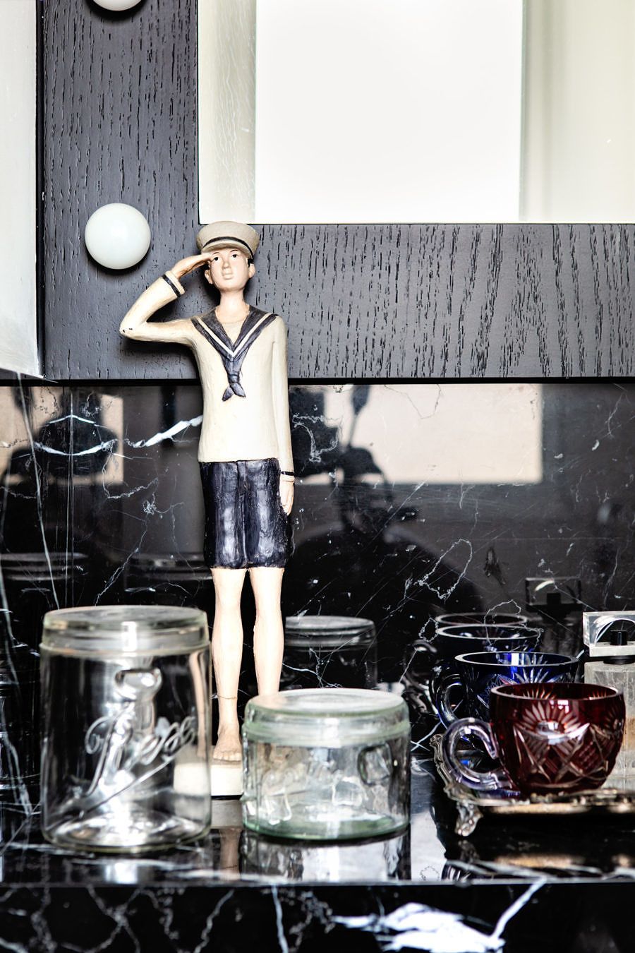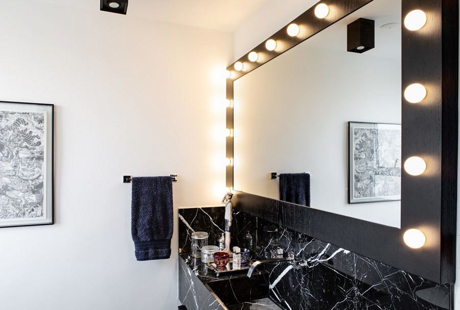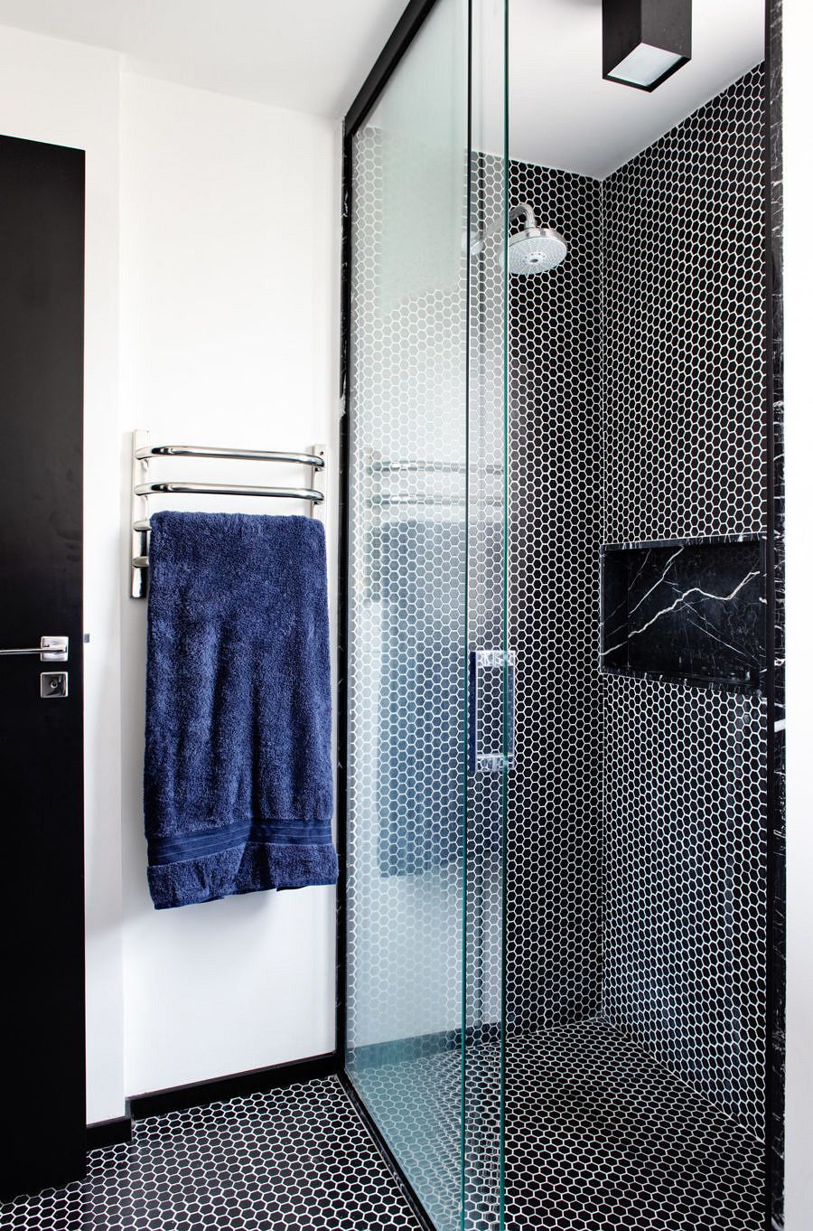 Lembra que o imóvel contava originalmente com dois quartos e que um deles foi aberto para sala? Pois essa solução ressoou lá na suíte, que passou a abrigar um banheiro superespaçoso.  Isso porque o banheiro que antes atendia ao segundo dormitório foi completamente integrado com o do Gabriel, duplicando a metragem do ambiente. “Desde o princípio sabia que ele queria um décor preto nesse cômodo. Dessa forma, sugerimos as pastilhas hexagonais em contraste com o mármore nero e asparedes brancas”, explica a arquiteta. Essa mudança estrutural resultou também na criação de um corredor que possibilitou a ampliação do armário – para a satisfação do morador que precisava de mais espaço para armazenar suas roupas.