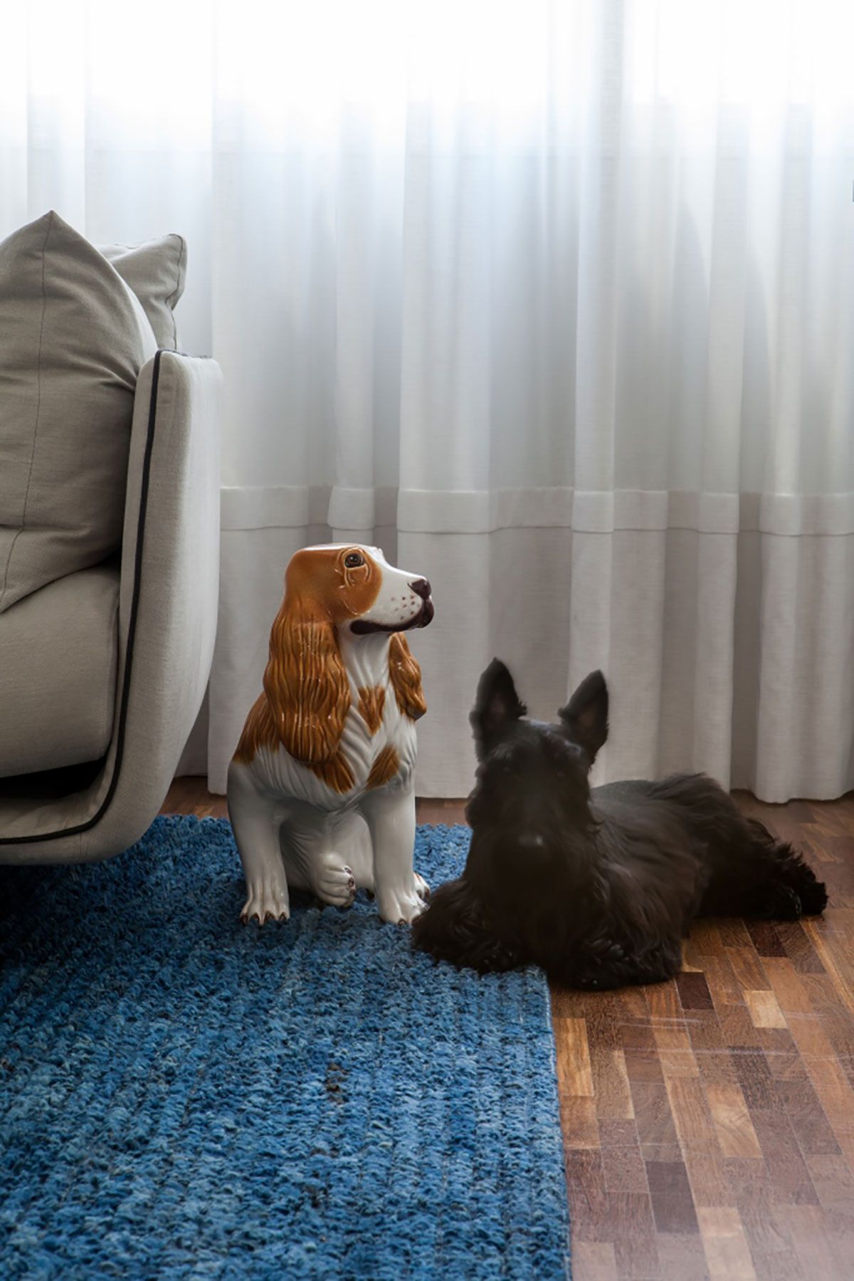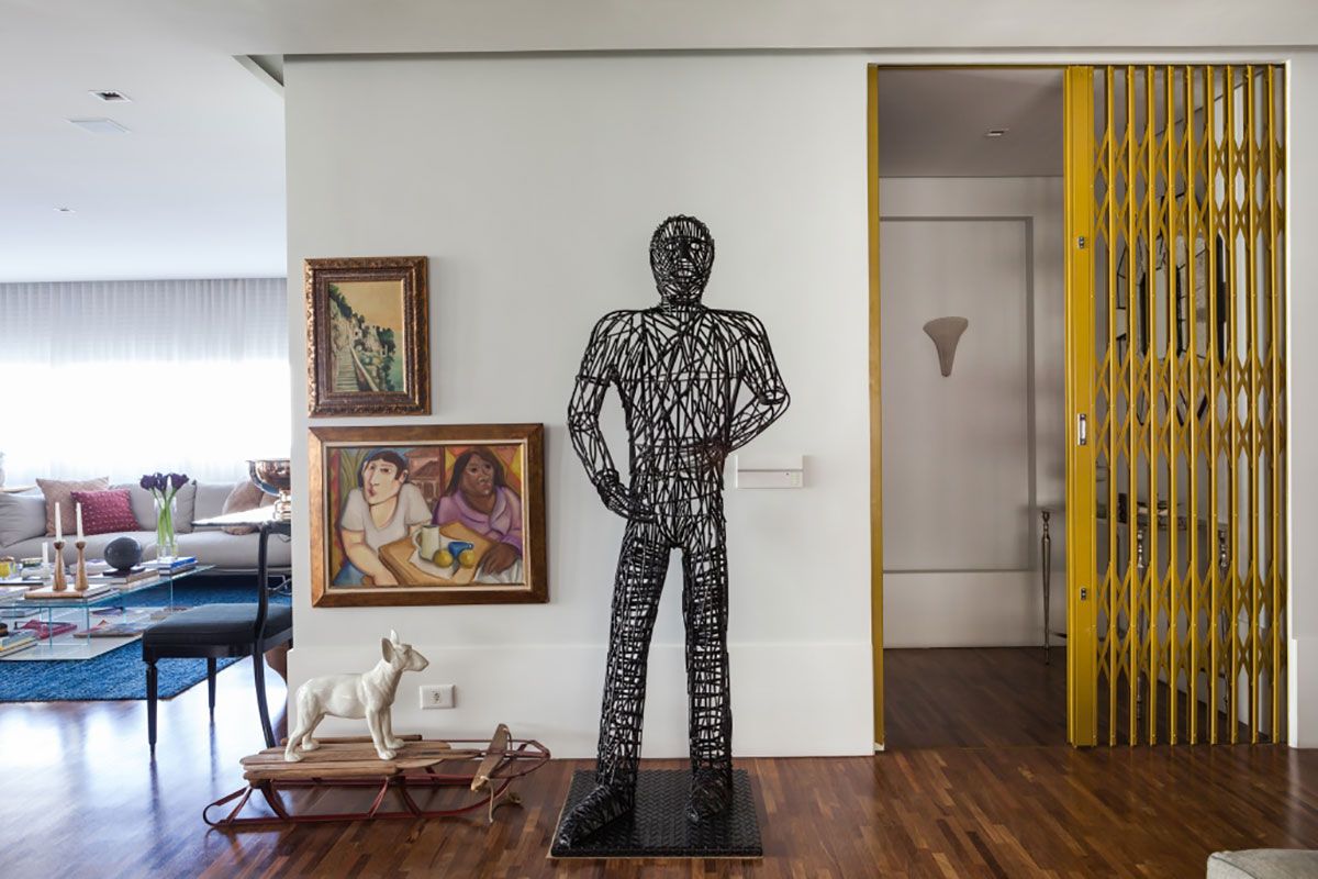 Um detalhe que gostei demais do apartamento do Gil foi o seguinte: algumas peças especiais foram herdadas da família, como as poltroninhas francesas e o antigo trenó que recebe o cachorrinho branco da coleção de dogs do designer.