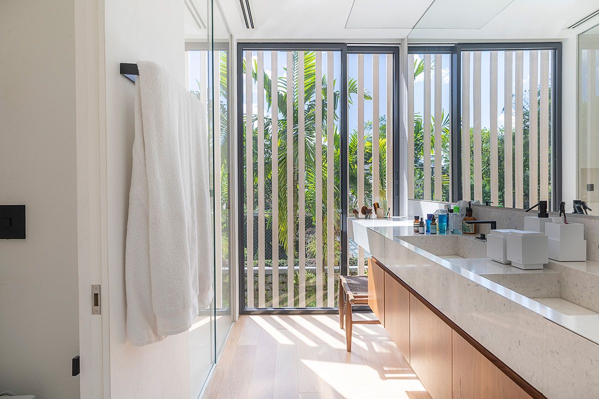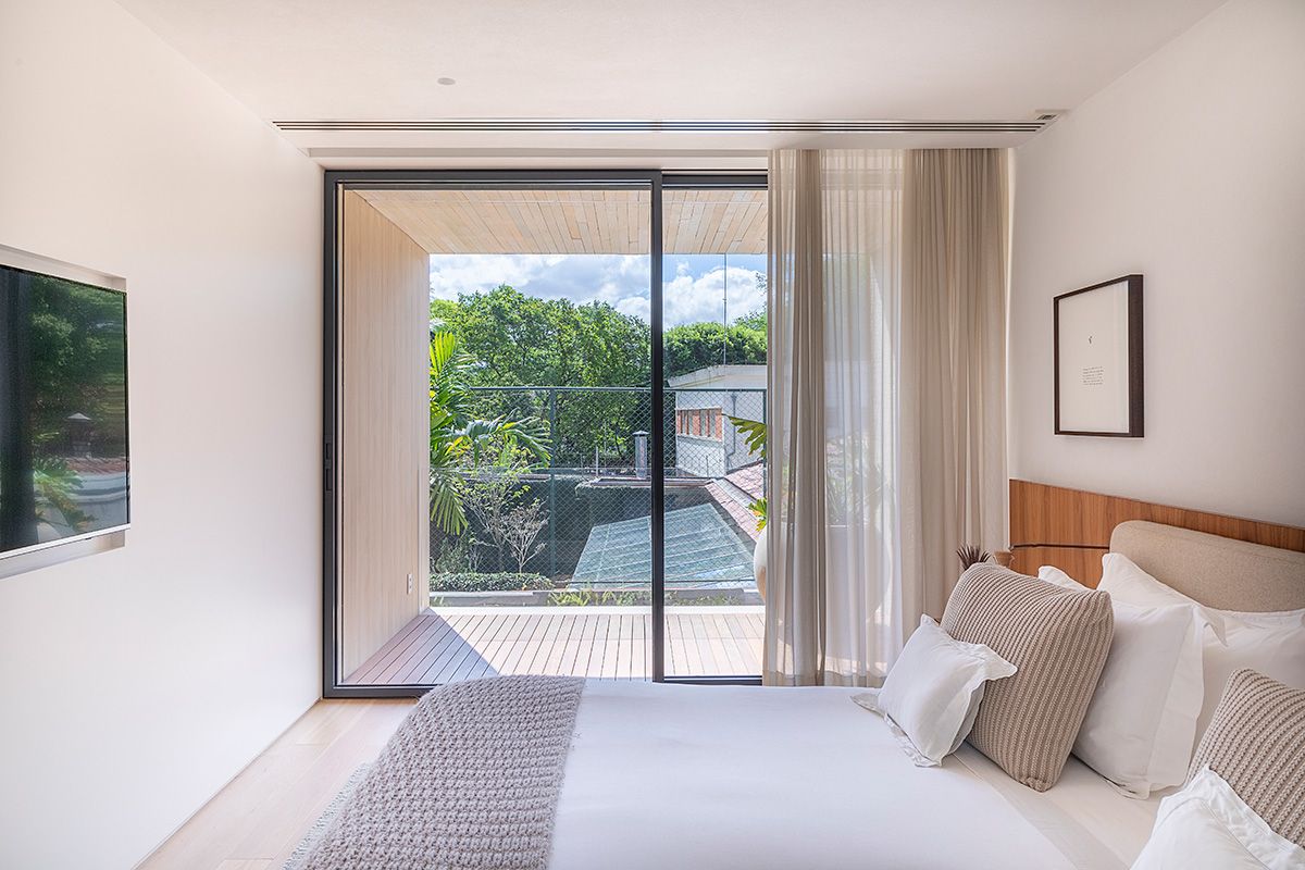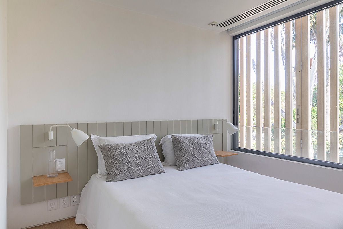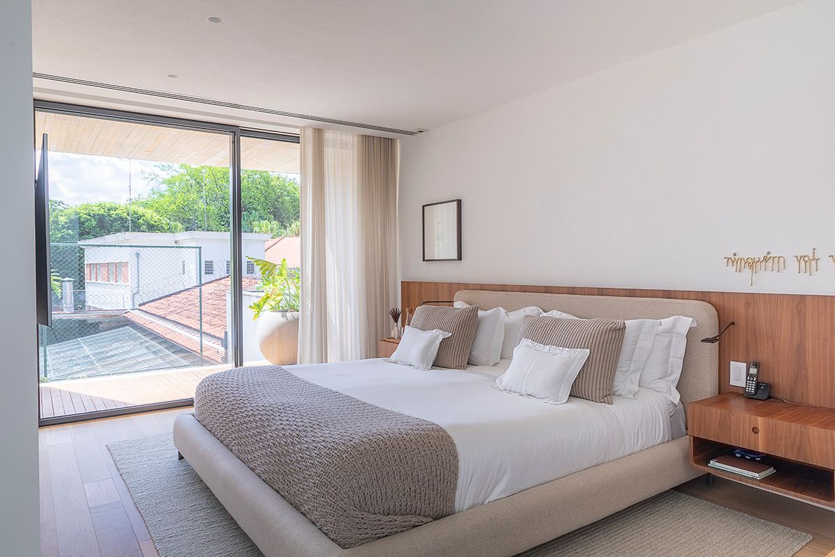 Esse andar da casa transmite paz e relaxamento, dá para sentir a diferença da atmosfera da área social onde o casal ama receber. A suíte deles é aconchegante, além de toda a arquitetura, a Giovana e sua sócia Amanda pensaram e desenharam detalhes como a cama, marcenaria do closet, e projetaram um banheiro todo aberto para uma vista maravilhosa das copas das árvores: