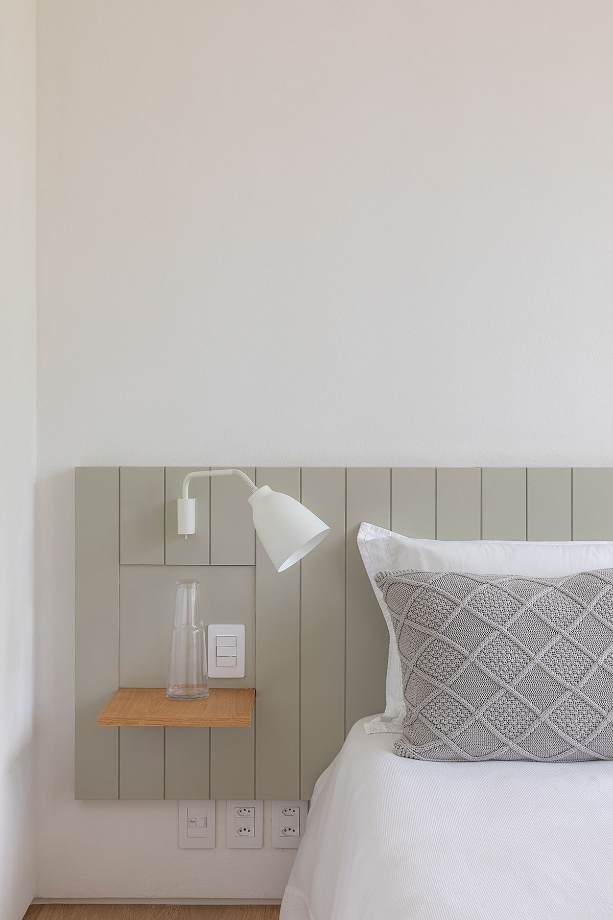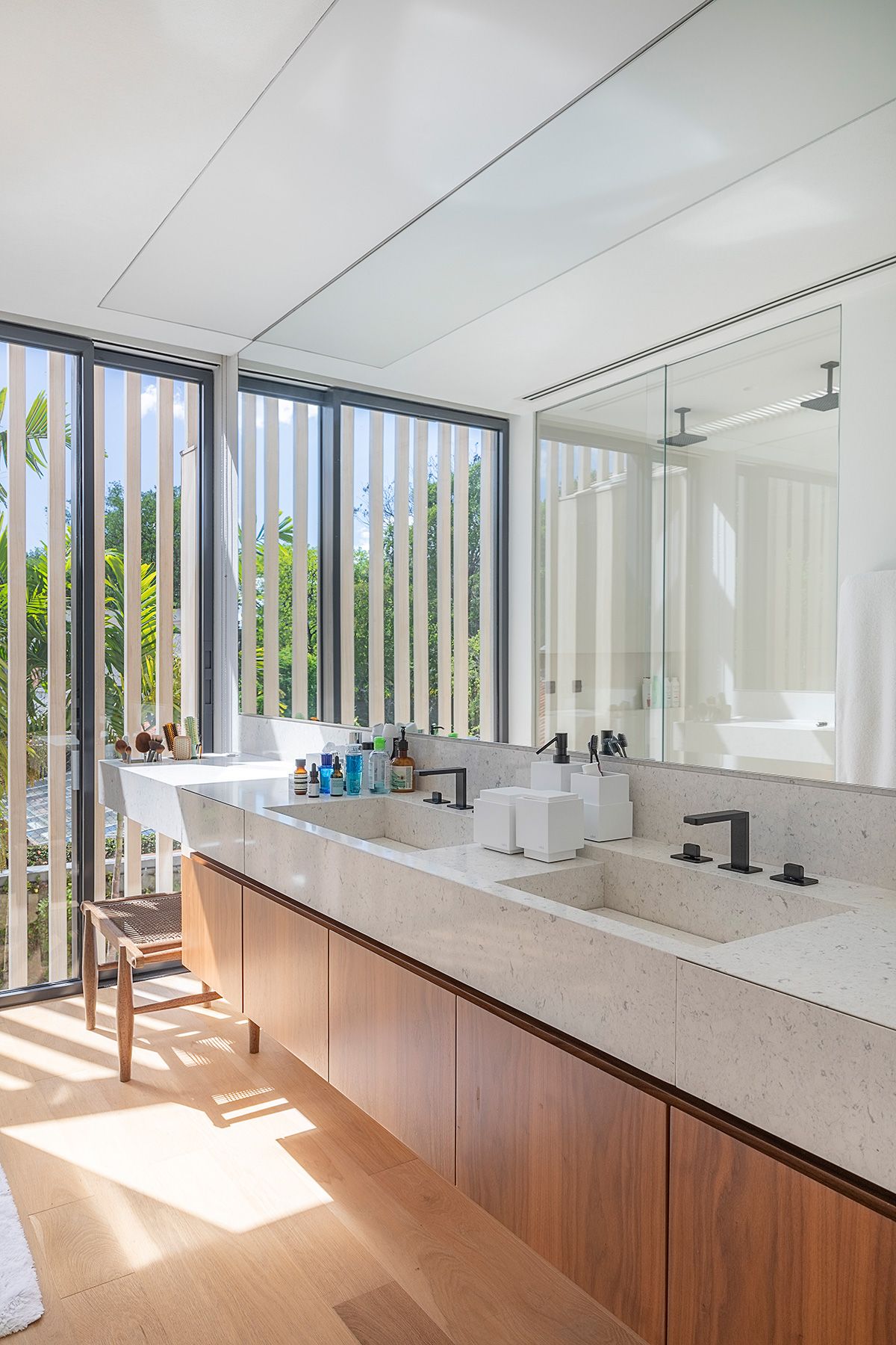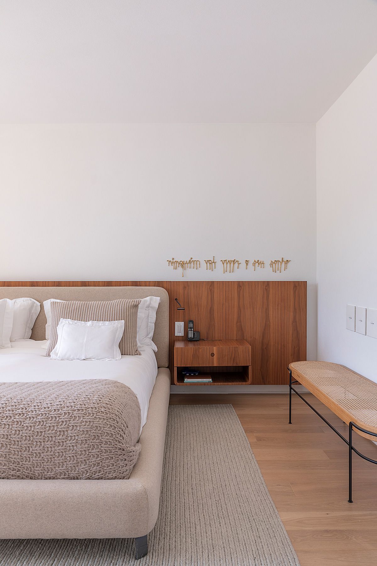 Esse andar da casa transmite paz e relaxamento, dá para sentir a diferença da atmosfera da área social onde o casal ama receber. A suíte deles é aconchegante, além de toda a arquitetura, a Giovana e sua sócia Amanda pensaram e desenharam detalhes como a cama, marcenaria do closet, e projetaram um banheiro todo aberto para uma vista maravilhosa das copas das árvores: