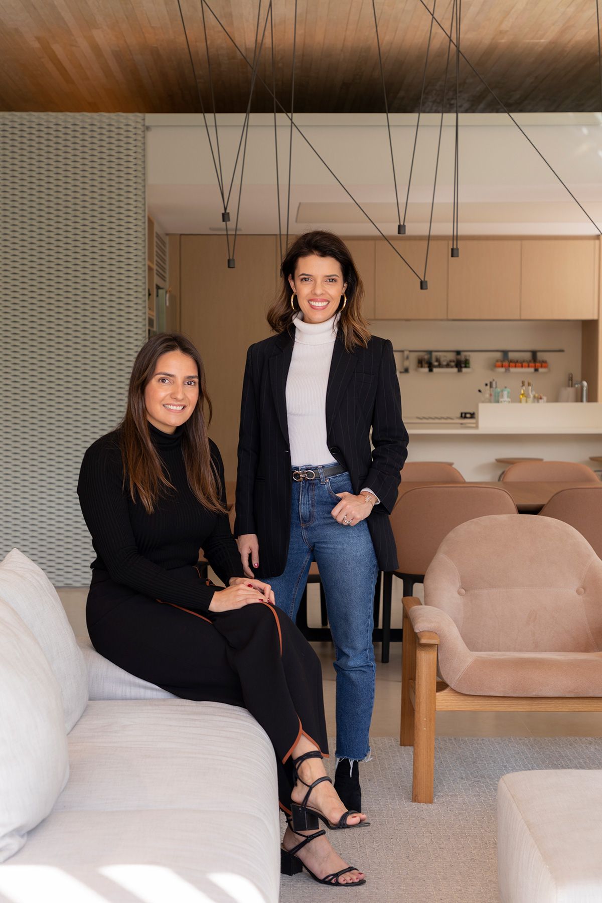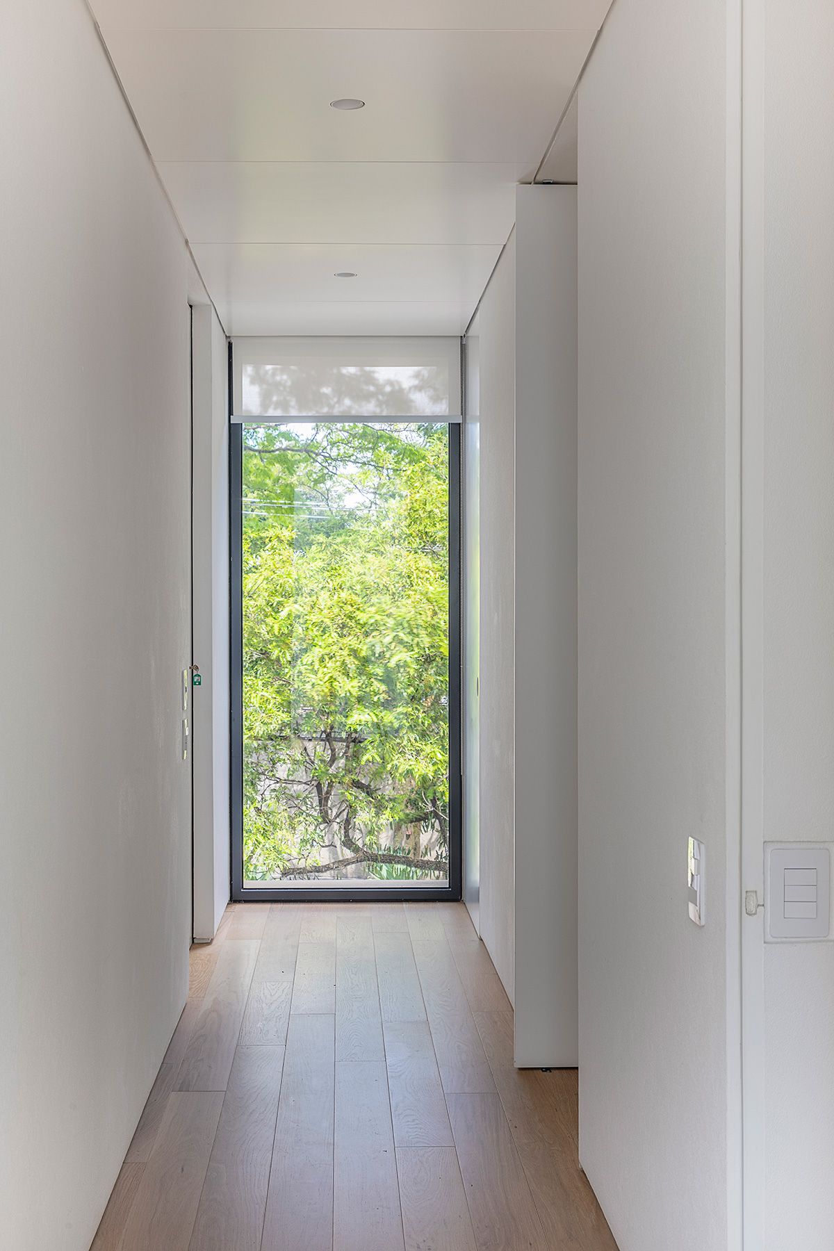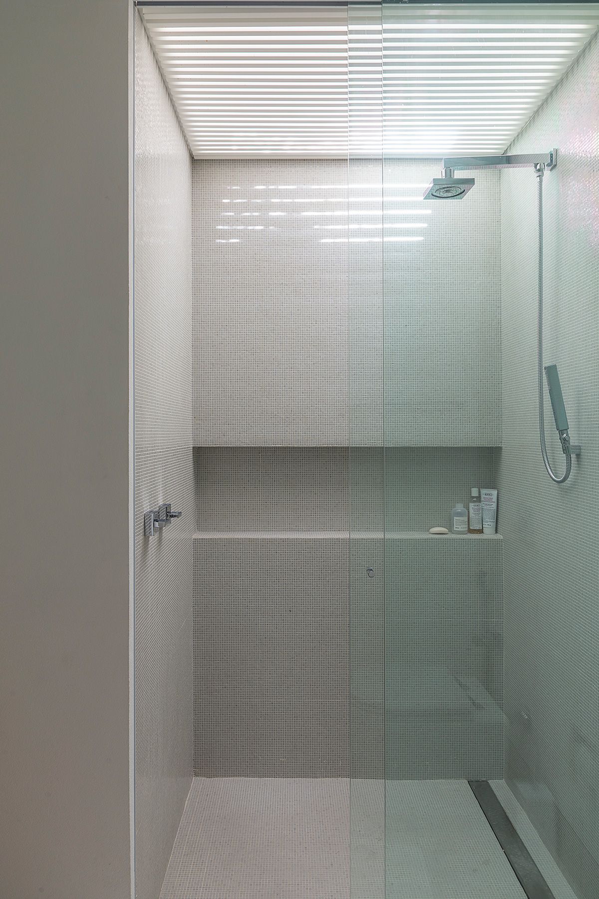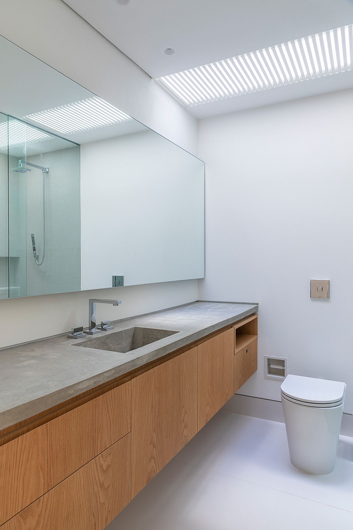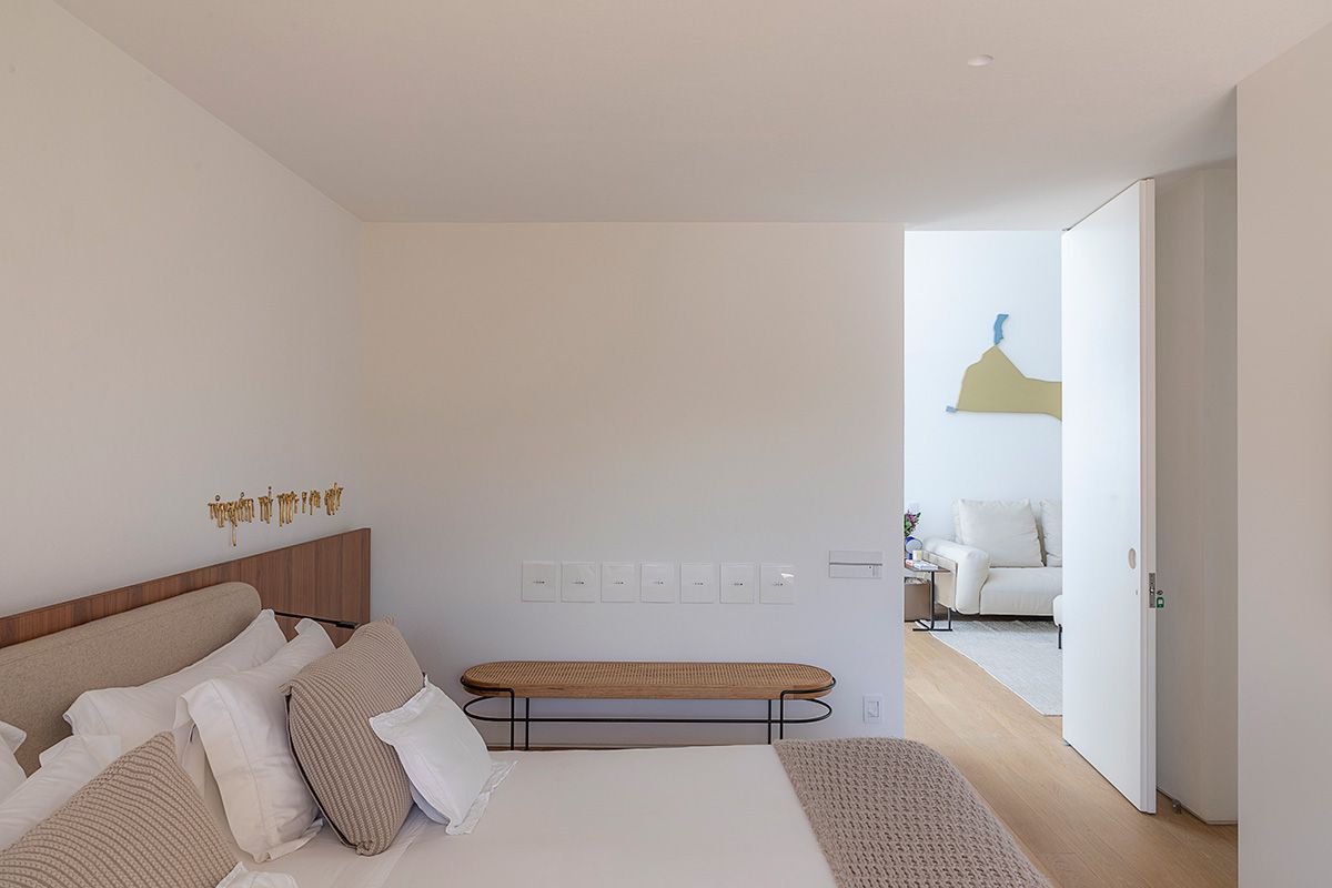 Subindo as escadas para a área íntima, a Giovana me levou até as duas suítes de hóspedes que são lindas e arejadas, todos os banheiros são ventilados com domus, que funciona super bem aliás. Além da iluminação natural que é um show a parte, o projeto luminotécnico desenvolvido pela Illuz veio para valorizar ainda mais cada detalhe da arquitetura e interiores.