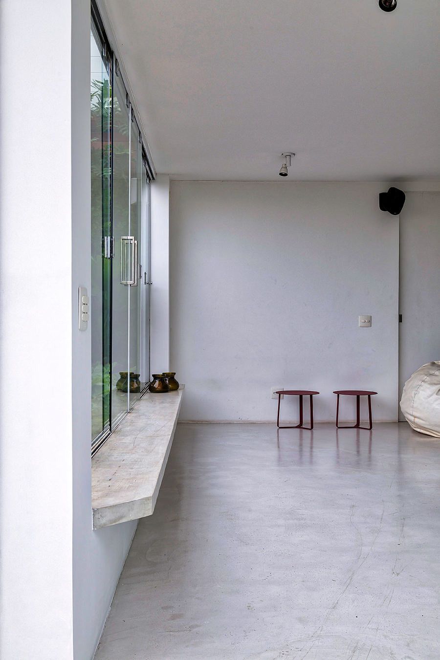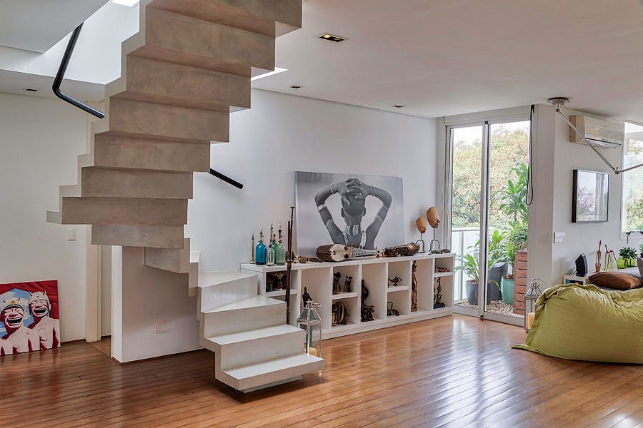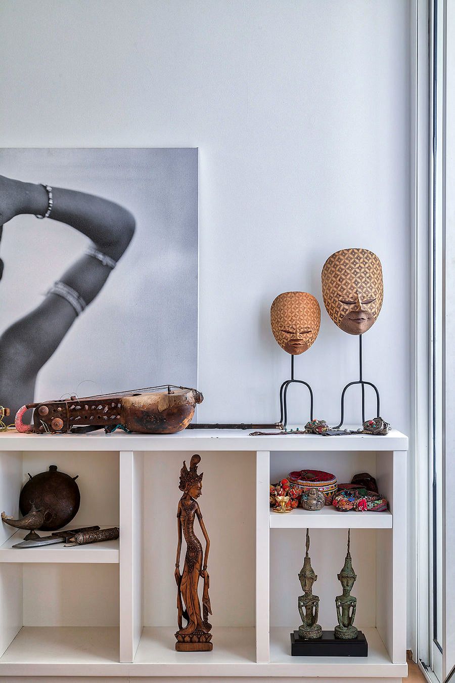 “O cimento queimado pode ser base para qualquer estilo. Aqui, ele é fundo para as nossas criações. Gostamos muito de viajar e trazer essas memorias pra dentro de casa. Isso veio, inclusive, de uma forma desordenada. Eu não sei se eles estão compondo na decoração da melhor maneira, mas para nós faz muito sentido. Acho que viver bem é viver com a cara da gente”.
