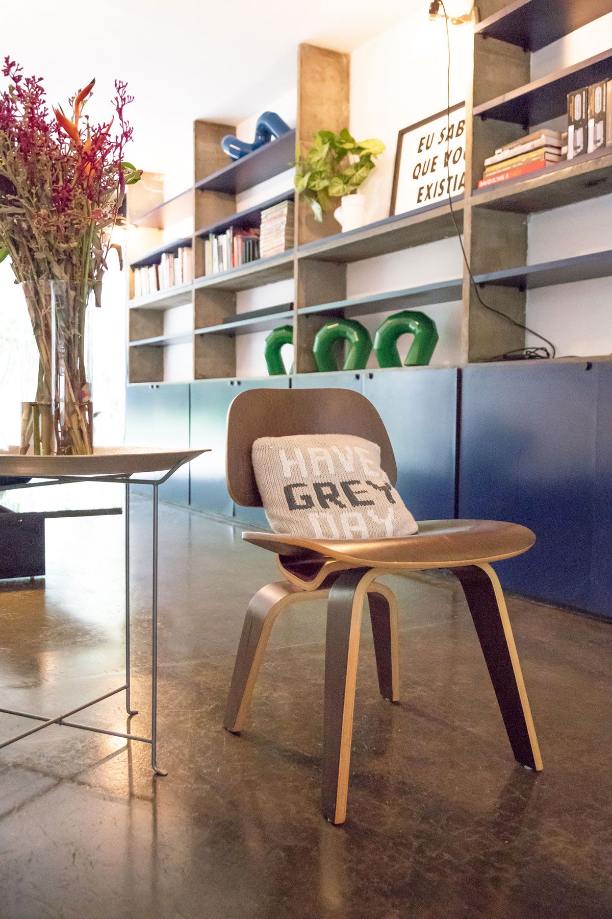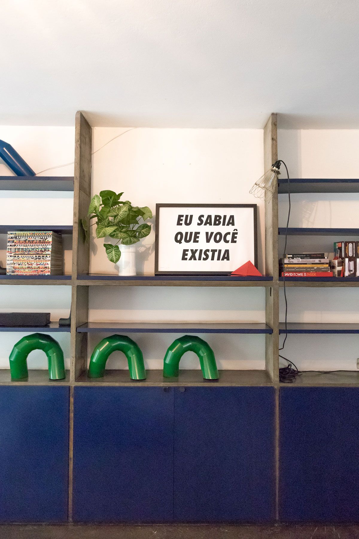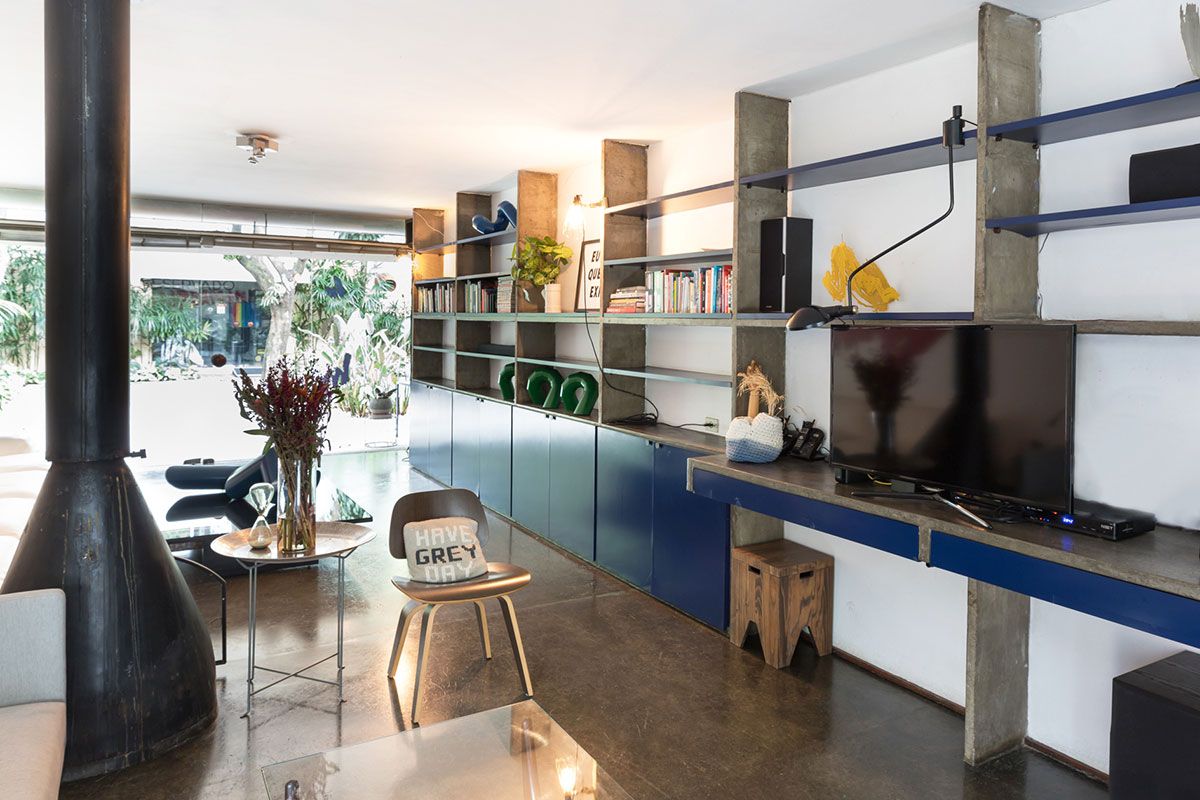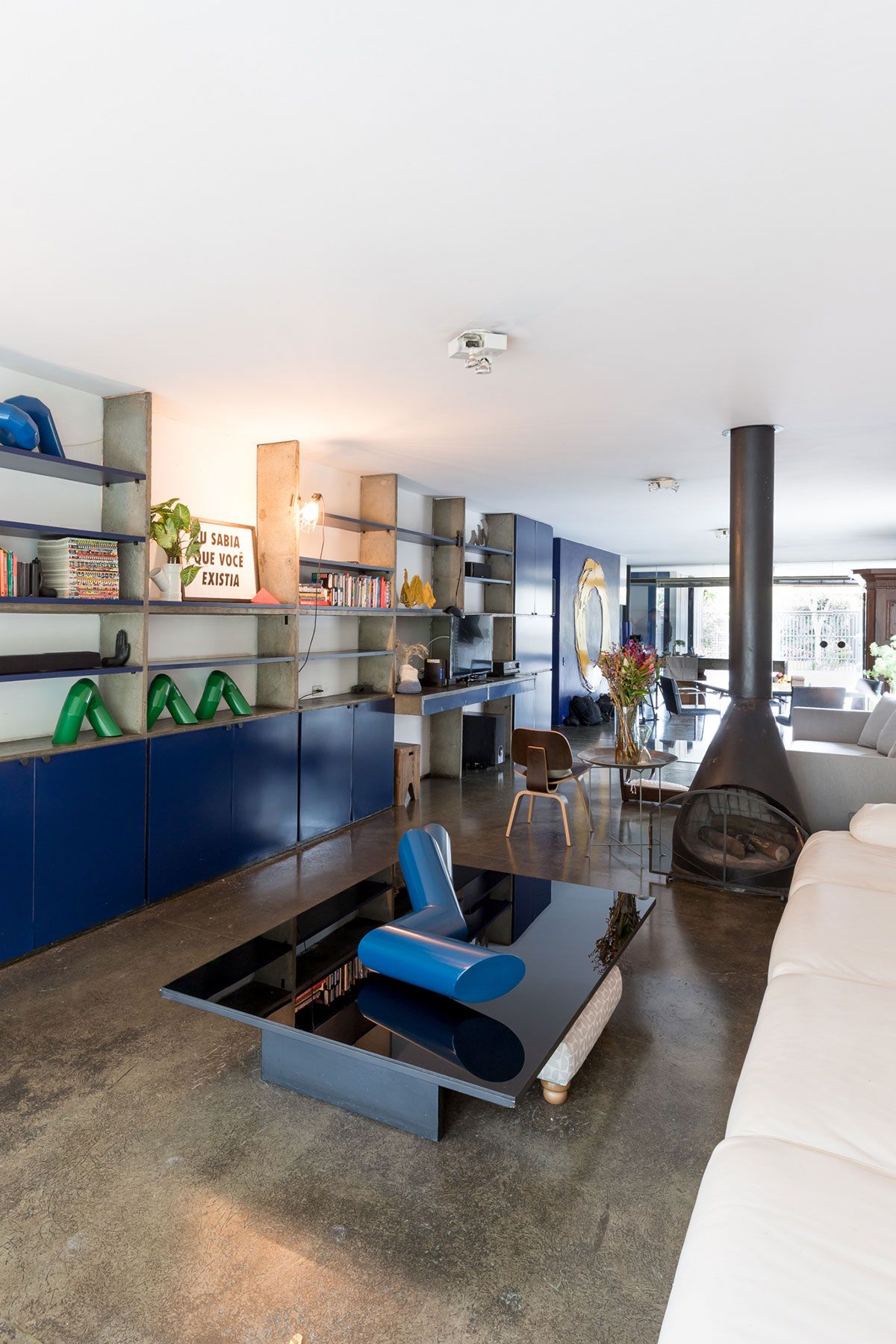 Apesar de ser um imóvel alugado, os moradores conseguiram dar a ele uma cara particular sem precisar mexer na sua estrutura. Os espaços amplos e as linhas retas serviram como inspiração para a decoração, que se aproxima de uma estética minimalista: poucos, mas significativos, móveis e objetos. Algumas alterações que foram feitas pelo dono da casa permanecem até hoje e foram assumidas no décor. Uma delas foi a instalação das estantes em marcenaria com portas em fórmica azul que se transformaram no ponto focal do living. Outra peça que veio com a casa foi o armário antigo feito em madeira maciça que diverge totalmente do estilo da construção. Inicialmente, a Helena queria tirá-lo da sala, mas o seu tamanho e peso dificultaram a tarefa. No fim, a peça permaneceu no seu lugar e, com o tempo, acabou ganhando o coração da estilista.