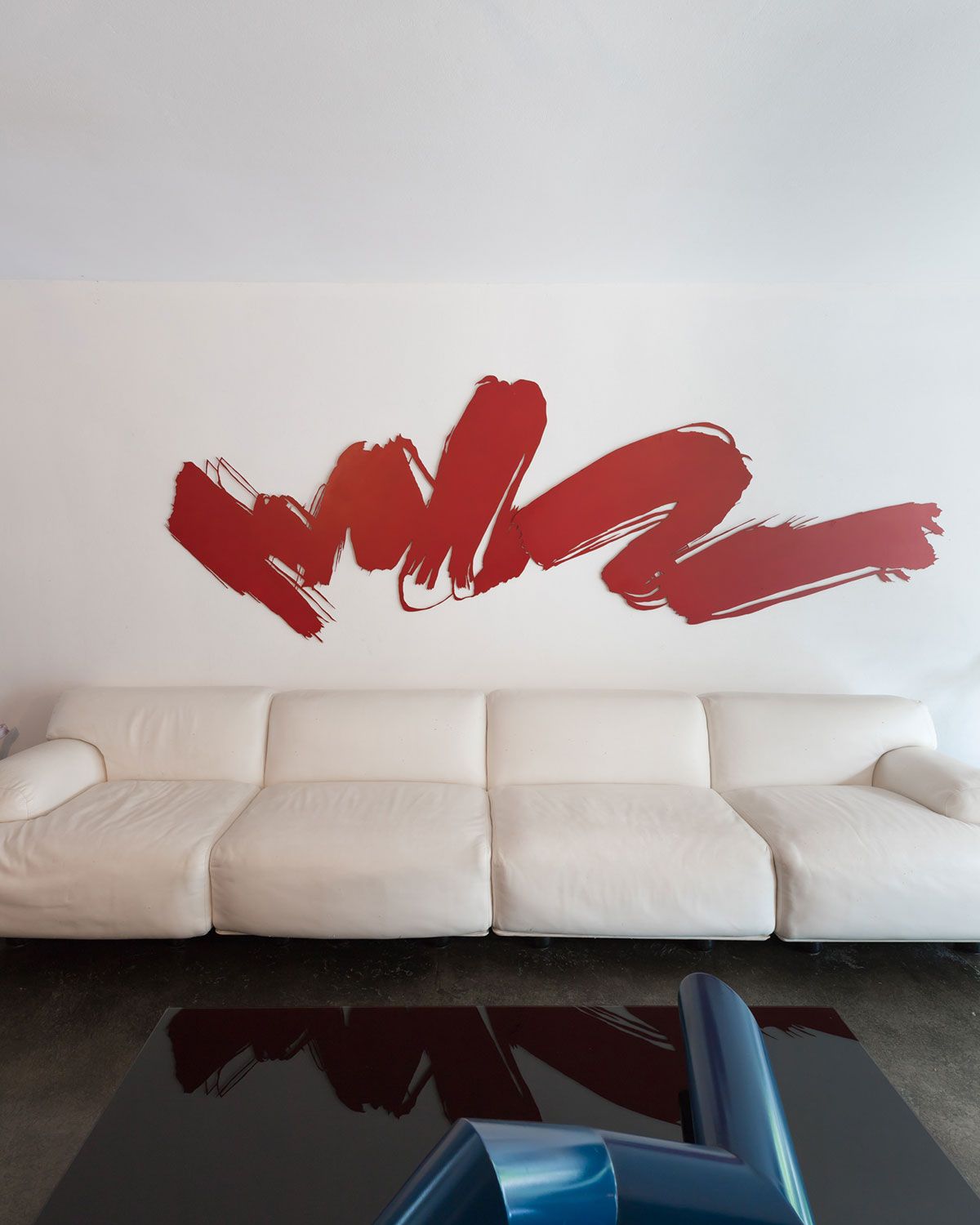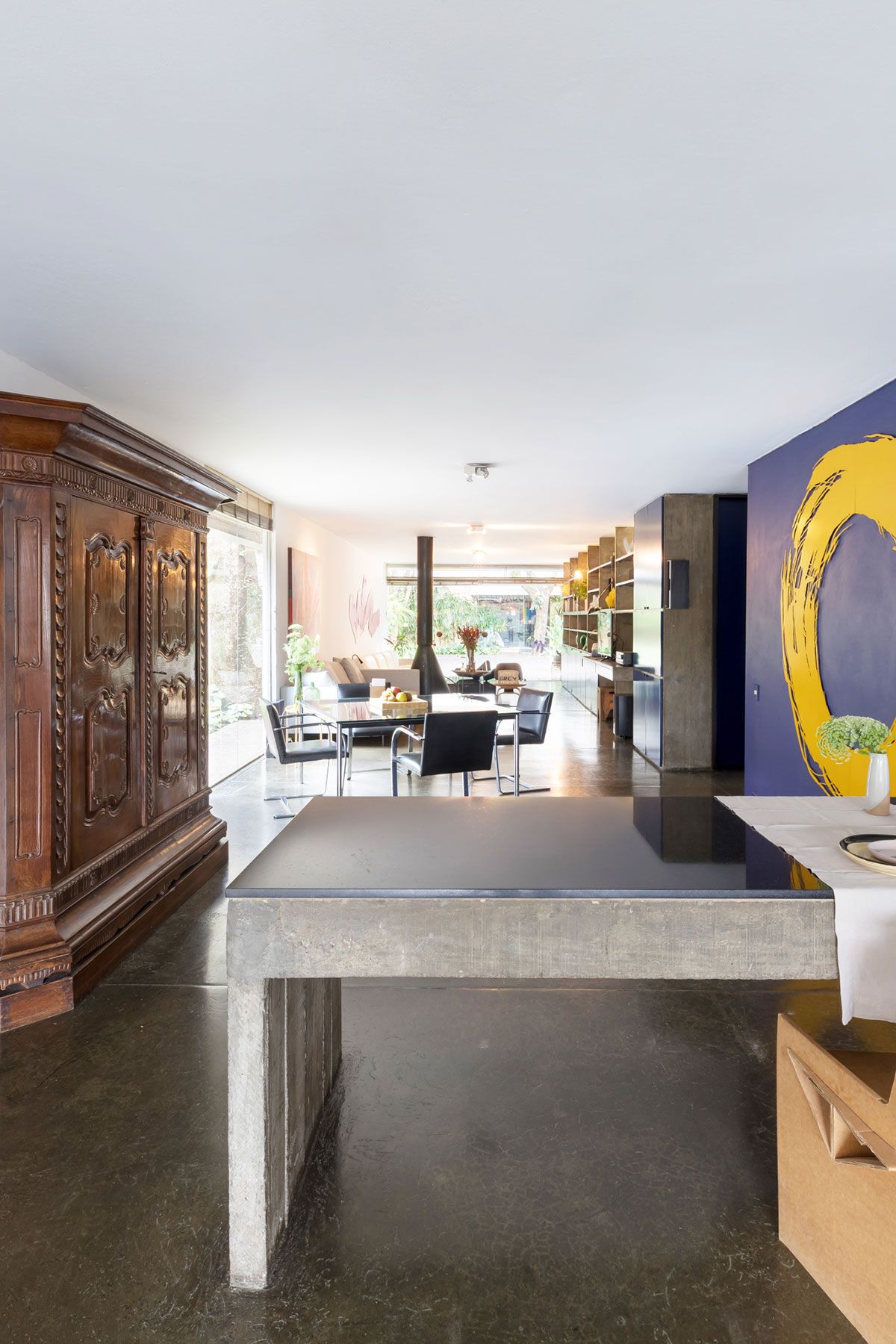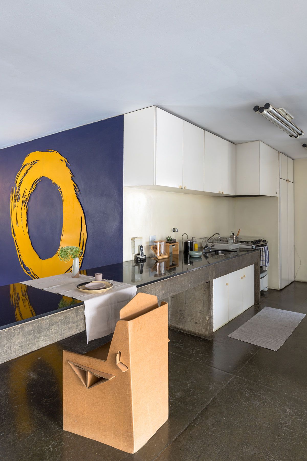 Apesar de ser um imóvel alugado, os moradores conseguiram dar a ele uma cara particular sem precisar mexer na sua estrutura. Os espaços amplos e as linhas retas serviram como inspiração para a decoração, que se aproxima de uma estética minimalista: poucos, mas significativos, móveis e objetos. Algumas alterações que foram feitas pelo dono da casa permanecem até hoje e foram assumidas no décor. Uma delas foi a instalação das estantes em marcenaria com portas em fórmica azul que se transformaram no ponto focal do living. Outra peça que veio com a casa foi o armário antigo feito em madeira maciça que diverge totalmente do estilo da construção. Inicialmente, a Helena queria tirá-lo da sala, mas o seu tamanho e peso dificultaram a tarefa. No fim, a peça permaneceu no seu lugar e, com o tempo, acabou ganhando o coração da estilista.
